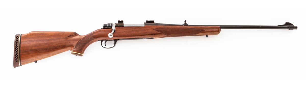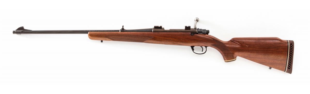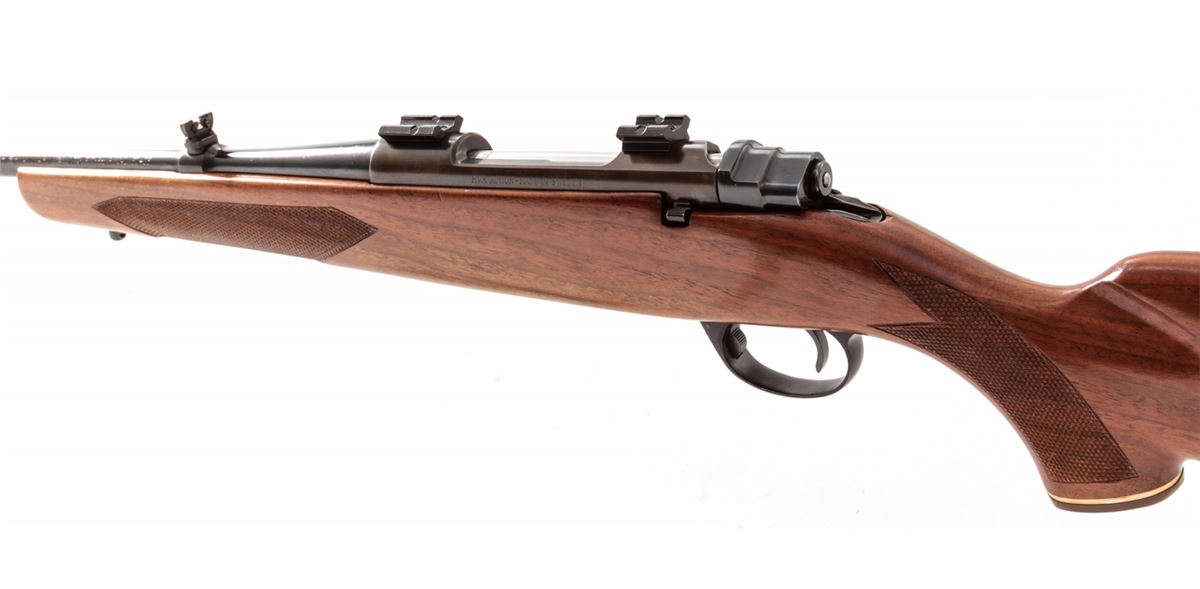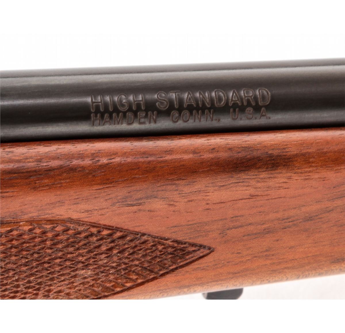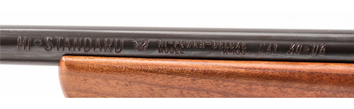 Hi-Standard Hi-Power Deluxe Bolt Action Rifle, with action made by Husqvarna, #21990, .30-06 cal., 22'' barrel, blue finish, bright bolt, checkered pistol-grip walnut stock, with Weaver scope mounts. Condition is fine. Barrel retains approx. 95%+ original blue. Action has toned a gray/blue. Checkers are crisp, stock with only light bruises. Action is crisp, bore is bright. Est.: $250-$450. (C&R)