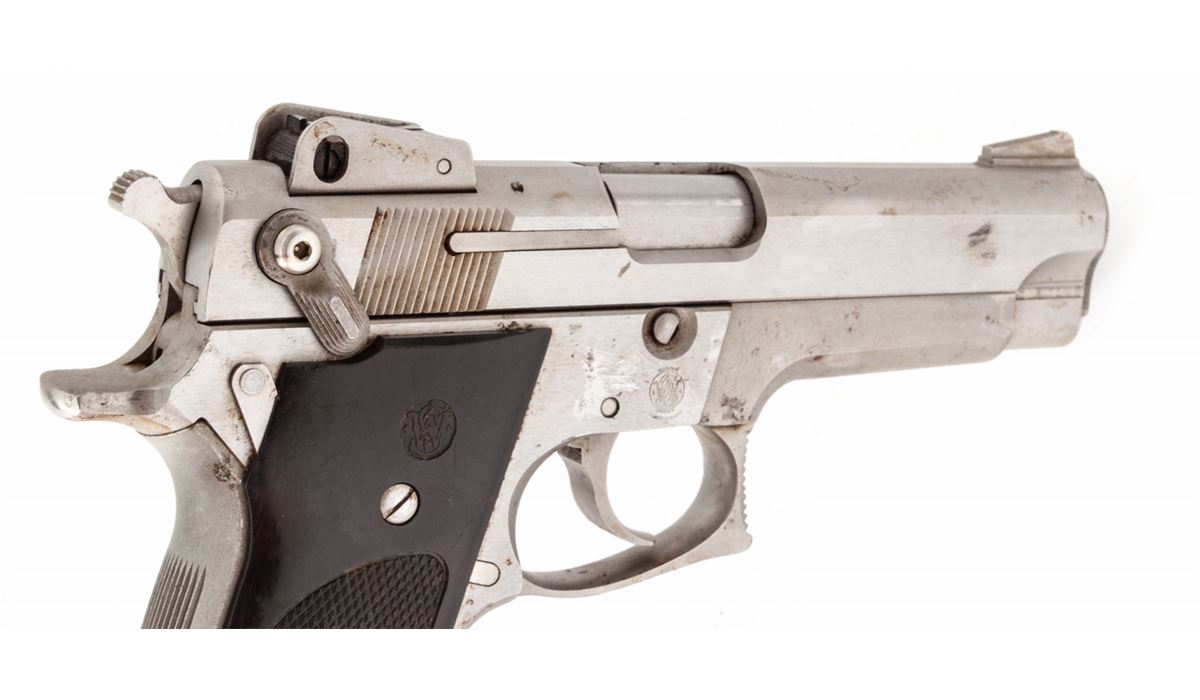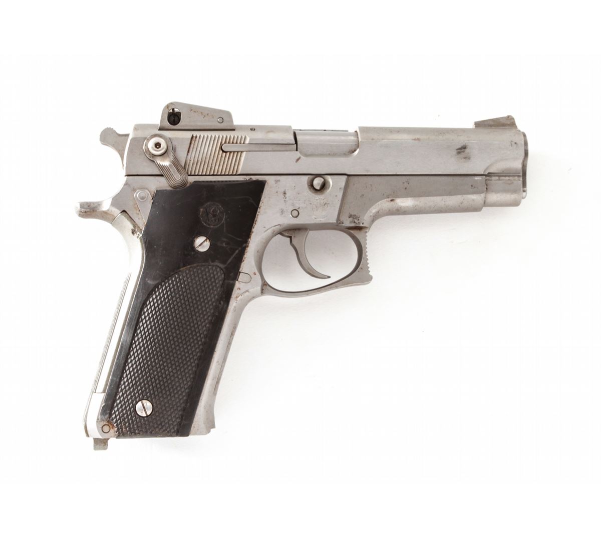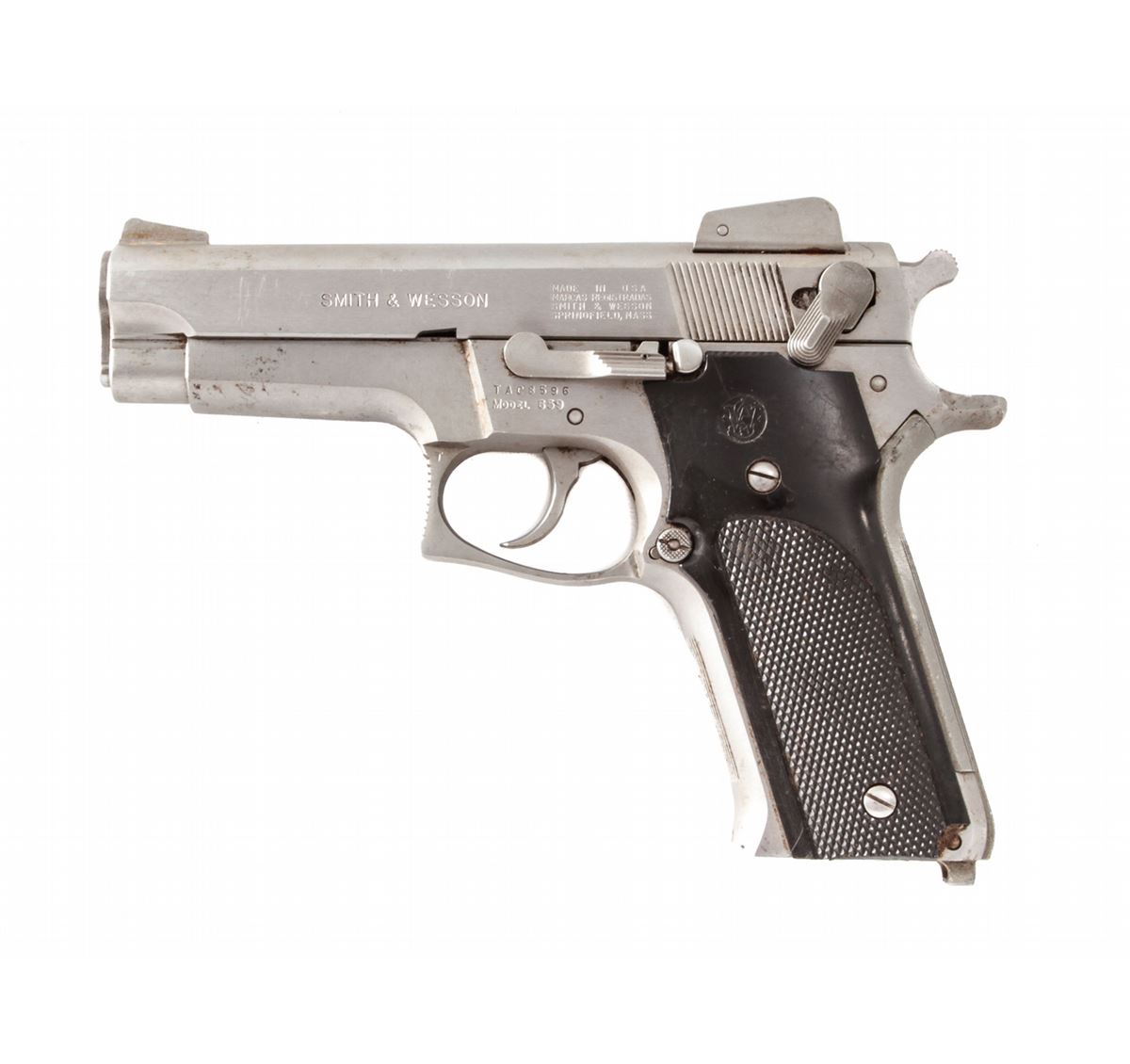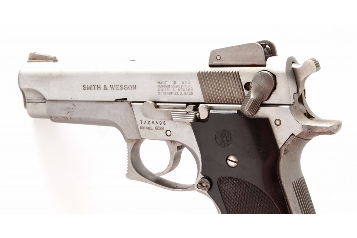 Smith & Wesson Model 659 Semi-Automatic Pistol, #TAC8596, 9mm, 4'' barrel, stainless steel, checkered black plastic grips. No mag. Condition is very good with light to moderate scuffs and scratches to metal surfaces and grips. Action is crisp, bore is fine. Est.: $400-$600. (Modern/PPT)