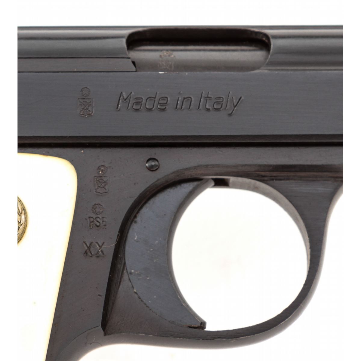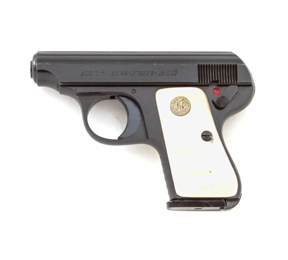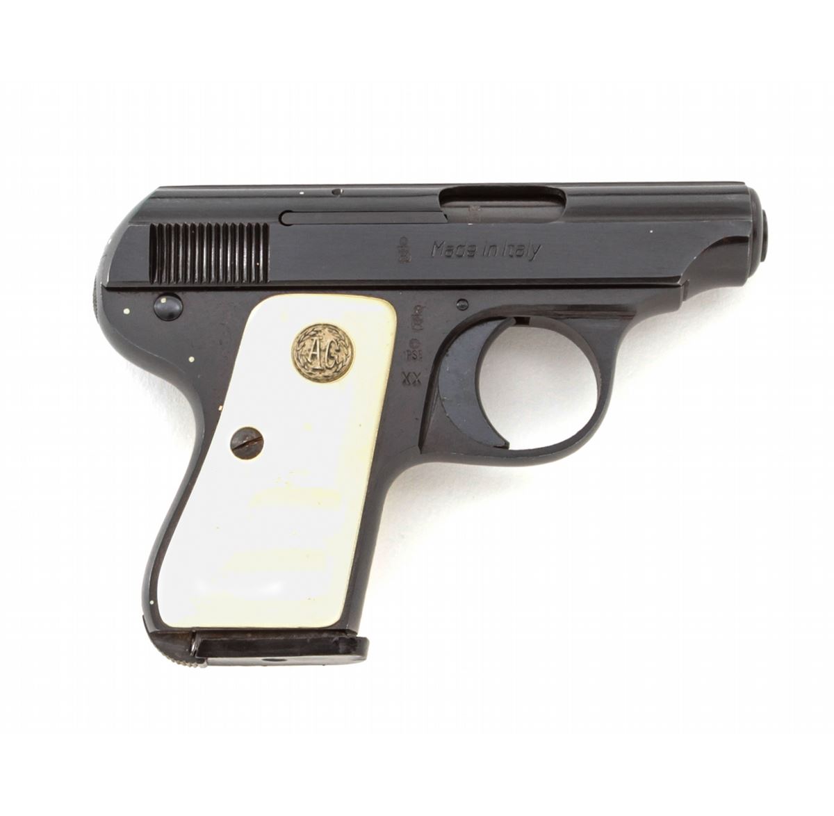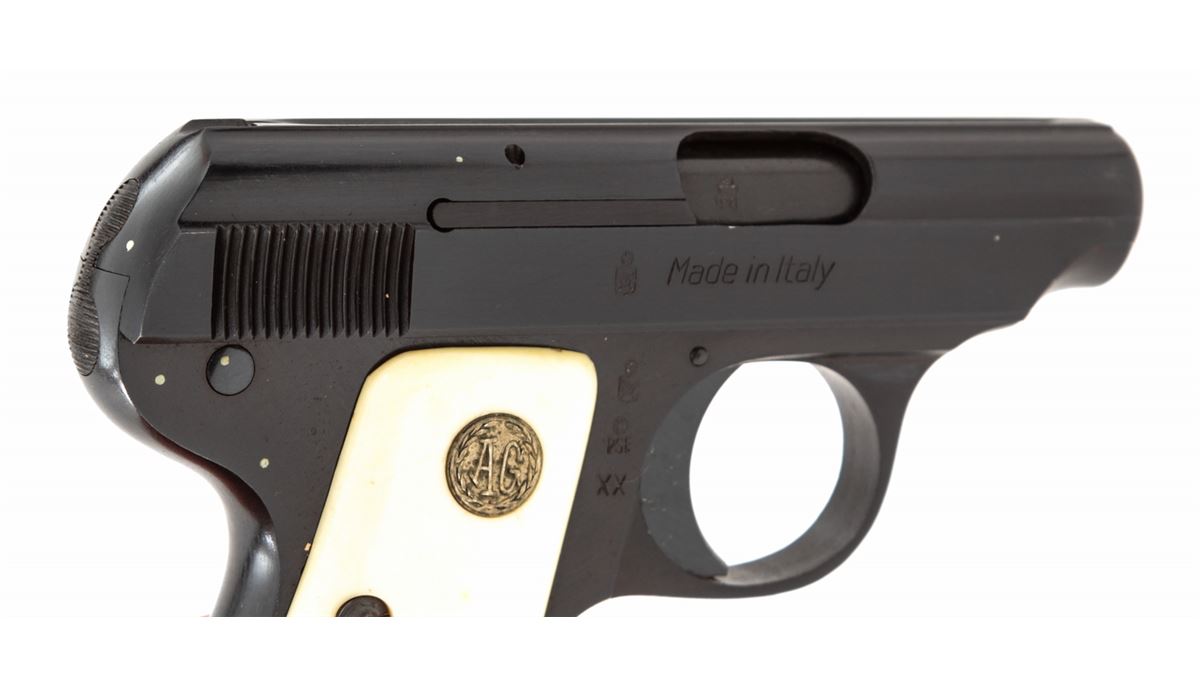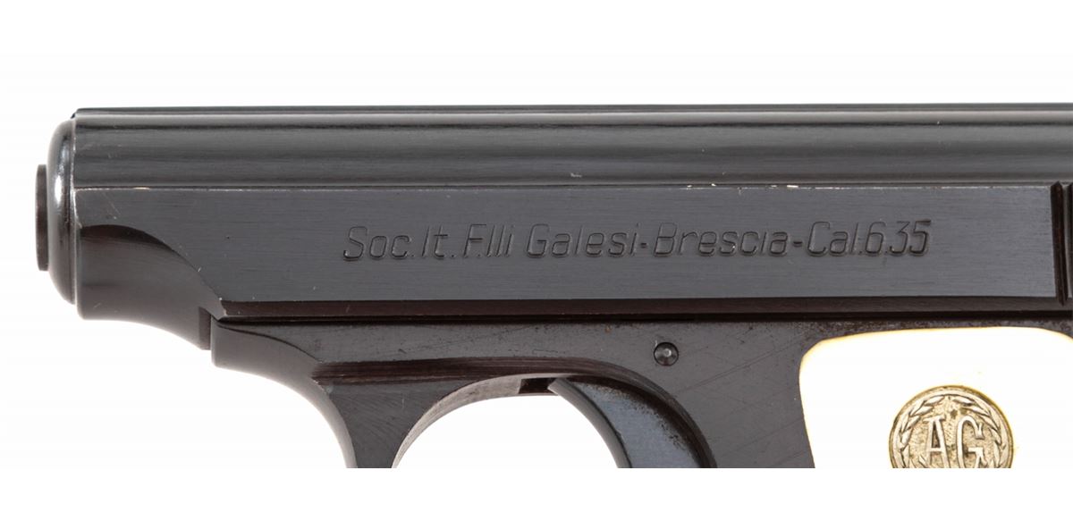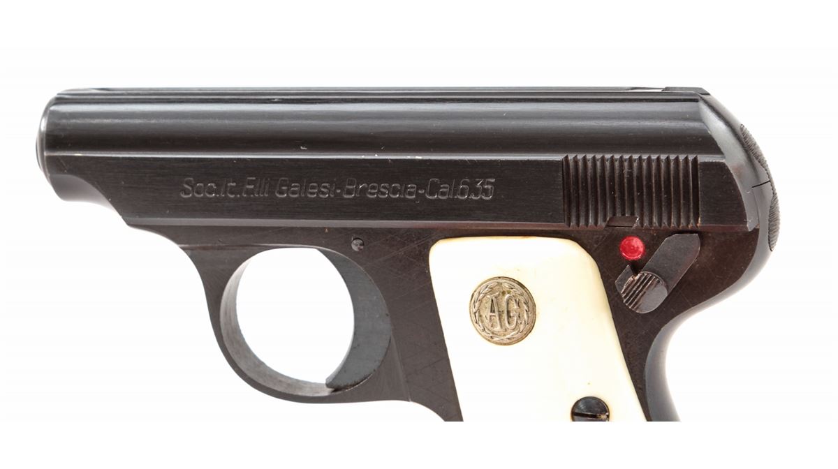 Galesi Semi-Automatic Pistol, #388777, .25 Auto cal., 2-1/4'' barrel, blue finish, faux ivory grips with ''AG'' medallions. Condition is excellent showing just light marks from handling. Est.: $125-$250. (C&R/PPT)