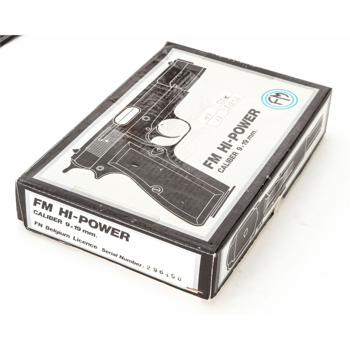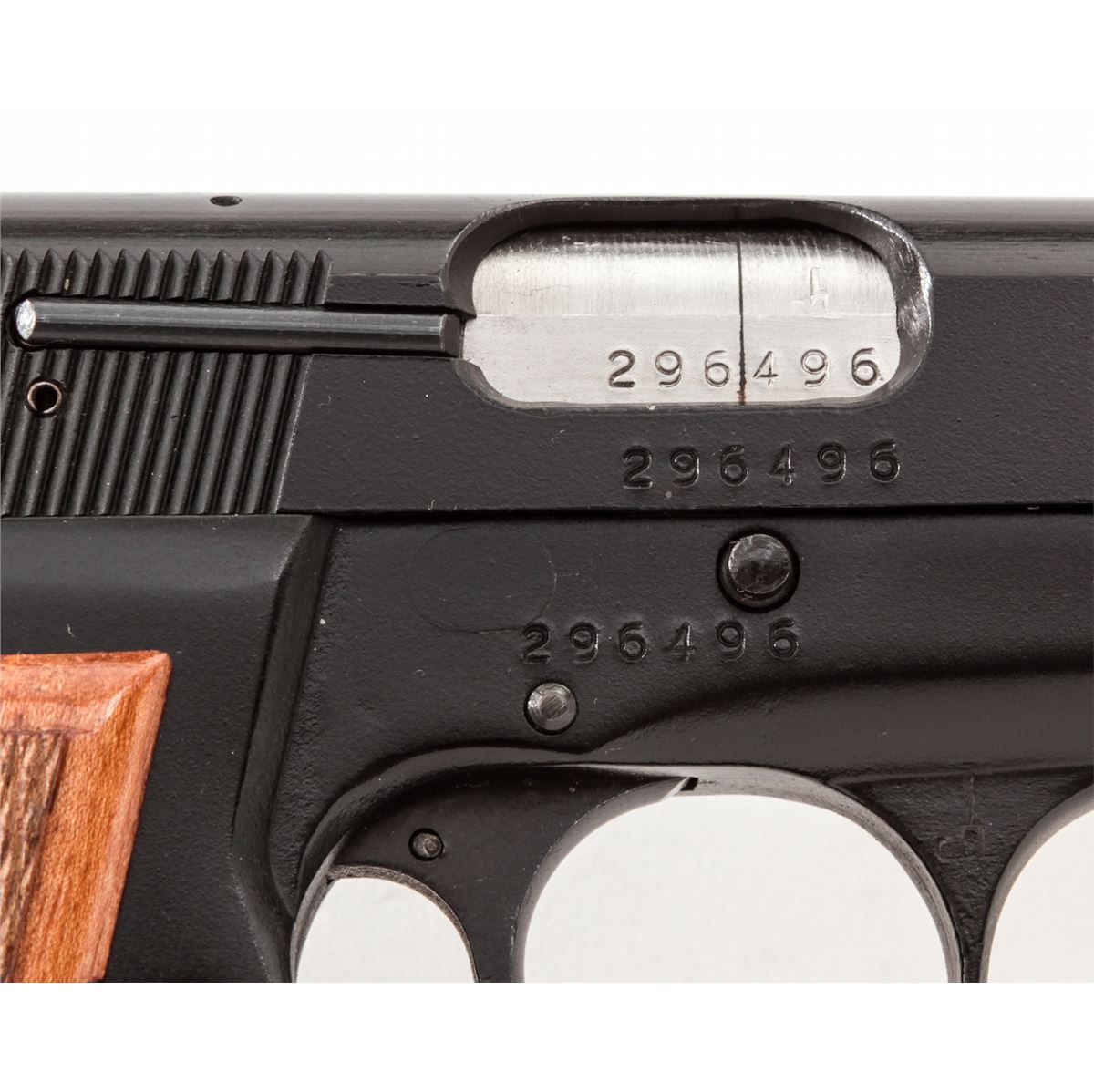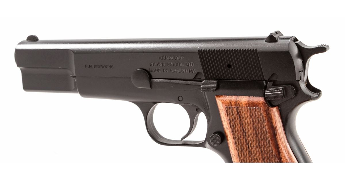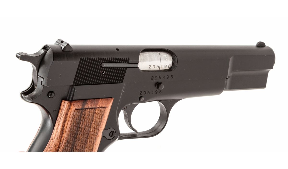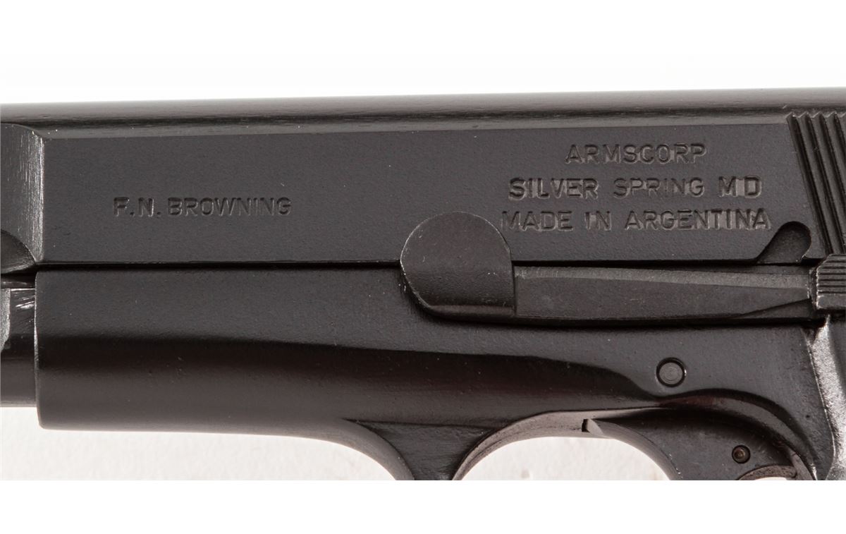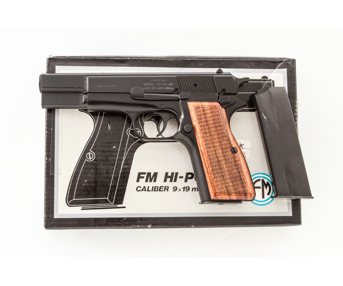 FM Armscor High-Power Semi-Automatic Pistol, #296496, 9mm, 4-3/4'' barrel, matte finish, checkered hardwood grips, with two (2) high-capacity magazines. Made in Argentina. Condition is excellent, appearing as new, in original box. Est.: $350-$500. (Modern/PPT) (High-cap mags not available to Calif. residents.)
