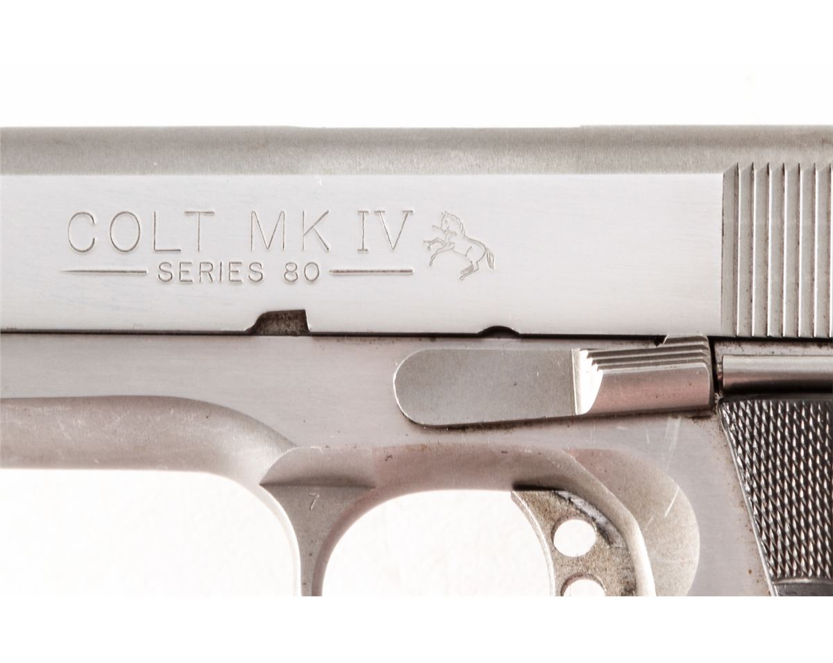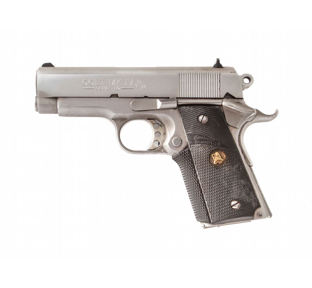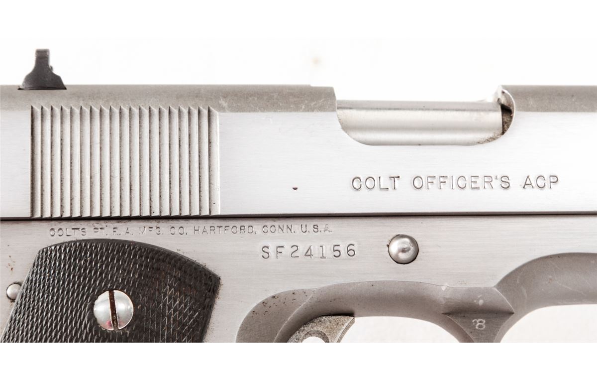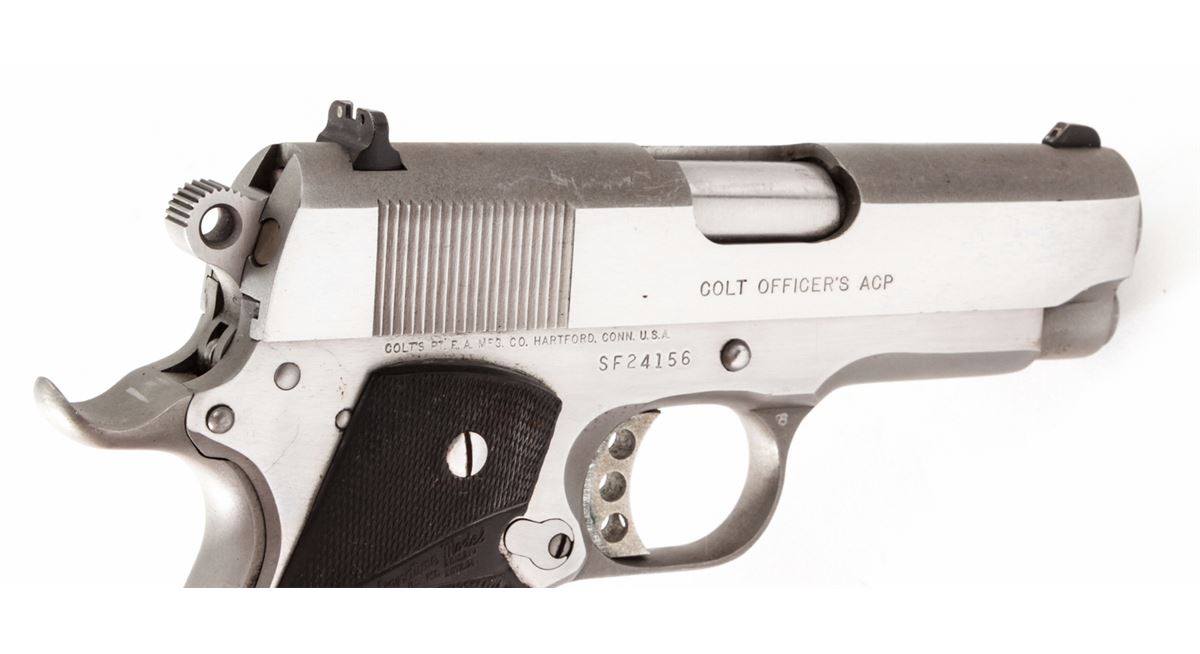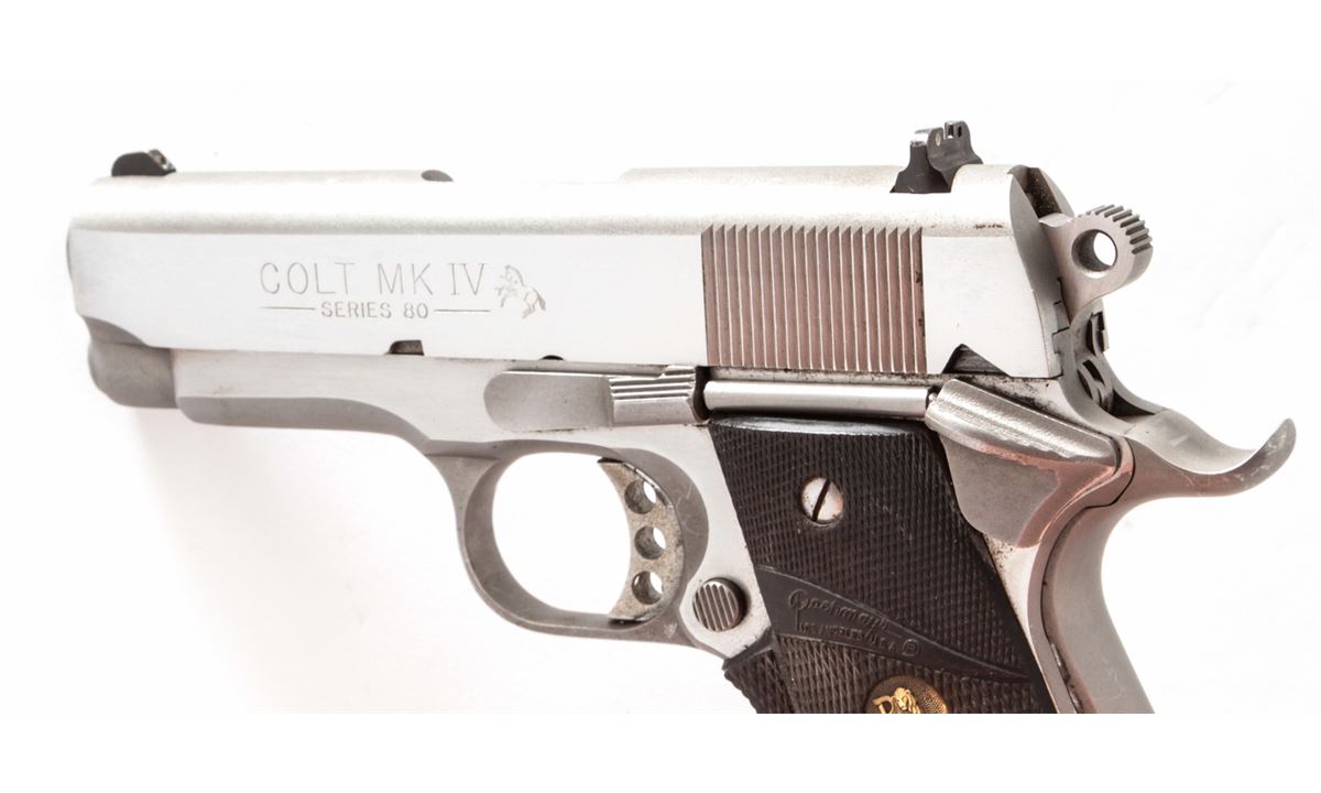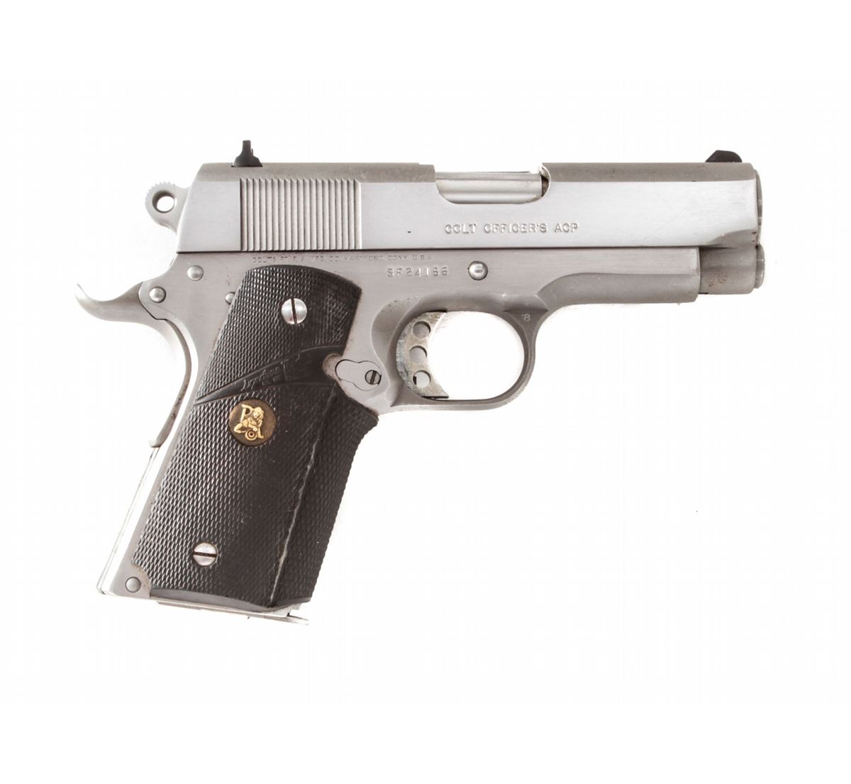 Colt Series 80 Officer's Model Semi-Automatic Pistol, #SF24156, .45 ACP cal., 3-3/4'' barrel, stainless steel, Pachmayr grips, with one magazine. Condition is very good showing light to moderate scuffs and scratches overall stainless. Grips with some wear. Good action and bright bore. Est.: $600-$800. (Modern/PPT)