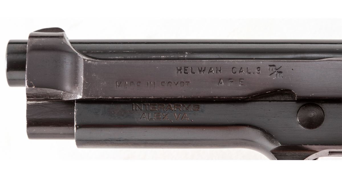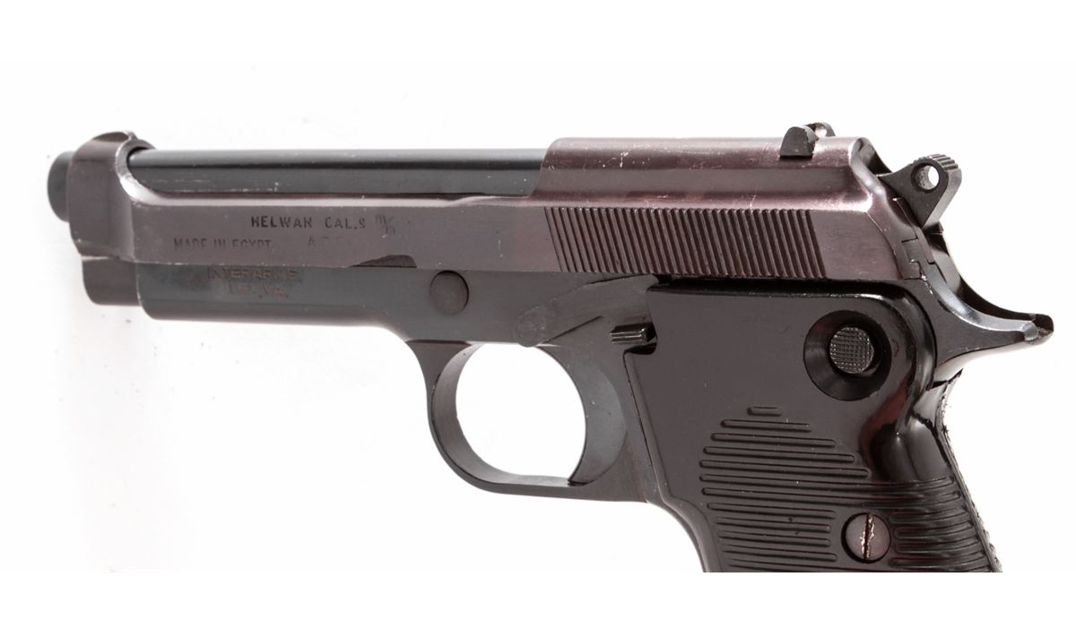Egyptian Helwan Semi-Automatic Pistol, marked in both Arabic and English ''As Imported by Interarms'', #1039899, 9mm, 4-1/2'' barrel, blue finish, black plastic grips, with one magazine. Condition is excellent with crisp action, grips and bore. Est.: $200-$400. (C&R)