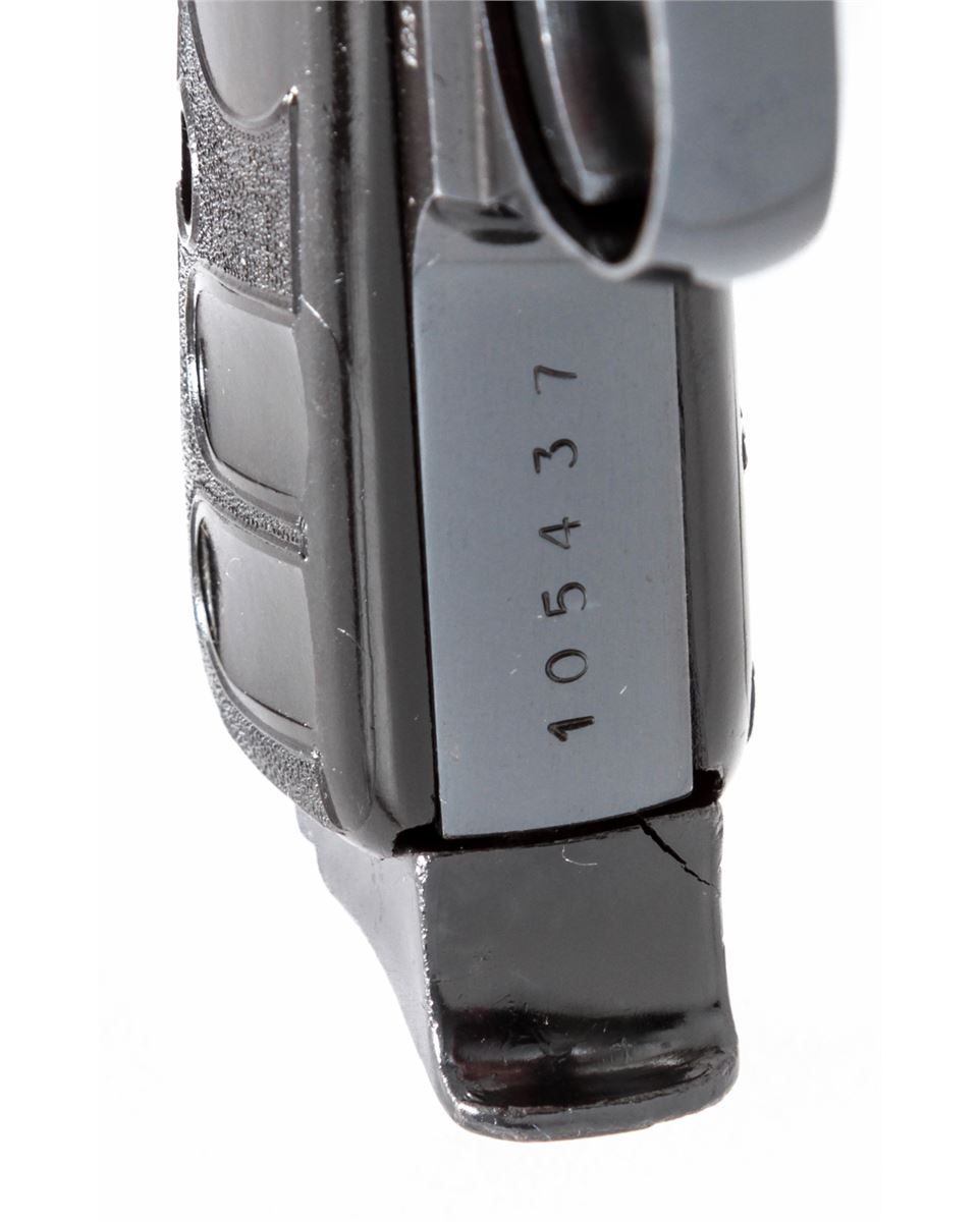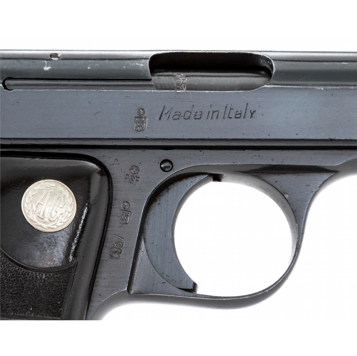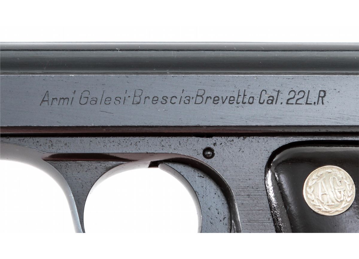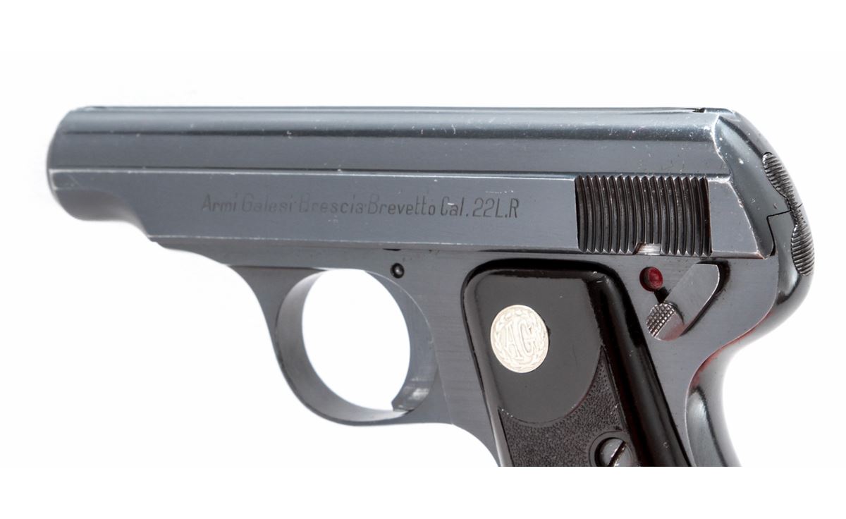 Galesi Semi-Automatic Pistol, #105437, .22 LR cal., 3'' barrel, blue finish, contoured black plastic grips with ''AG'' medallions, with one finger-rest magazine. Mfg'd 1957. Condition is near excellent retaining approx. 97% blue. Crisp grips and action, fine bore. Est.: $150-$300. (C&R/PPT)