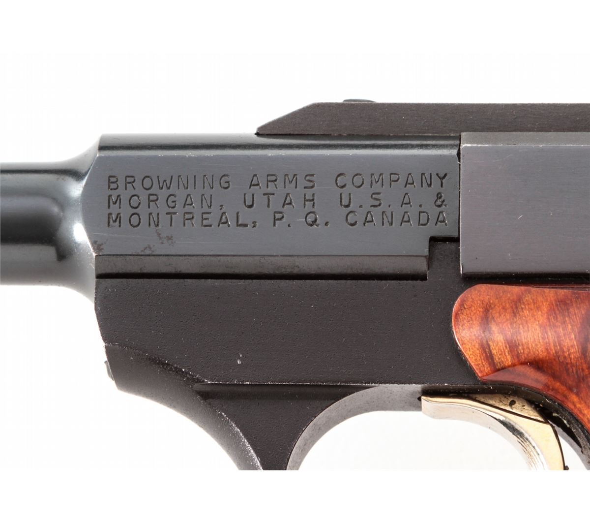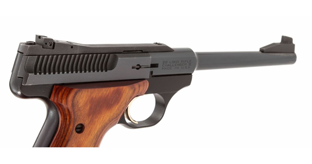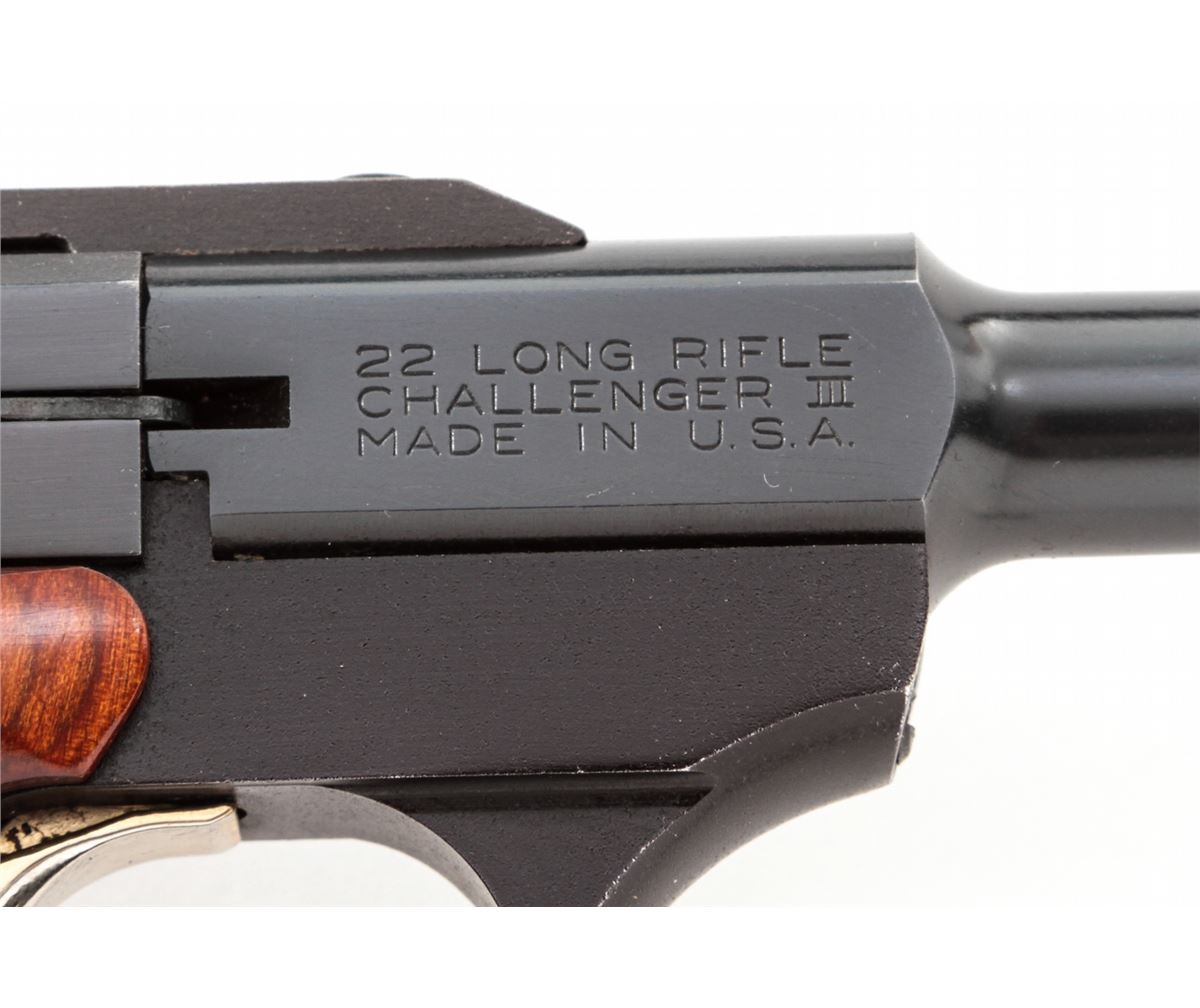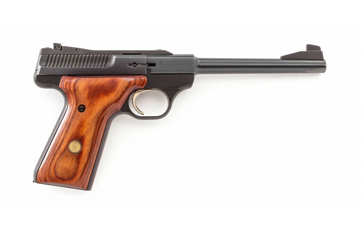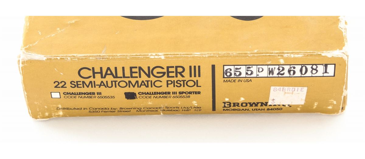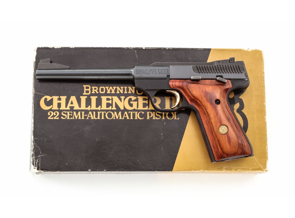 Browning Challenger III Semi-Automatic Pistol, #655PX28287, .22 LR cal., 6-3/4'' barrel, blue finish, laminated hardwood grips, in original box. Made in USA. Condition is near excellent showing light range use as wear to muzzle and light wear to left side of triggerguard. Good action and bore. Est.: $250-$400. (Modern/PPT)