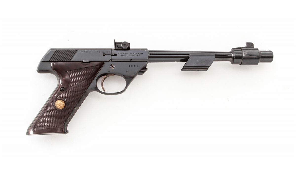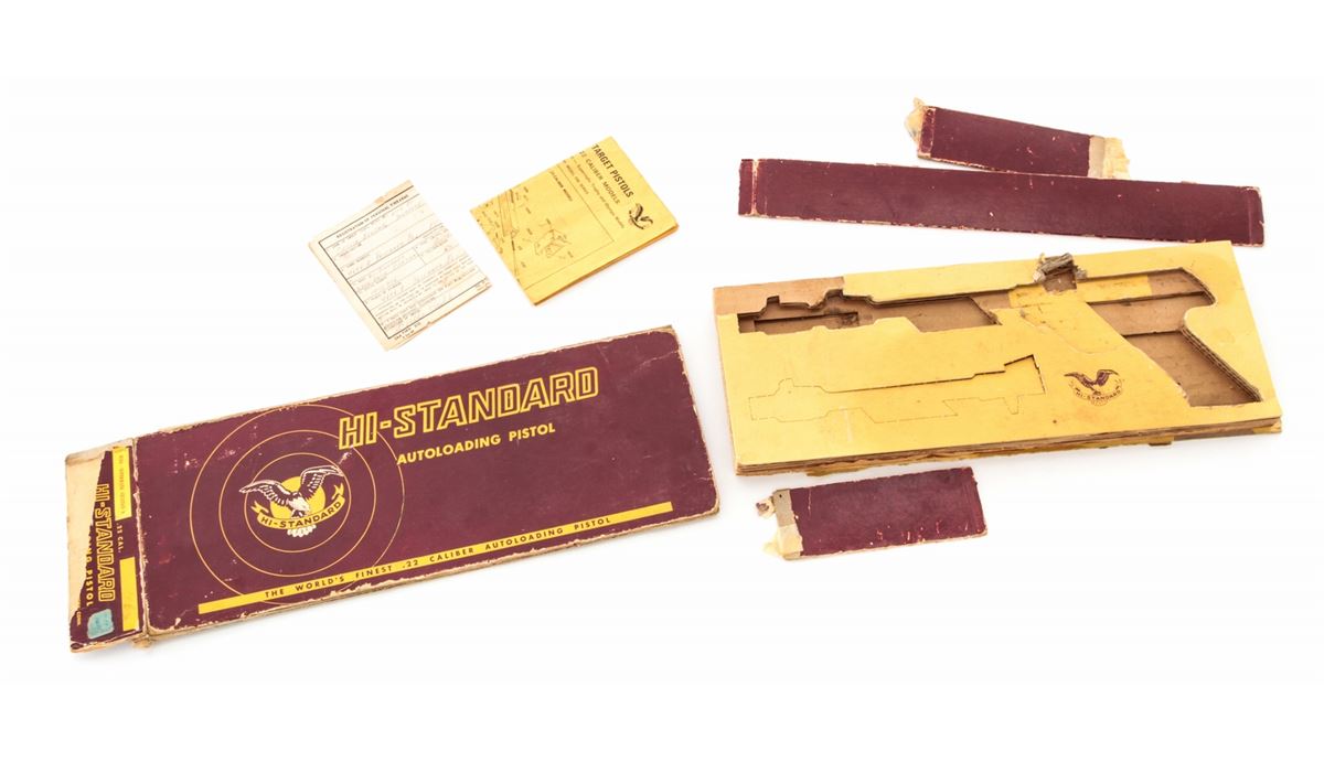 Hi-Standard Supermatic Citation Semi-Automatic Target Pistol, #1012916, .22 LR cal., 8'' weighted and compensated barrel, blue finish, factory brown checkered grips, adjustable rear sight, in what remains of its original box. Condition is excellent showing just light range use. Box has come apart at the seams and most parts, including instructions, appear present. Est.: $500-$750. (C&R)