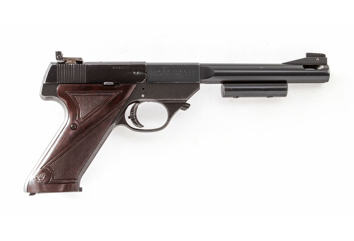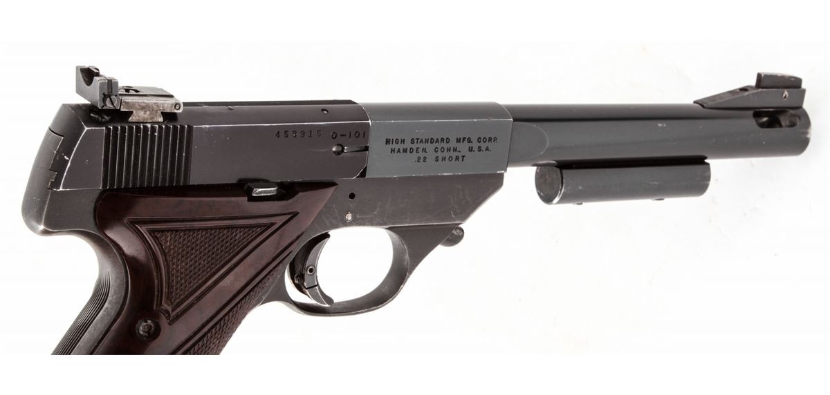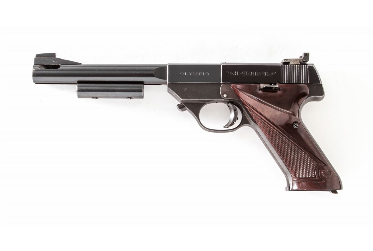 Hi-Standard Olympic Semi-Automatic Target Pistol, #458915, .22 Short cal., 6-3/4'' weighted and compensated barrel, blue finish, brown checkered plastic grips, one magazine, with micro front and rear sights and added triggershoe. Condition is fine with moderate range use, retaining approx. 92% thinning blue. Good grips and action, bright bore. Est.: $225-$450. (C&R)