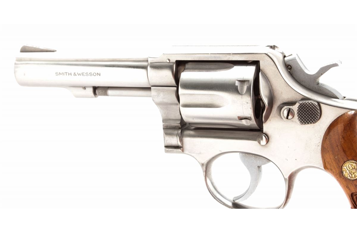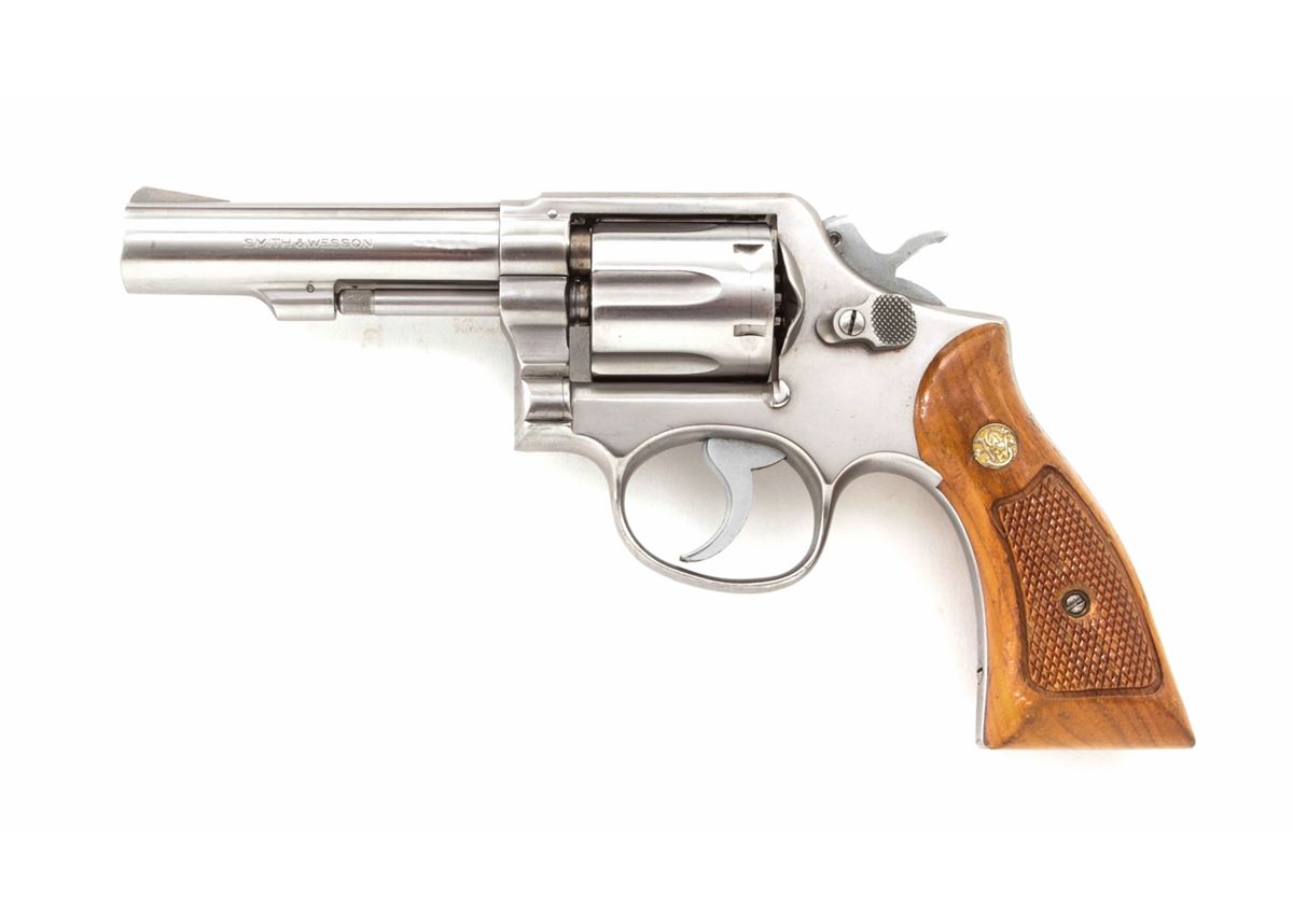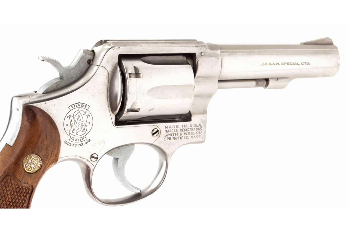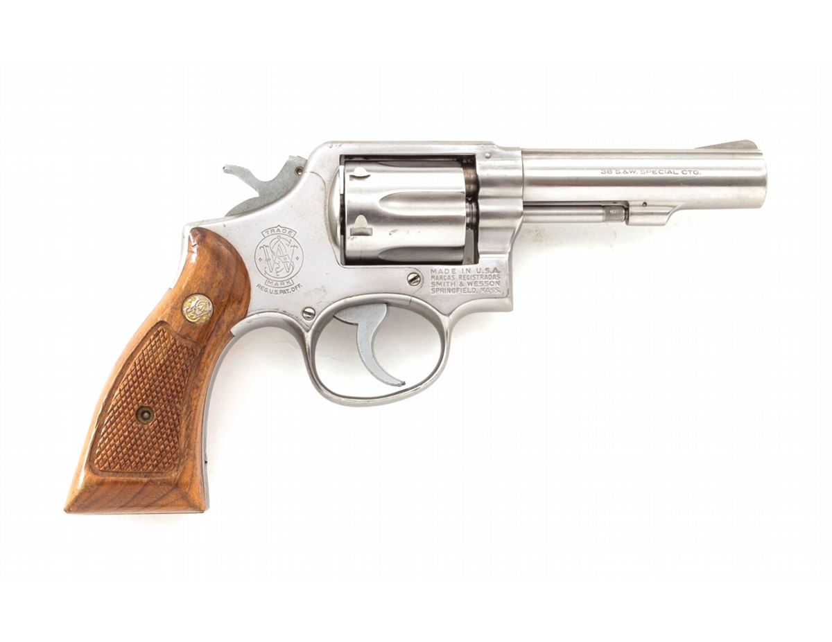 Smith & Wesson Model 64-1 Double Action Revolver, #1D3717, .38 Spec. cal., 4'' barrel, stainless steel, factory checkered hardwood grips, with pre-1981 pinned barrel. Condition is fine showing light range use. Left side of barrel near muzzle with minor indentations that do not affect the bore. Grips with mild to just moderate flattening. Good action, bright bore. Est.: $250-$400. (Modern) (Not available to Calif. residents.)