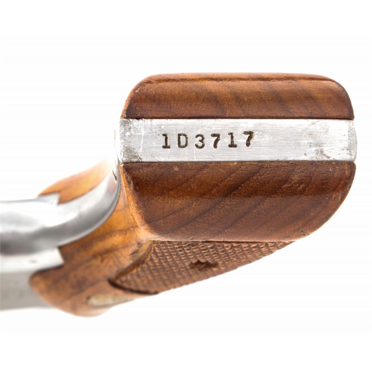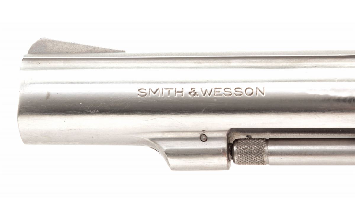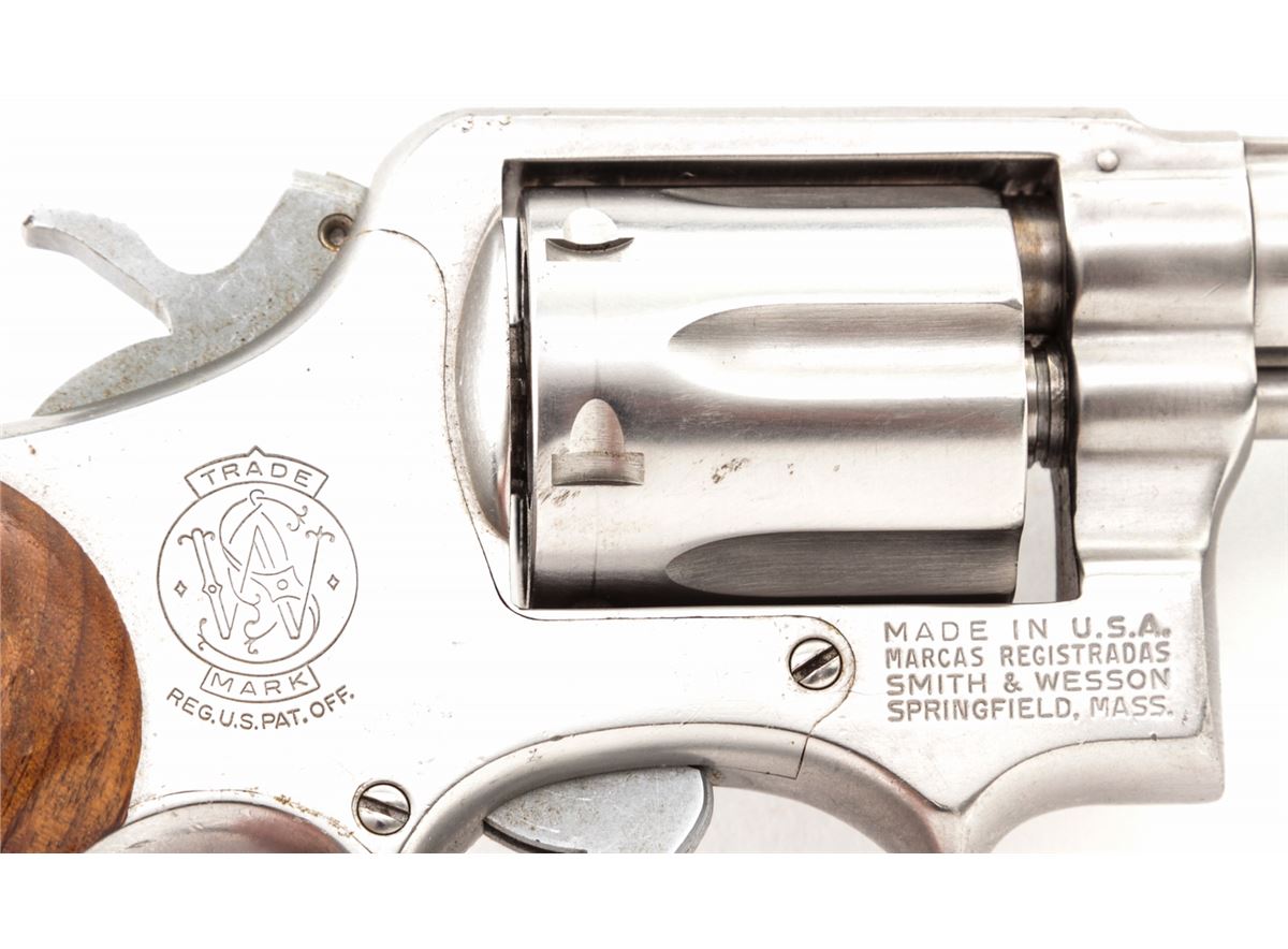 Smith & Wesson Model 64-1 Double Action Revolver, #1D3717, .38 Spec. cal., 4'' barrel, stainless steel, factory checkered hardwood grips, with pre-1981 pinned barrel. Condition is fine showing light range use. Left side of barrel near muzzle with minor indentations that do not affect the bore. Grips with mild to just moderate flattening. Good action, bright bore. Est.: $250-$400. (Modern) (Not available to Calif. residents.)