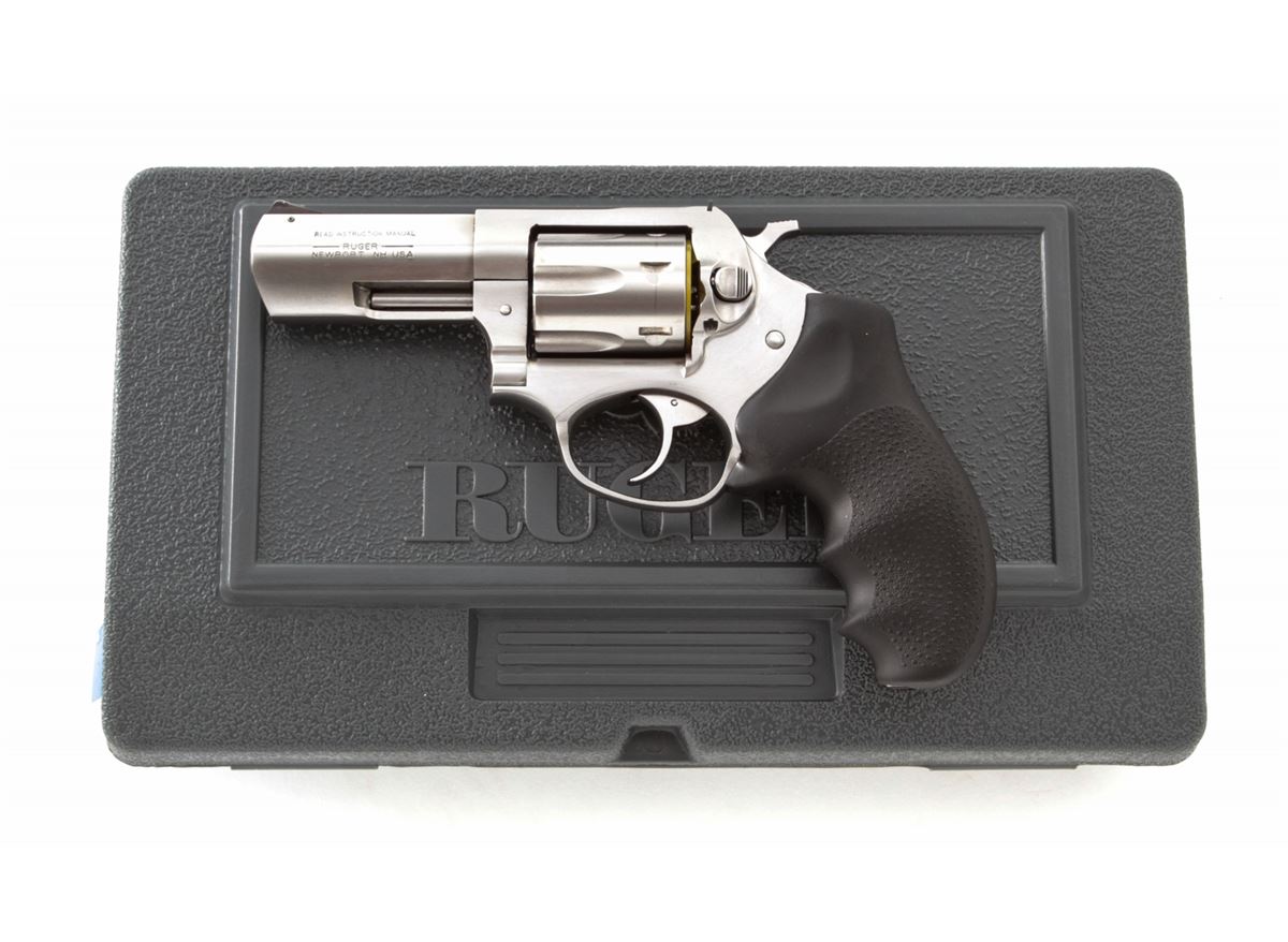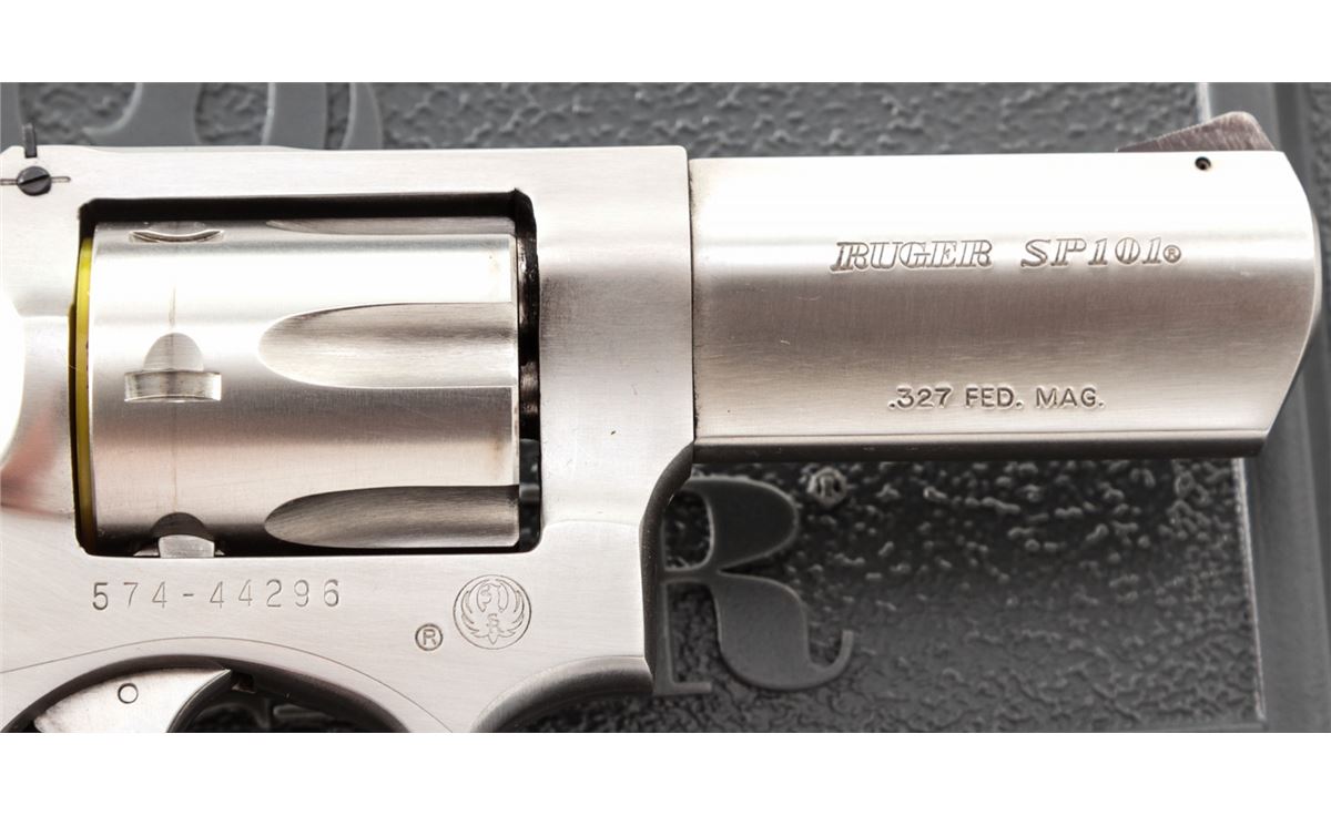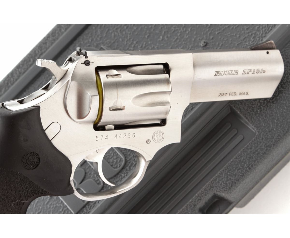 Ruger Model SP101 Double Action Revolver, #574-44296, .327 Fed. mag. cal., 3'' barrel, stainless steel, Hogue rubber grips, in original hard case with instructions. Revolver also fires .32 S&W, .32 S&W Long, and .32 H&R mag. Condition is excellent showing little use. Est.: $300-$450. (Modern/PPT)