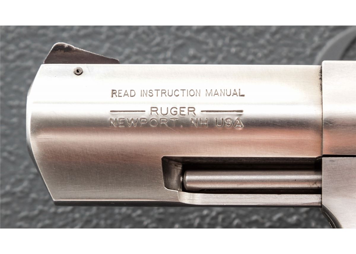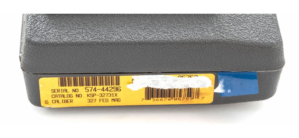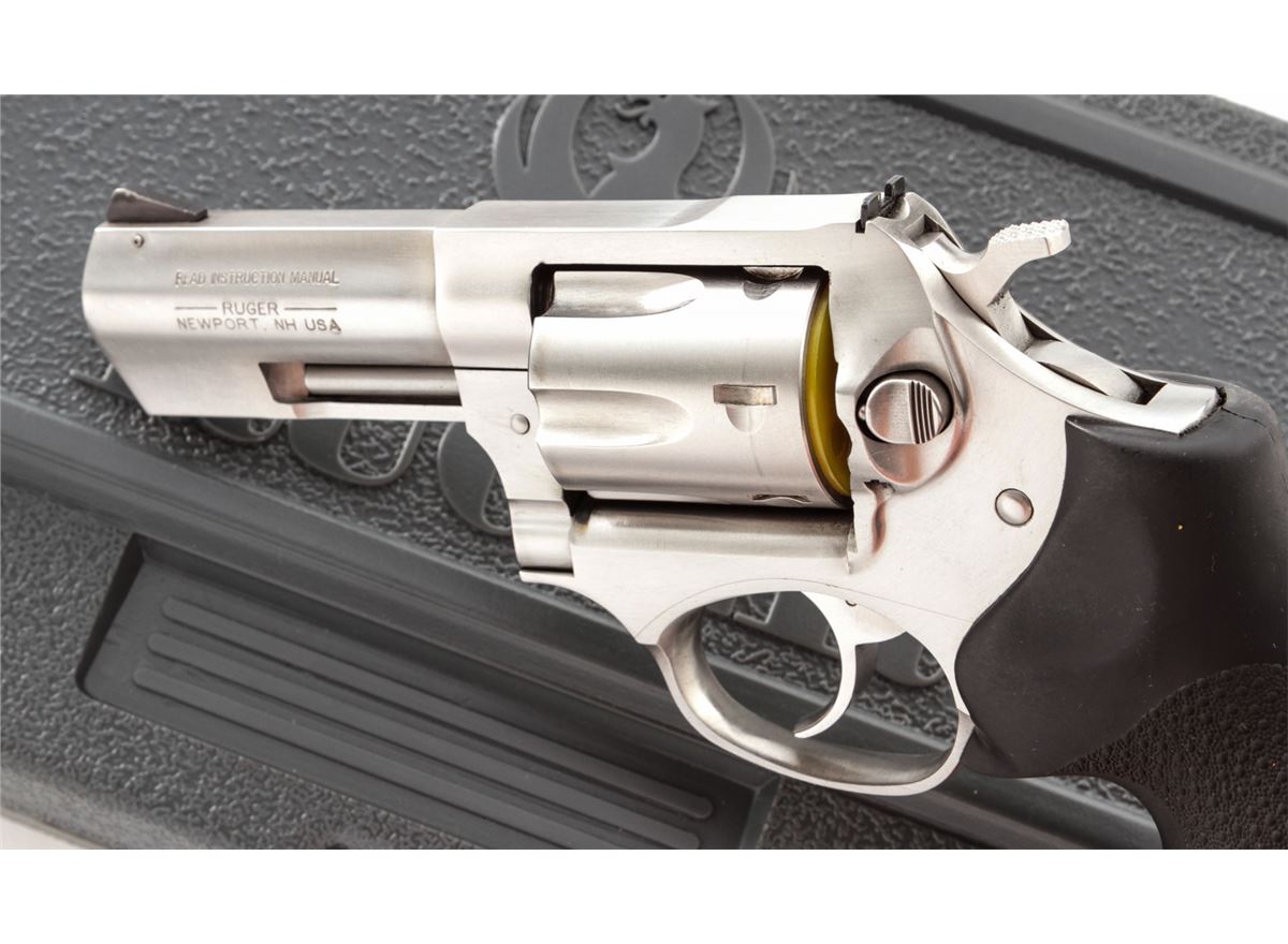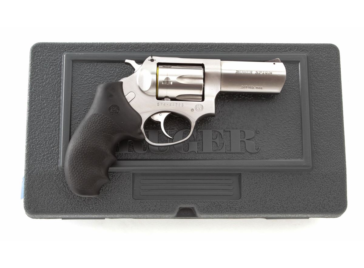 Ruger Model SP101 Double Action Revolver, #574-44296, .327 Fed. mag. cal., 3'' barrel, stainless steel, Hogue rubber grips, in original hard case with instructions. Revolver also fires .32 S&W, .32 S&W Long, and .32 H&R mag. Condition is excellent showing little use. Est.: $300-$450. (Modern/PPT)