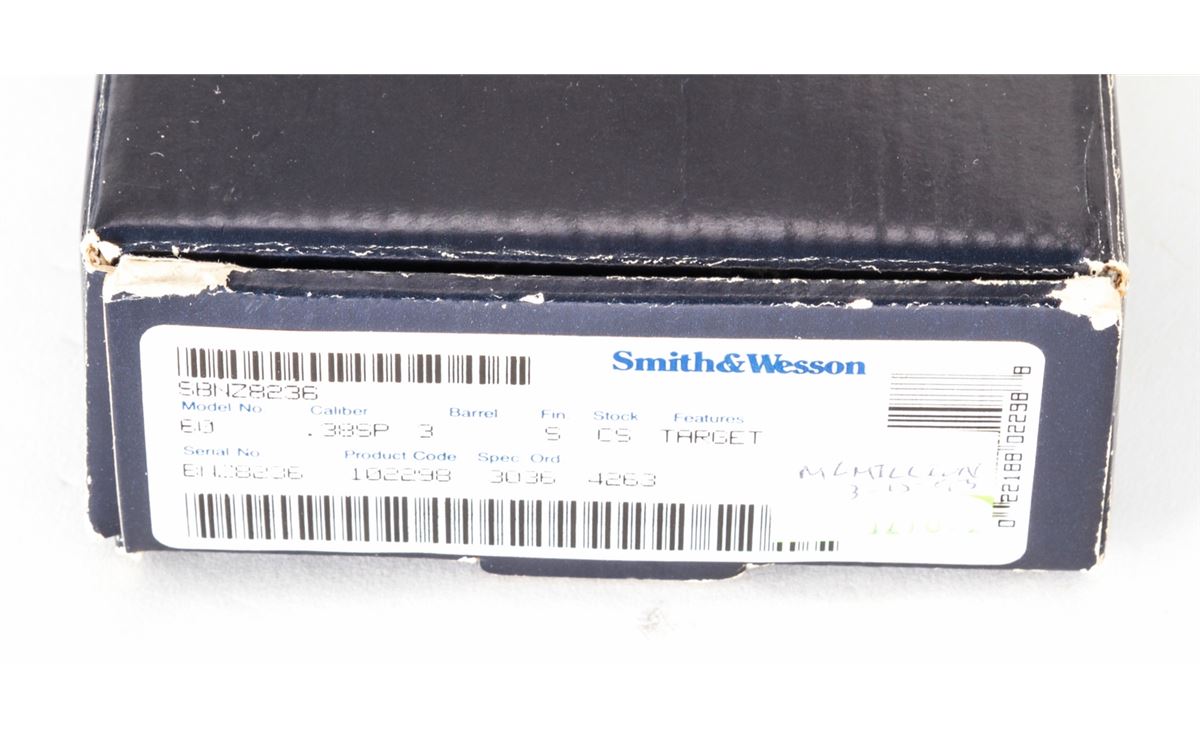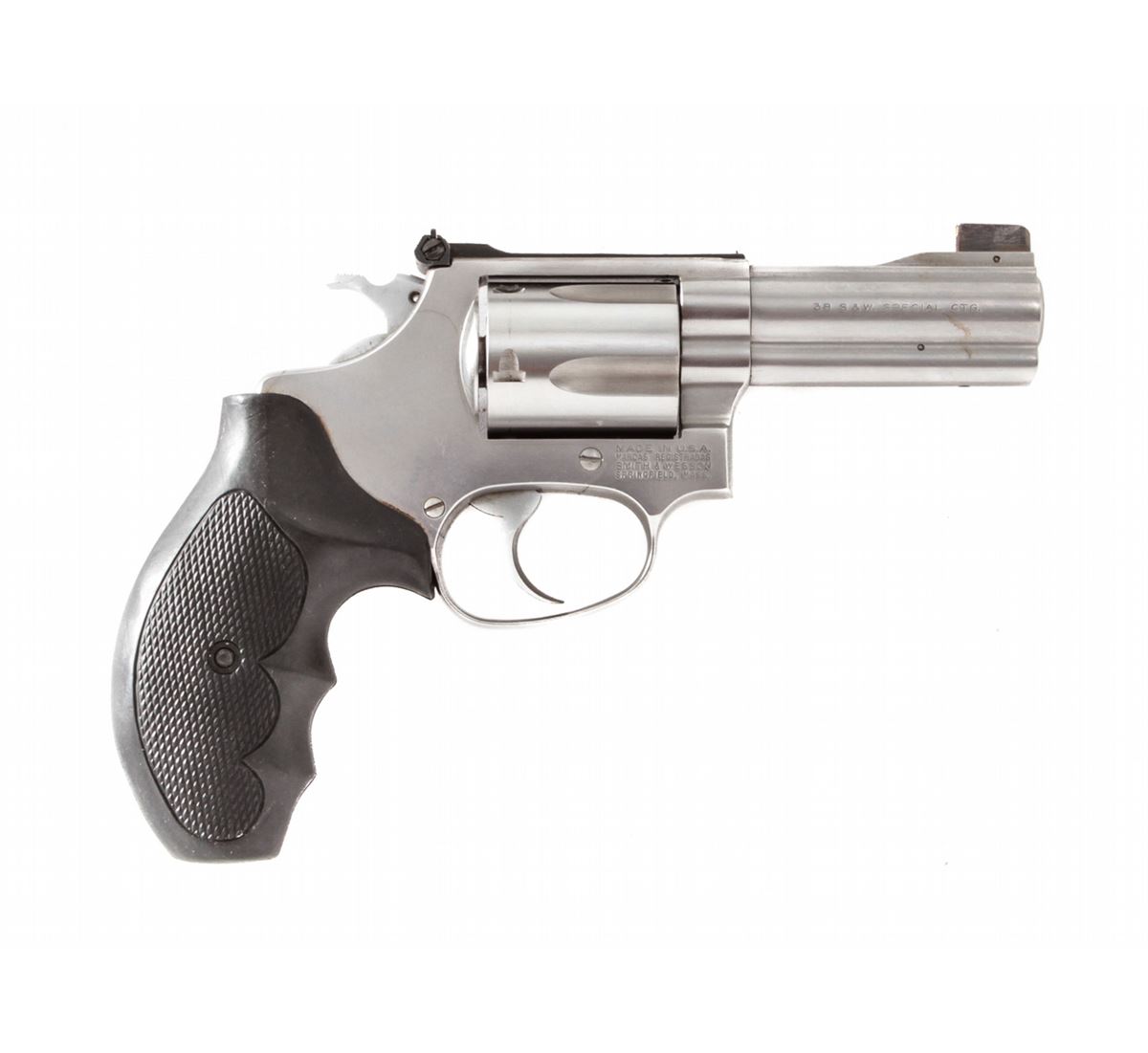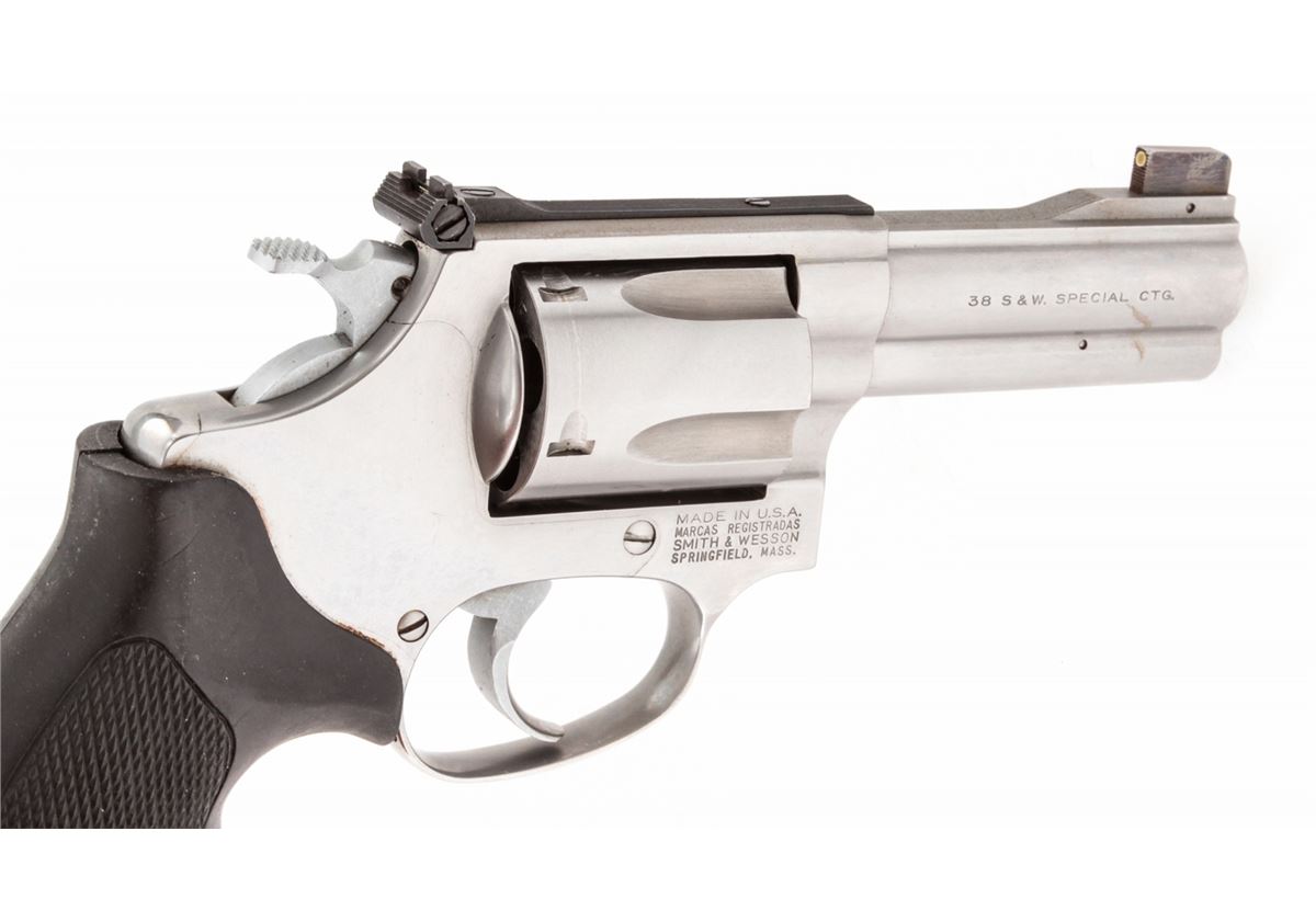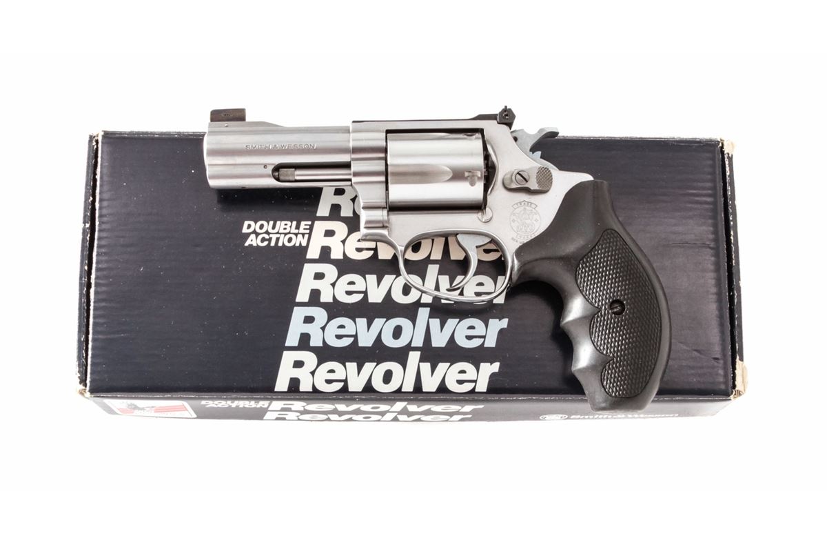 Smith & Wesson Model 60-4 Double Action Revolver, #BNZ8236, .38 Spec. cal., 3'' barrel, stainless steel, fingergroove rubber grips, with Trijicon dot and bar adjustable sights, in original box. Dating from the early 1990s. Condition is excellent showing just light range use. Est.: $300-$500. (Modern/PPT)