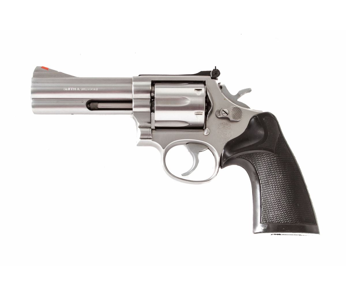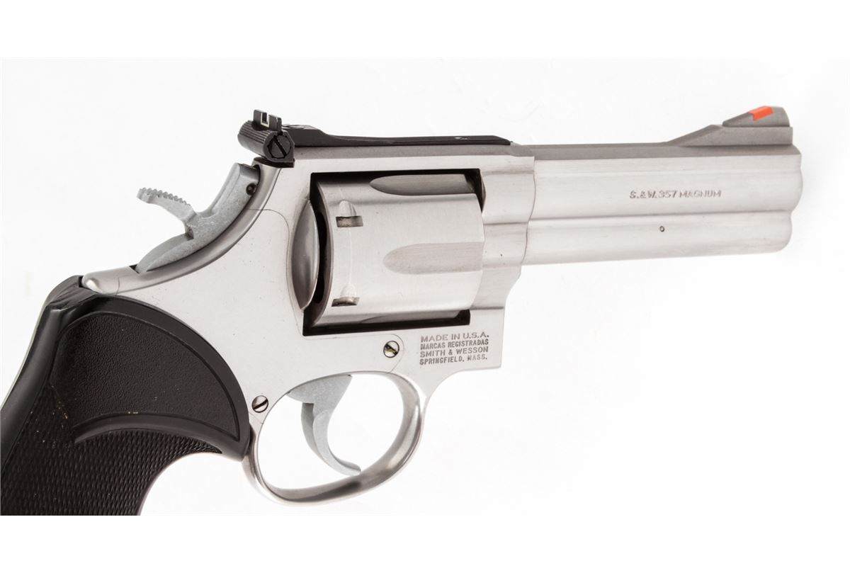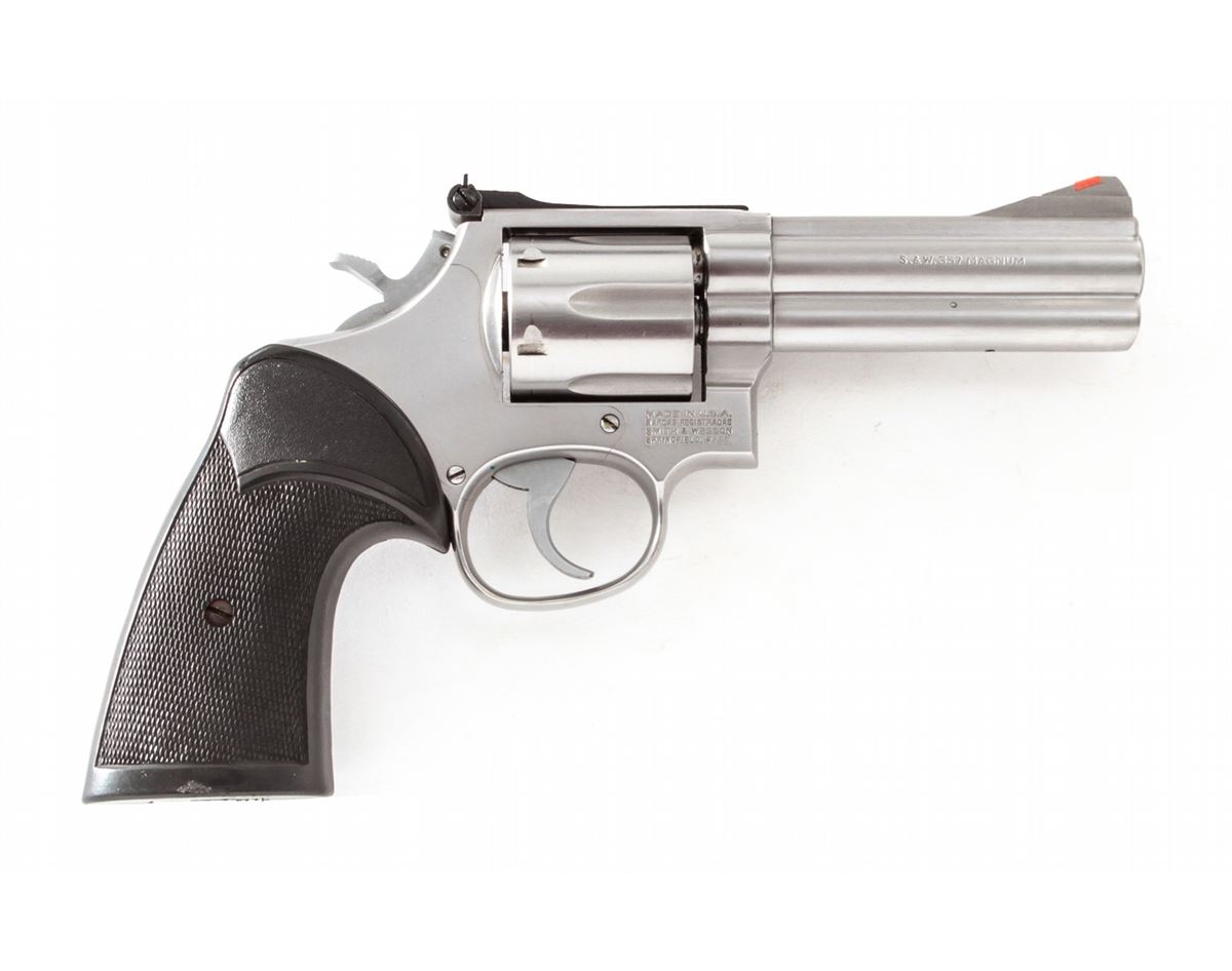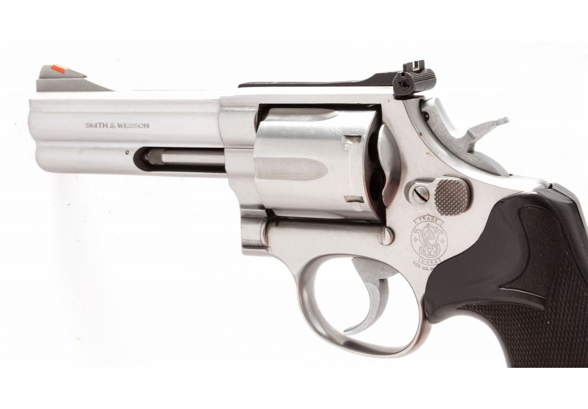 Smith & Wesson Model 686 Double Action Revolver, #ADF2835, .357 mag. cal., 4'' barrel, stainless steel, black Pachmayr grips, with red ramp front sight and white outline rear sight. Condition is excellent showing just light use. Est.: $450-$600. (Modern/PPT)