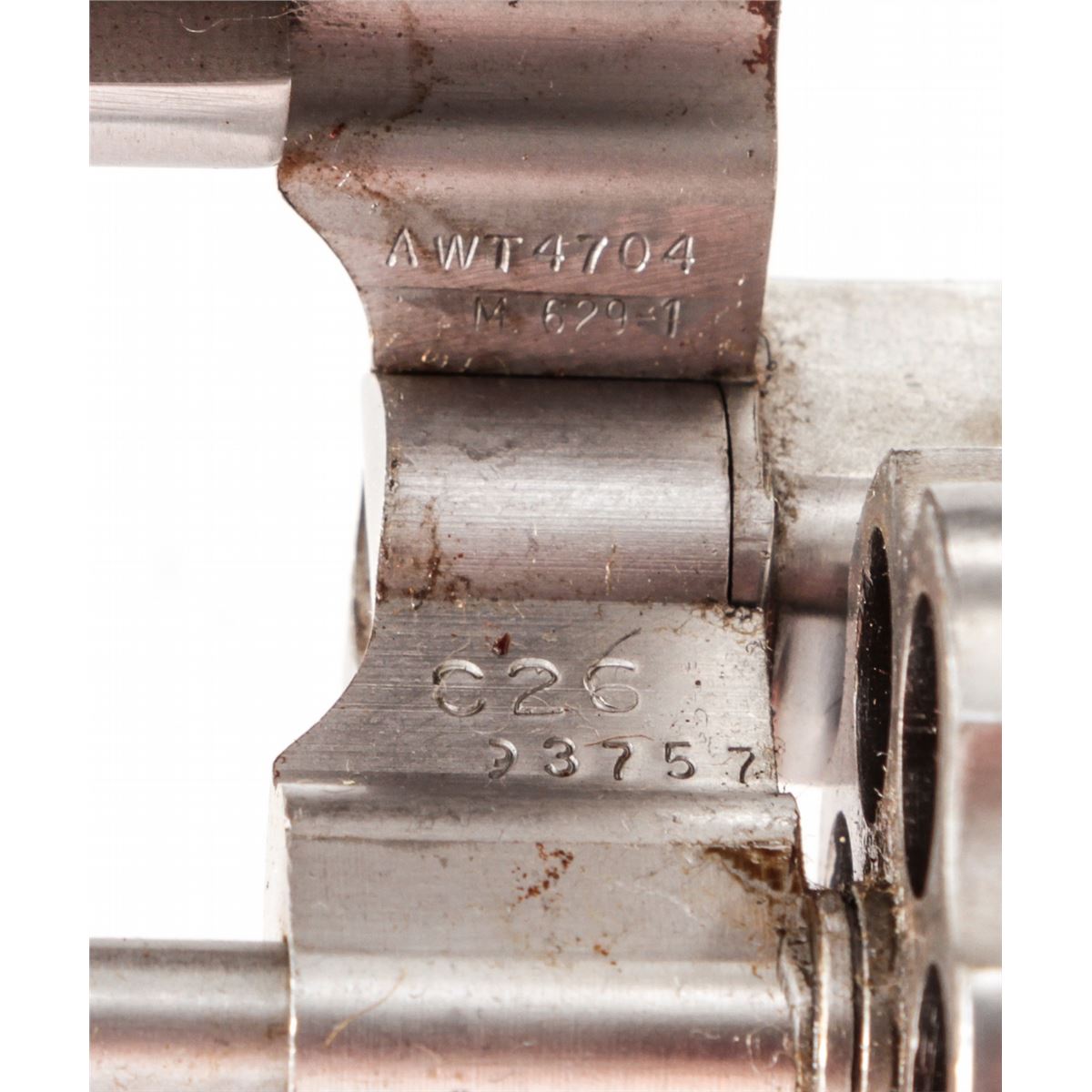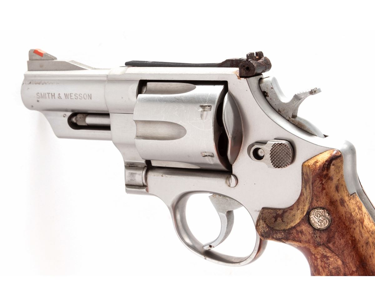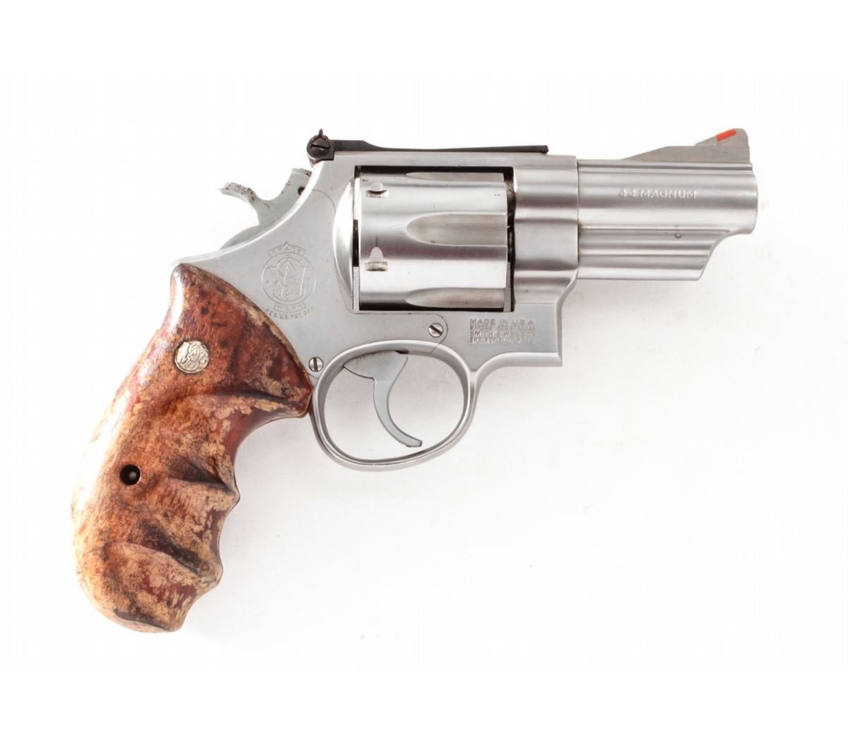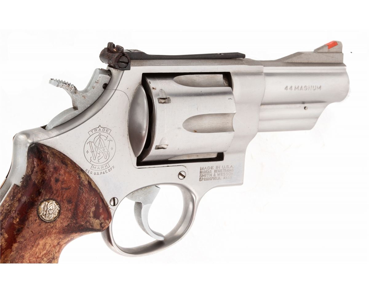 Smith & Wesson Model 629-1 Double Action Revolver, #AWT4704, .44 mag. cal., 3'' barrel, stainless steel, S&W factory wood gripper grips, with red ramp front and white outline rear sights. Condition is fine. Stainless steel surfaces show light marks from handling. Wooden grip with water damage. Cylinder latch screw is missing. Good action, bright bore. Est.: $450-$650. (Modern/PPT)