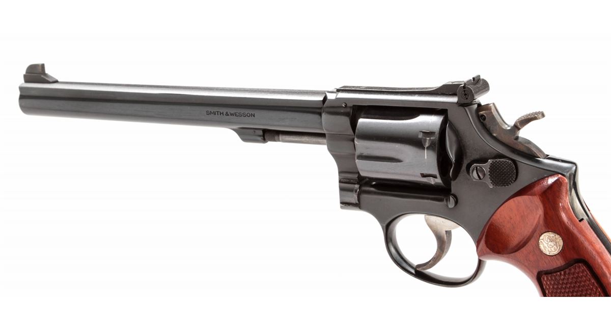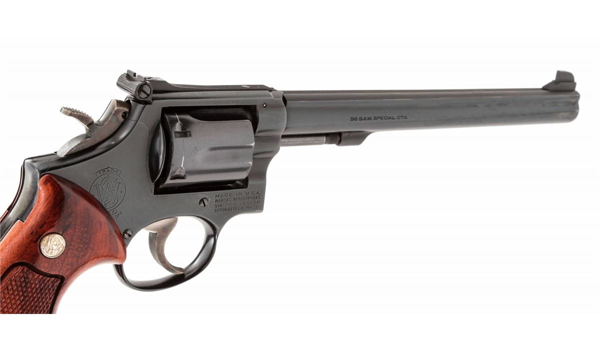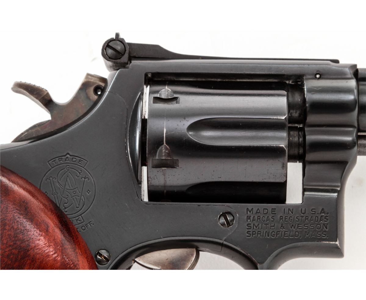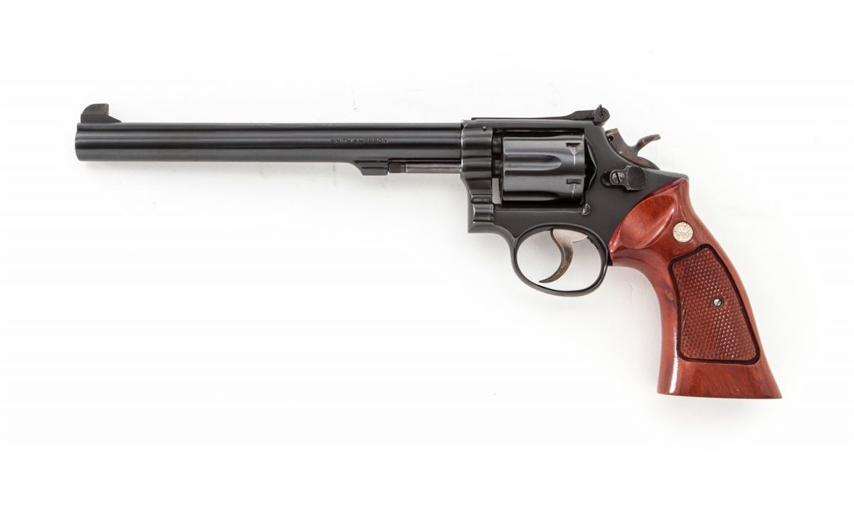 Smith & Wesson Model 15-3 Double Action Revolver, #3K25465, .38 Spec. cal., 8-3/8'' barrel, blue finish, checkered medallion walnut grips, adjustable rear and Patridge front sights, with pre-1981 pinned barrel. Condition is excellent showing light thinning at high edges. Crisp grips and action, bright bore. Est.: $500-$750. (Modern/PPT)