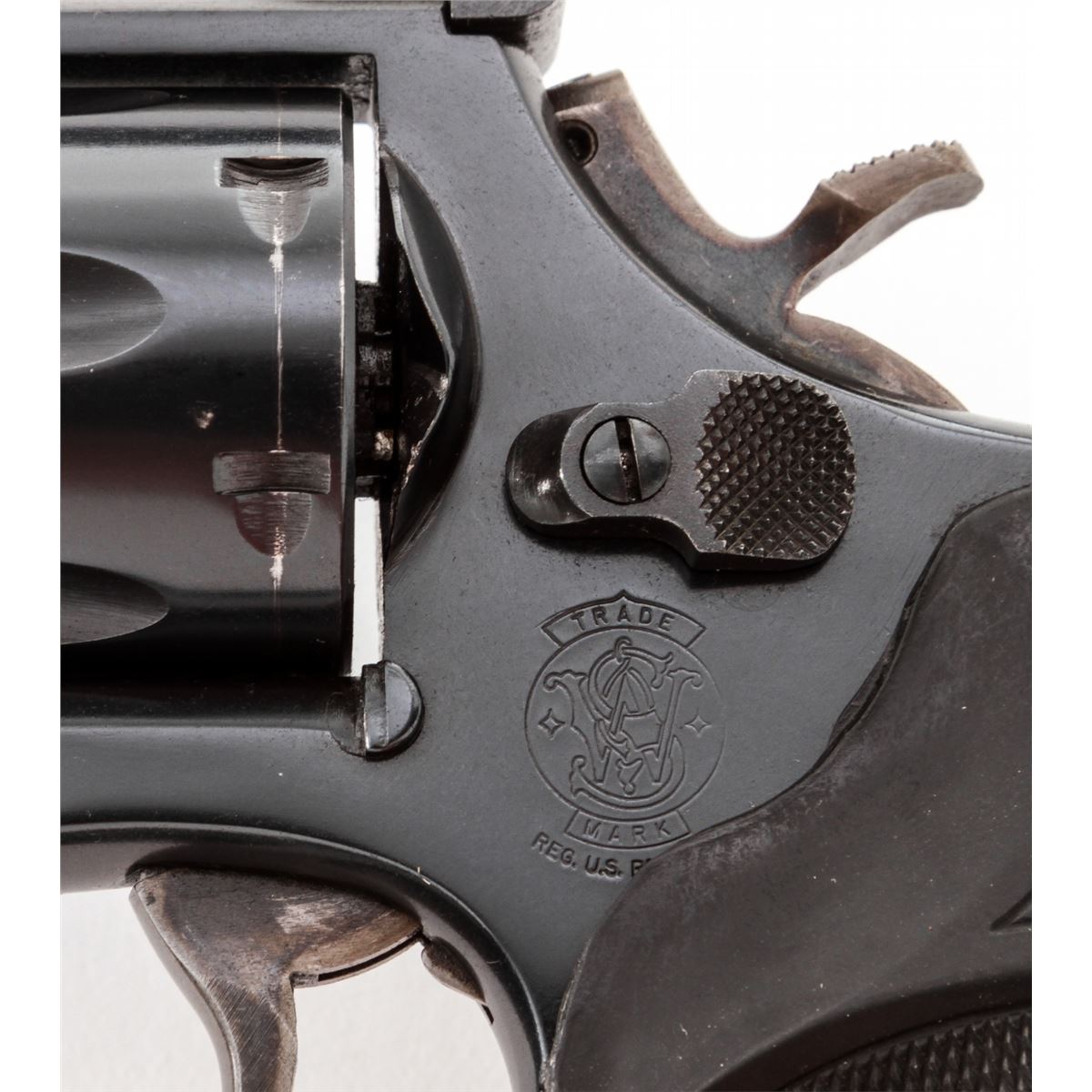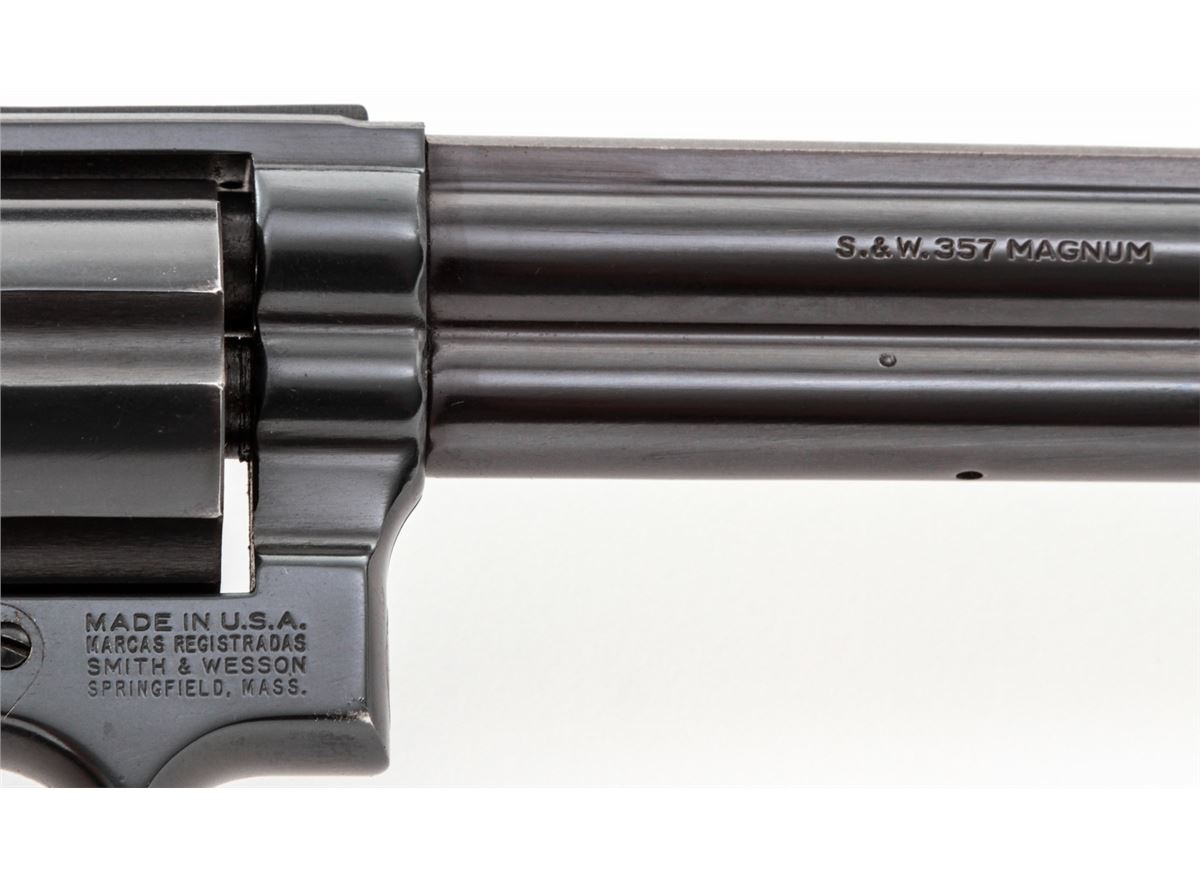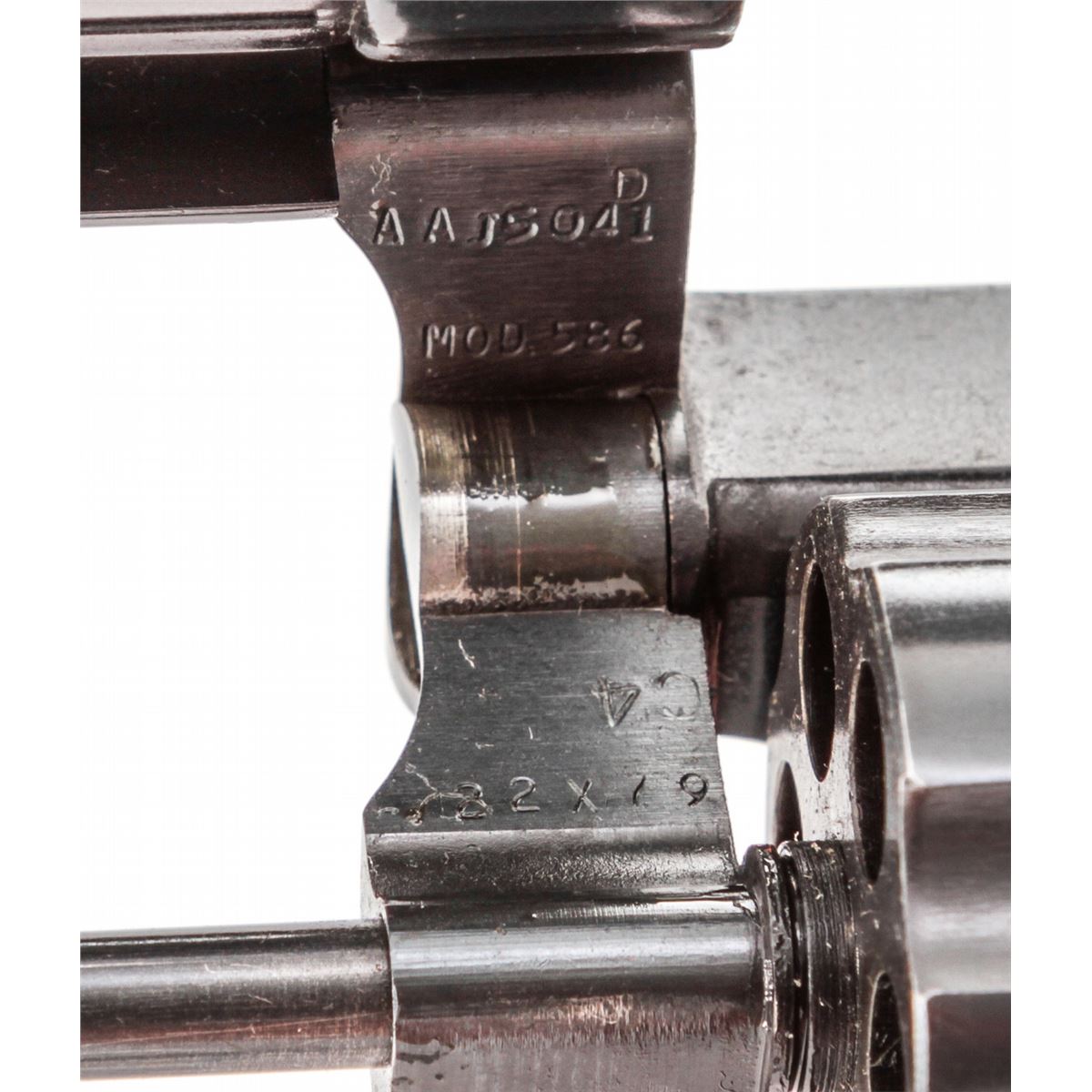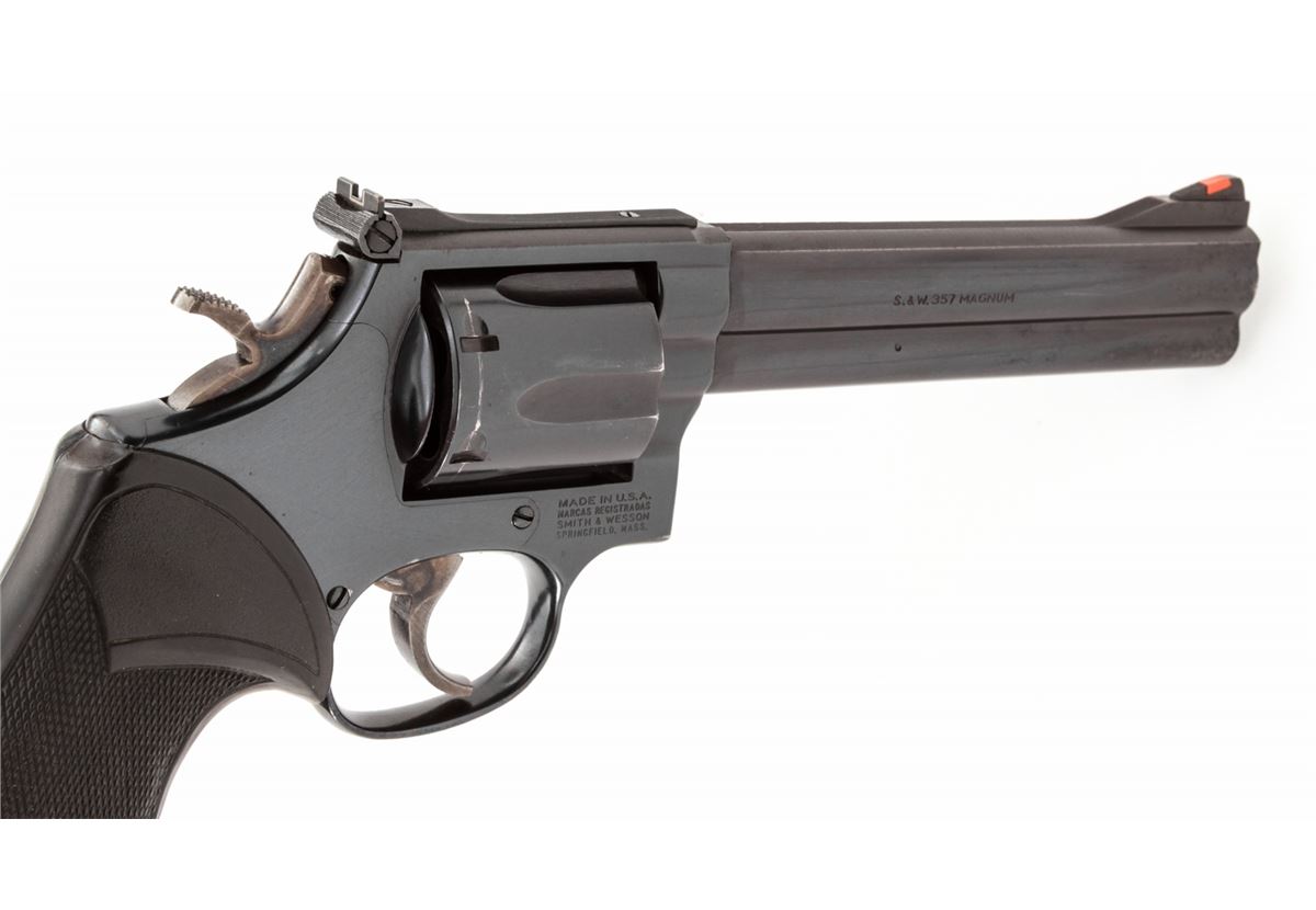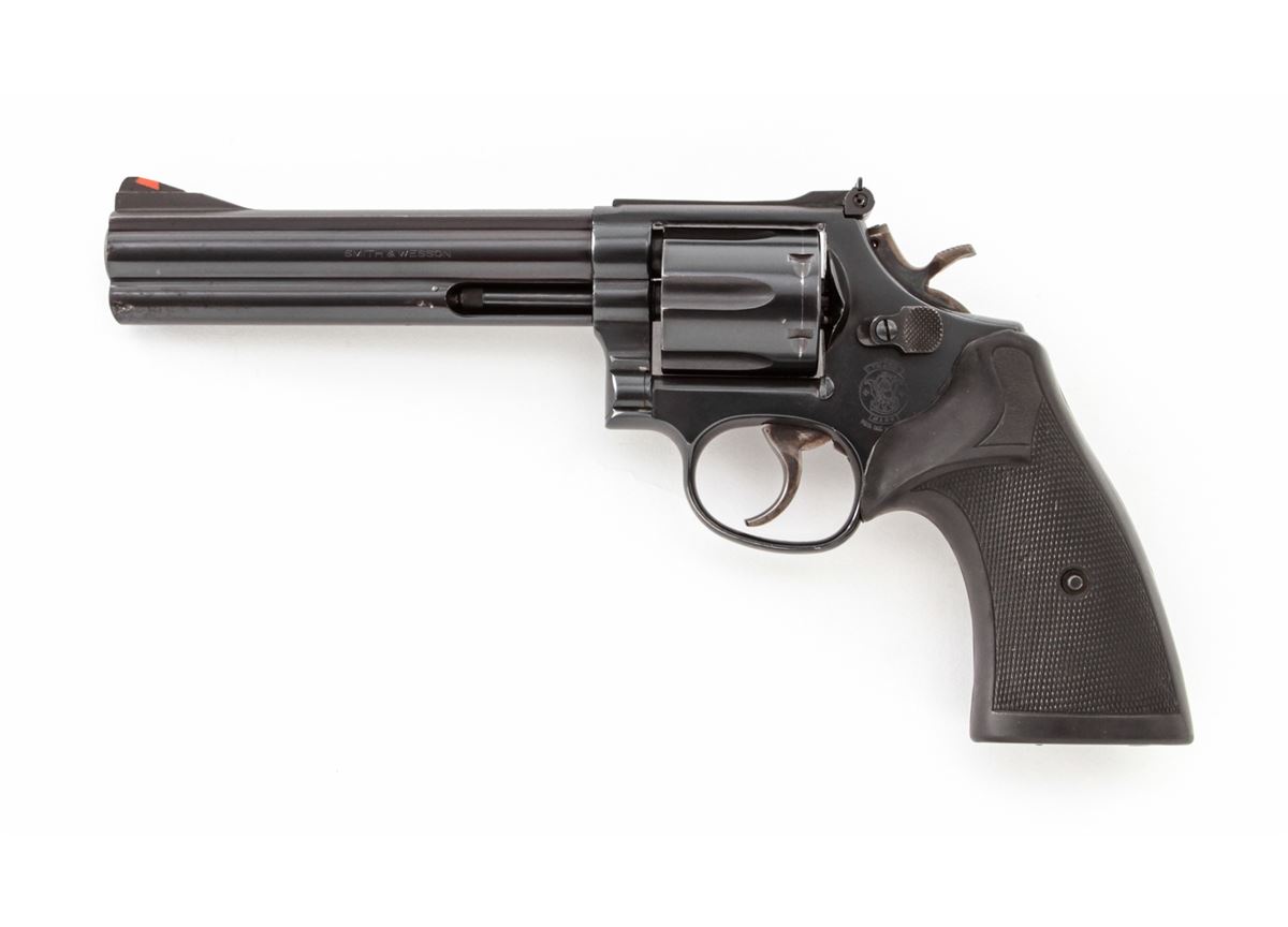 Smith & Wesson Model 586 Double Action Revolver, #AAJ5041, .357 mag. cal., 6'' barrel, blue finish, Pachmayr black rubber grips, with red ramp front and white outline rear sights. Condition is excellent showing light handling marks, as thinning to finish near muzzle. Est.: $450-$600. (Modern) (Not available to Calif. residents.)