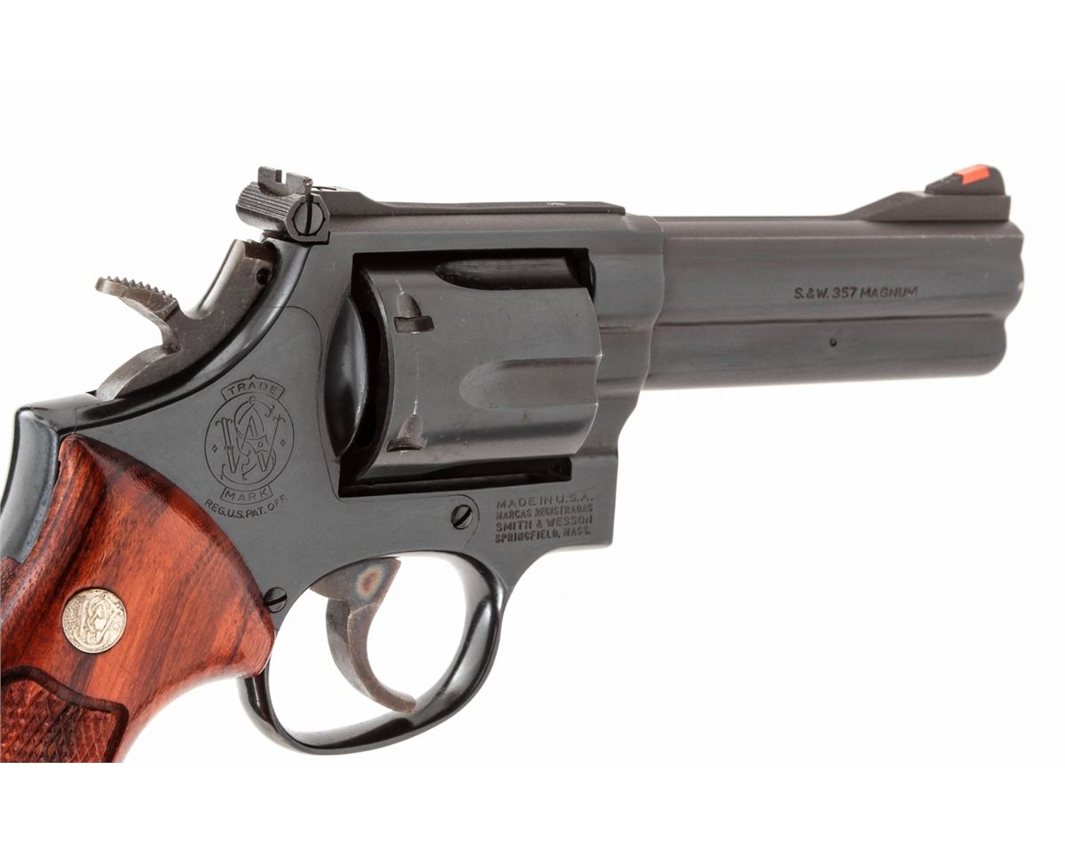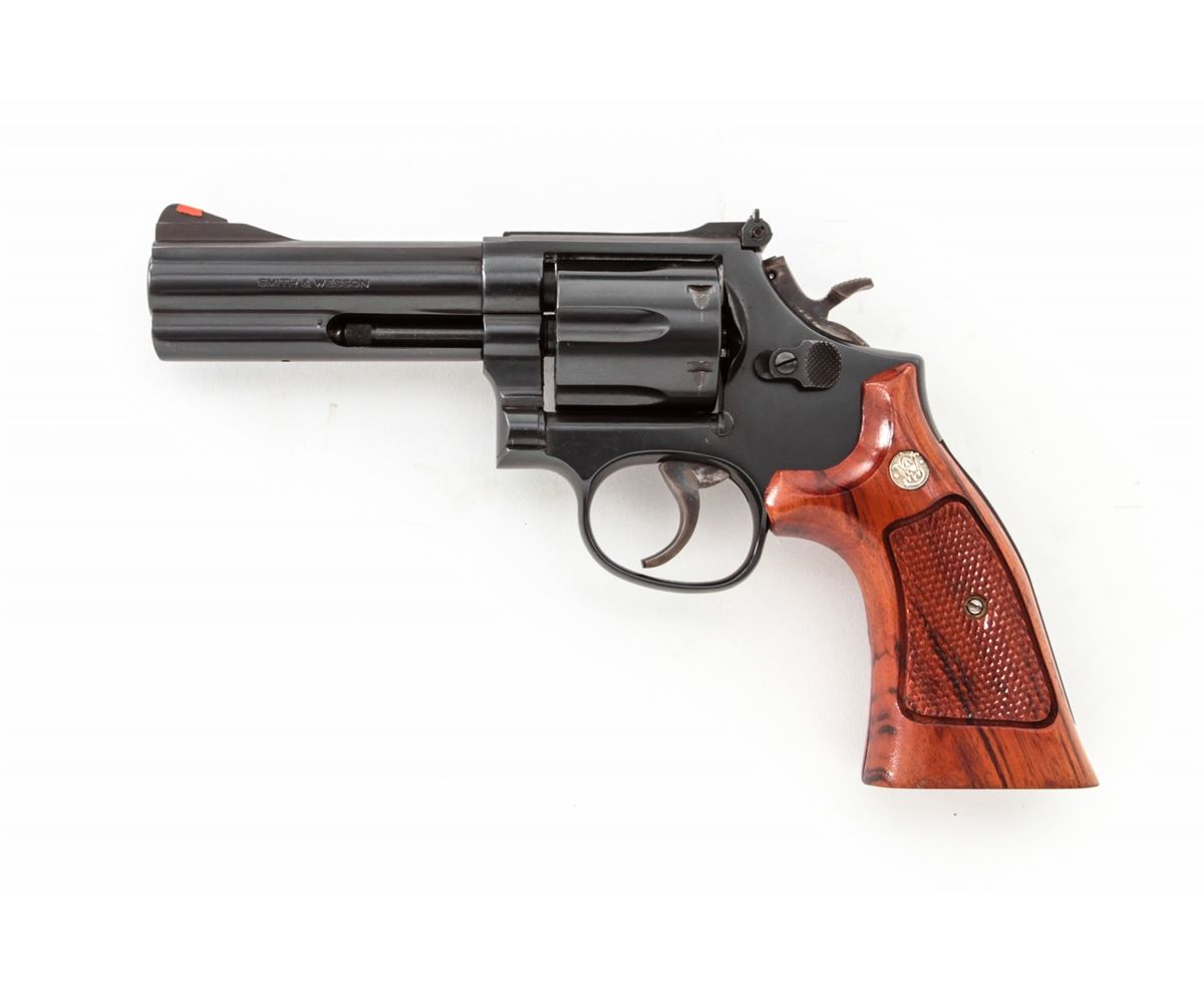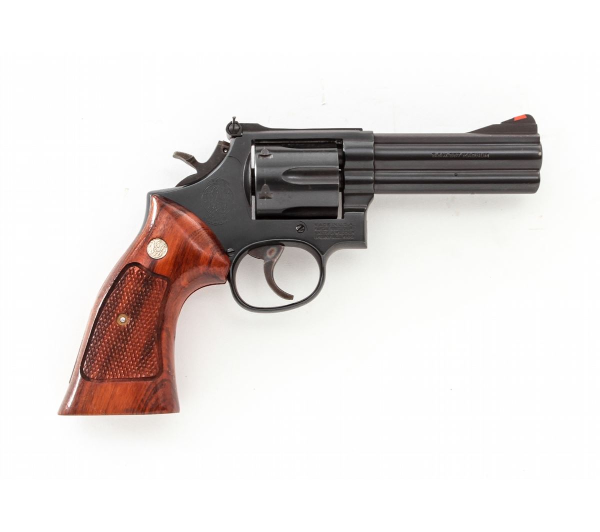 Smith & Wesson Model 586 Double Action Revolver, #AAC3927, .357 mag. cal., 4'' barrel, blue finish, checkered medallion hardwood target grips. Condition is excellent, showing little use, with light thinning at muzzle and front edge of cylinder. Crisp grips, good action, bright bore. Est.: $450-$600. (Modern/PPT)