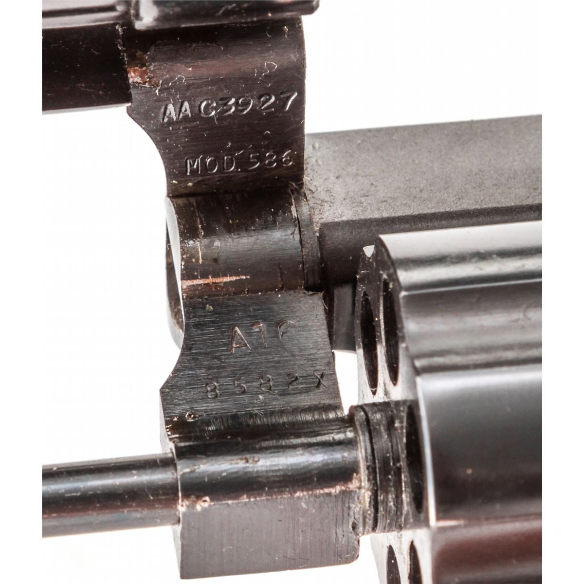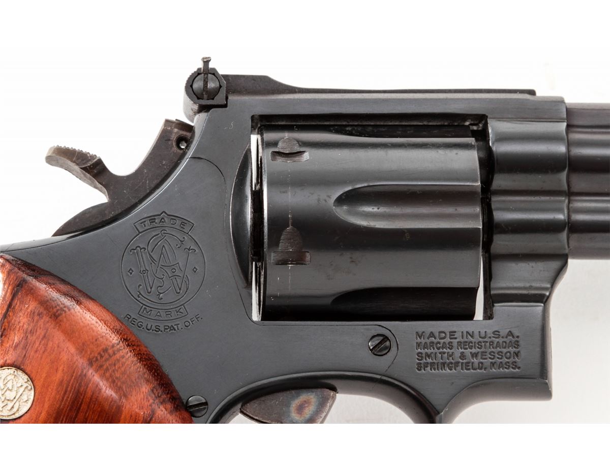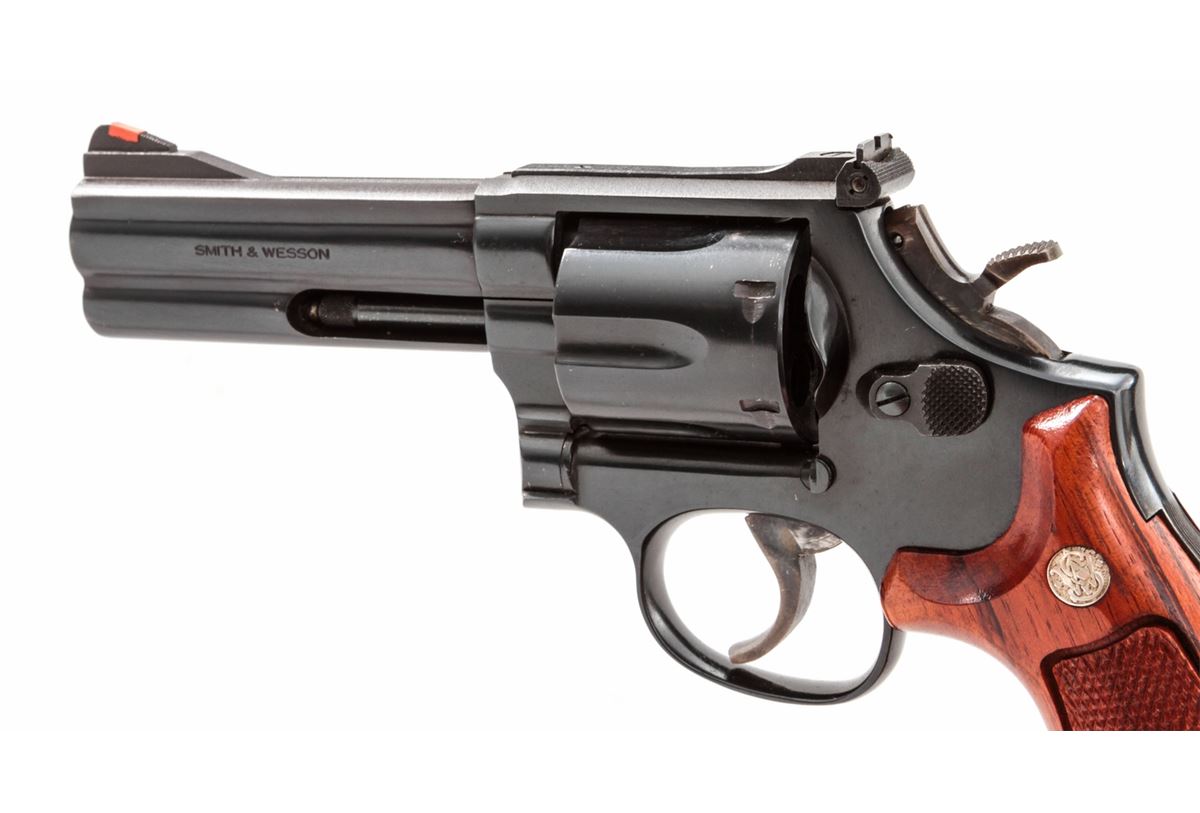 Smith & Wesson Model 586 Double Action Revolver, #AAC3927, .357 mag. cal., 4'' barrel, blue finish, checkered medallion hardwood target grips. Condition is excellent, showing little use, with light thinning at muzzle and front edge of cylinder. Crisp grips, good action, bright bore. Est.: $450-$600. (Modern/PPT)