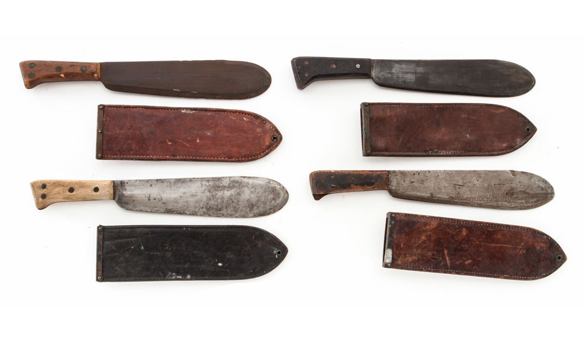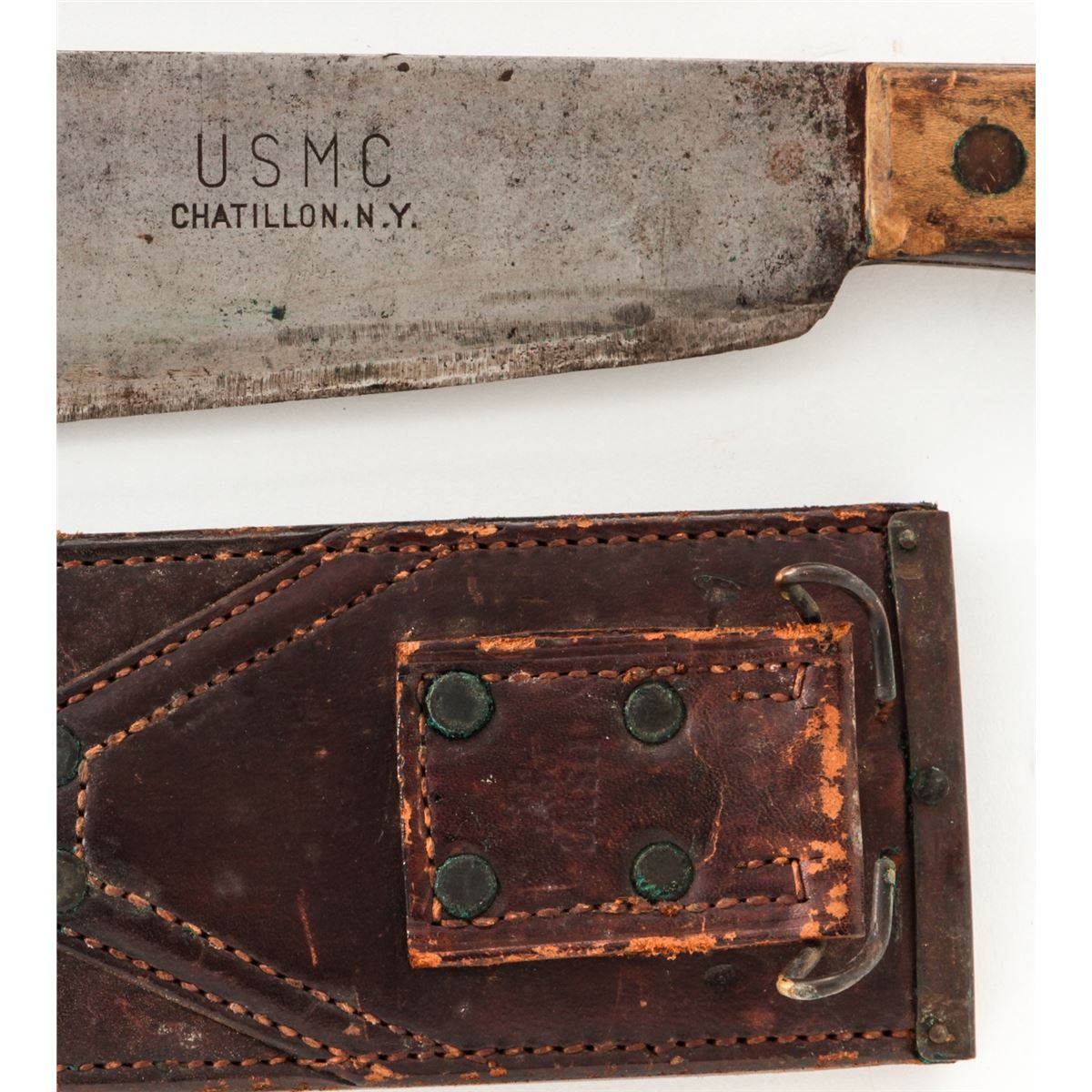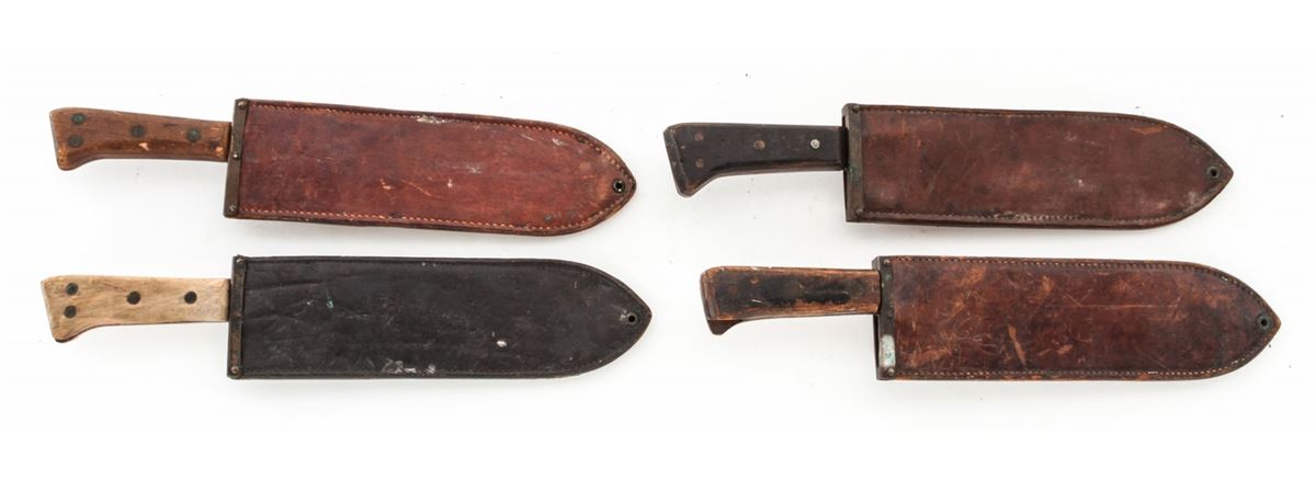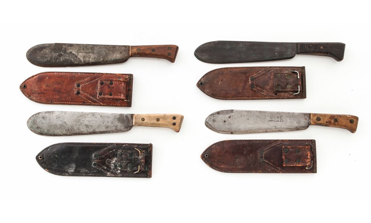 Lot of Four (4) U.S.M.C. Medical Corp Bolo Knives, two (2) Village Blacksmith and two (2) Chatillon, N.Y.; 11-3/8'' blades, 16-1/2'' overall with wood handles. Included are two (2) ''USMC Boyt 44'' scabbards, one (1) U.S. Boyt 43'' scabbard, and one (1) whose mfg. is not legible but appears to be dated ''45''. Conditions are good overall showing moderate to heavy signs of age and wear. Two (2) handles are missing small pieces, blades with carbon spotting and one with scattered pitting. Scabbards are in good to very good condition with tight stitching and seams. Est.: $275-$400/lot.