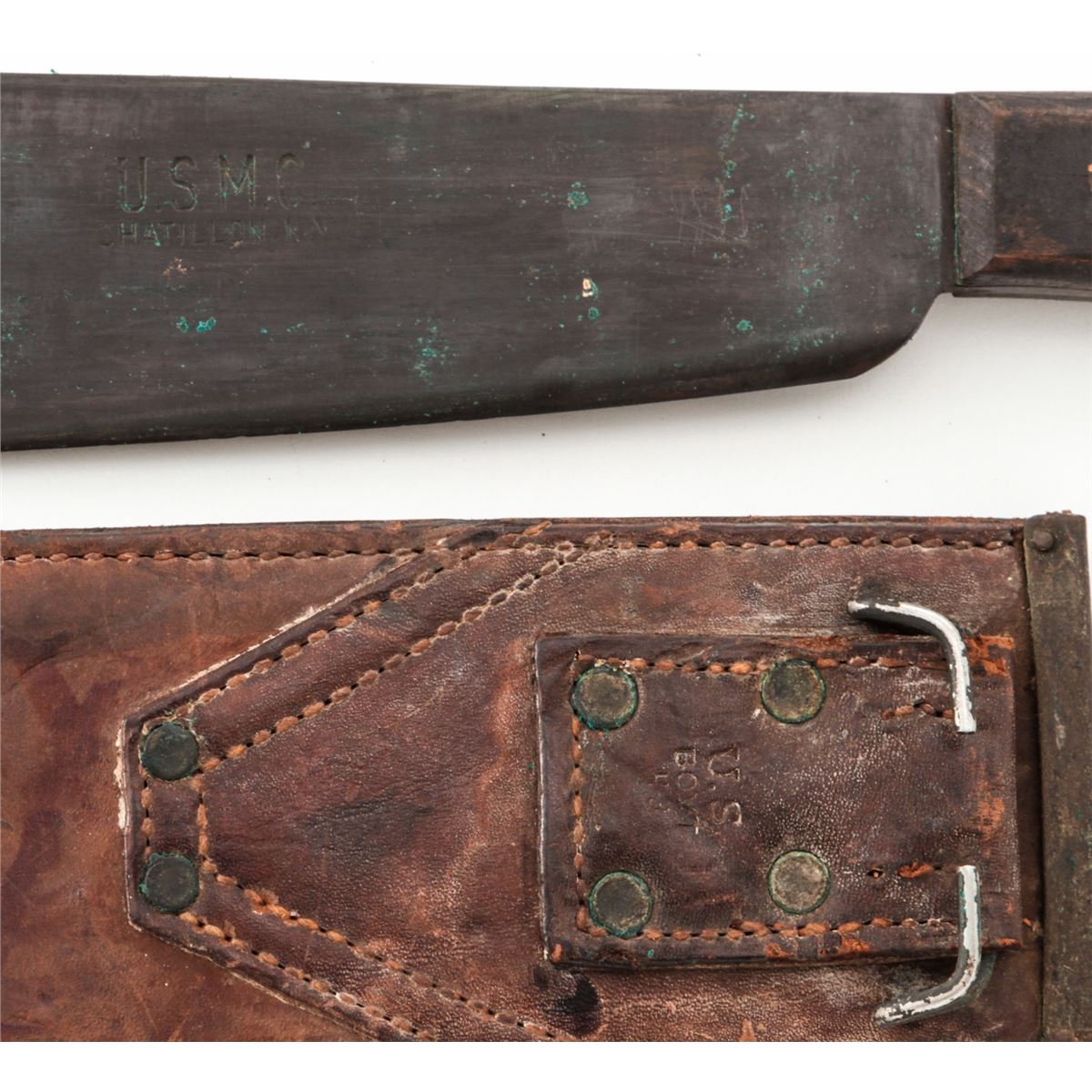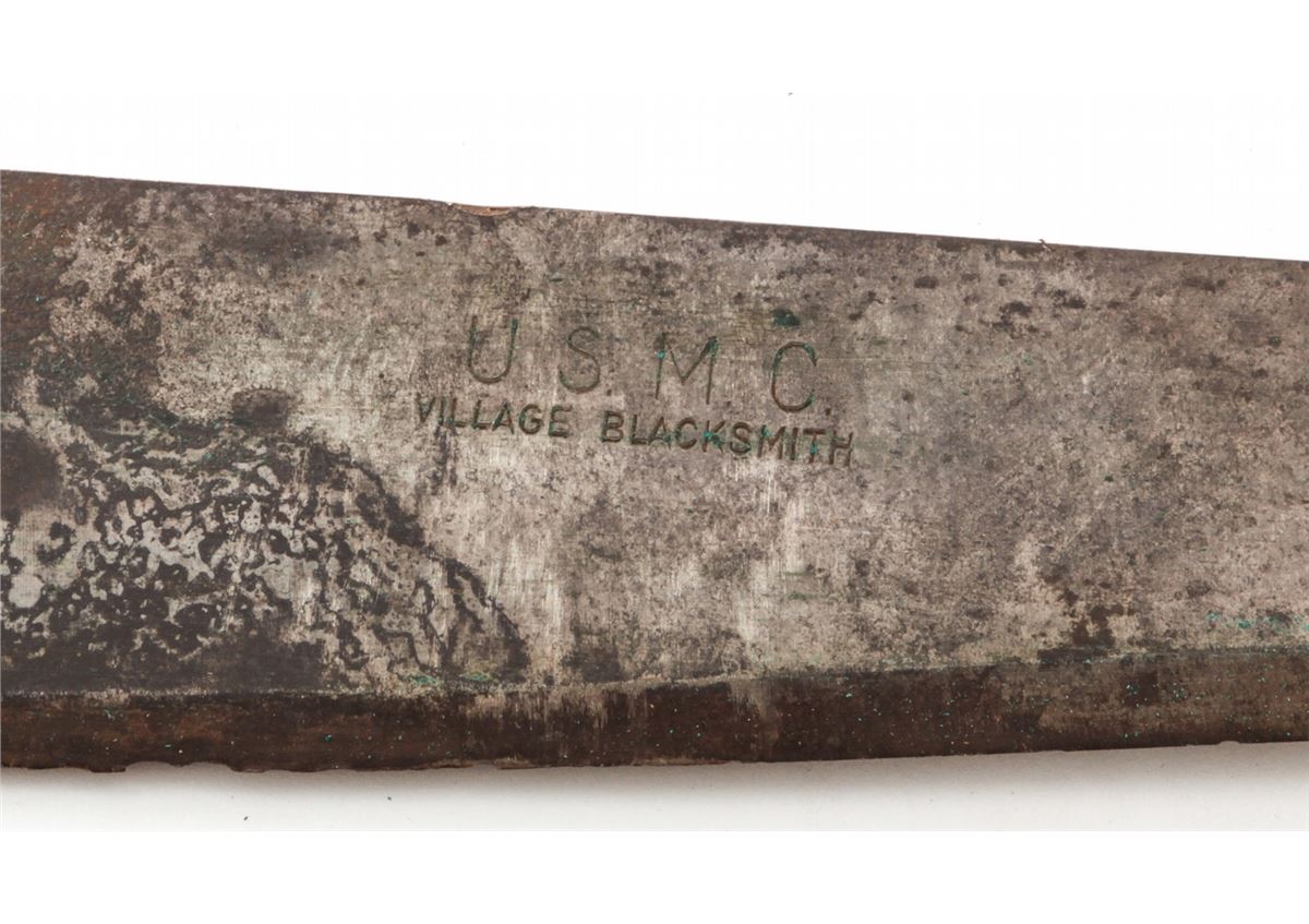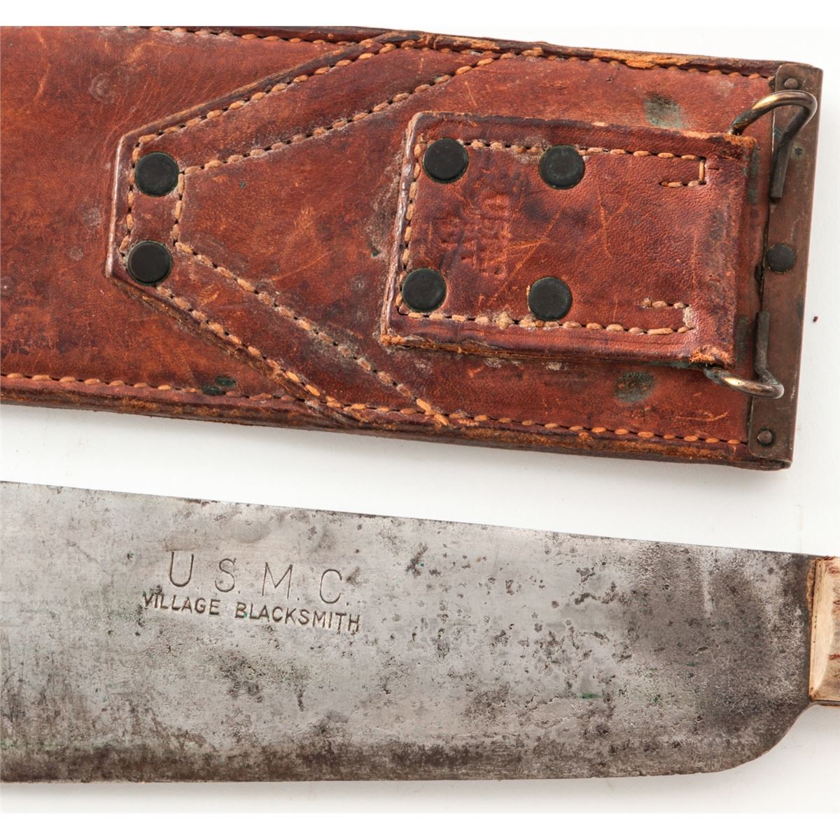 Lot of Four (4) U.S.M.C. Medical Corp Bolo Knives, two (2) Village Blacksmith and two (2) Chatillon, N.Y.; 11-3/8'' blades, 16-1/2'' overall with wood handles. Included are two (2) ''USMC Boyt 44'' scabbards, one (1) U.S. Boyt 43'' scabbard, and one (1) whose mfg. is not legible but appears to be dated ''45''. Conditions are good overall showing moderate to heavy signs of age and wear. Two (2) handles are missing small pieces, blades with carbon spotting and one with scattered pitting. Scabbards are in good to very good condition with tight stitching and seams. Est.: $275-$400/lot.