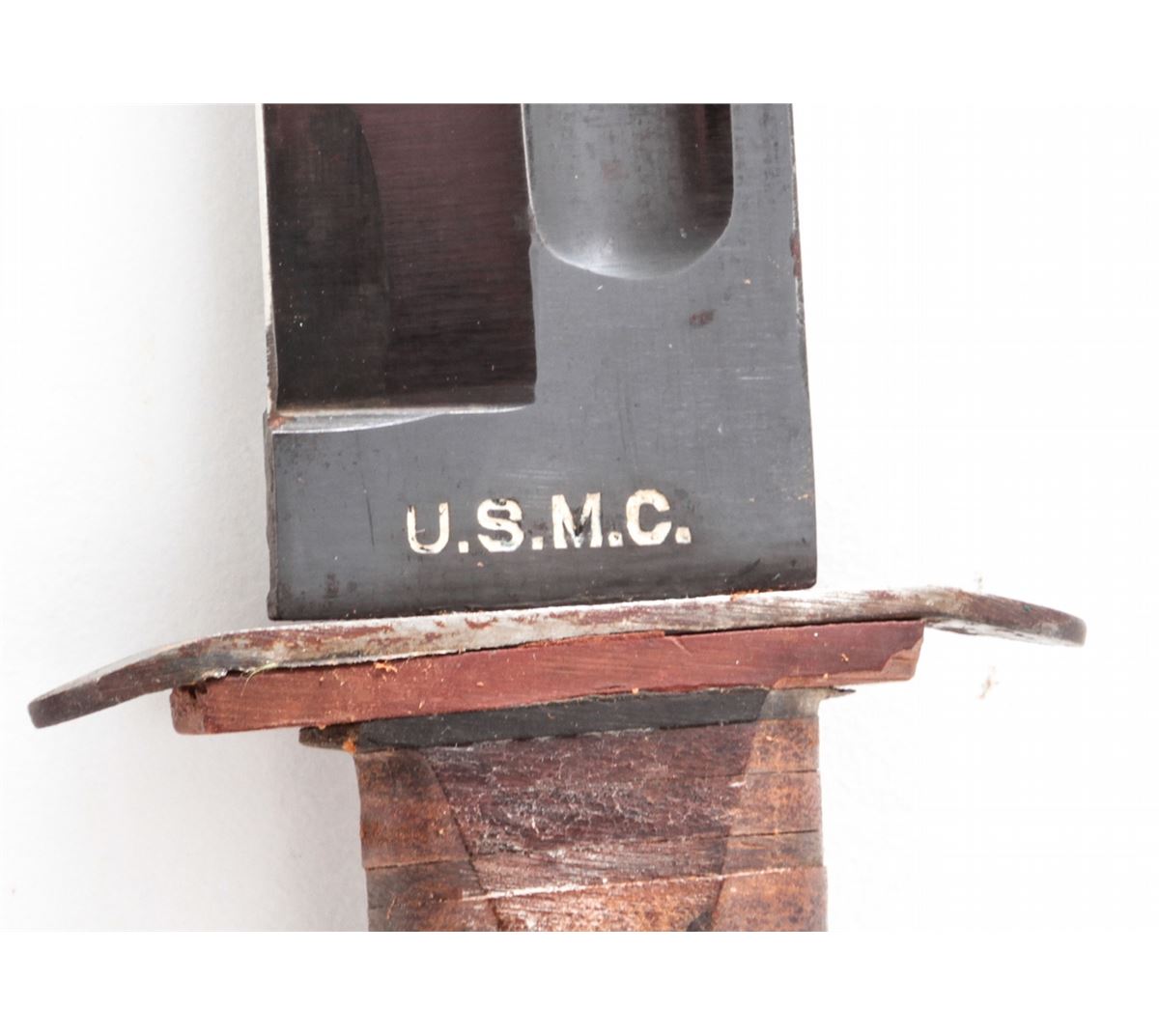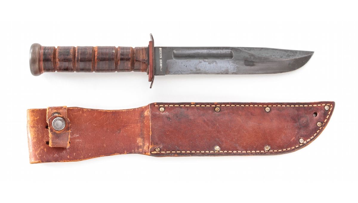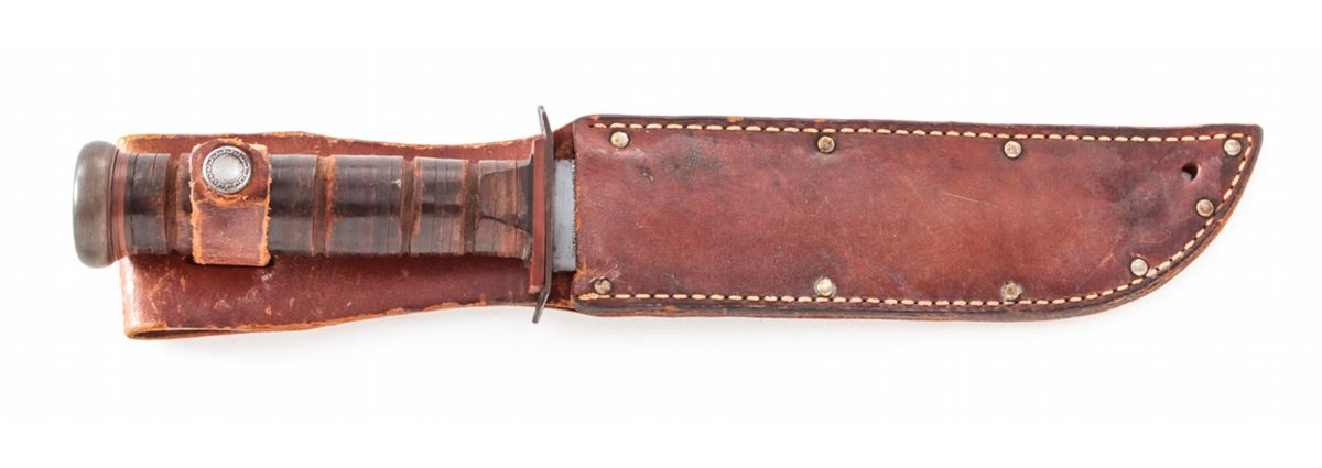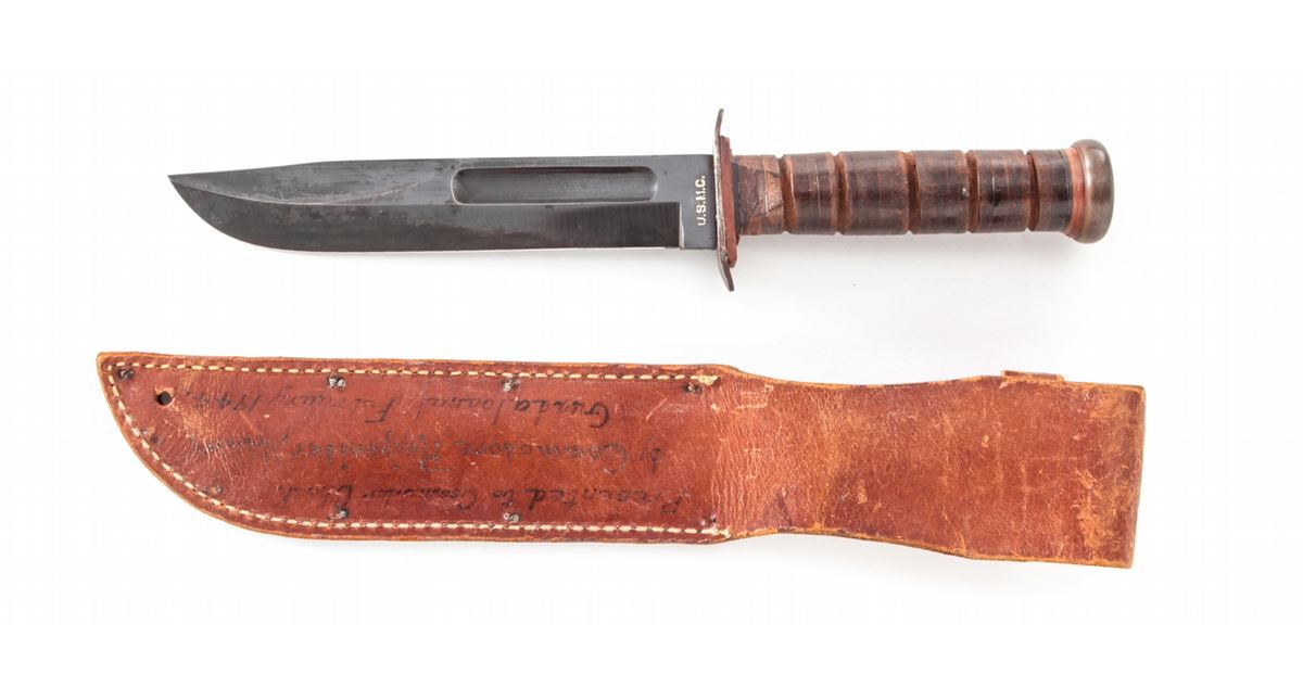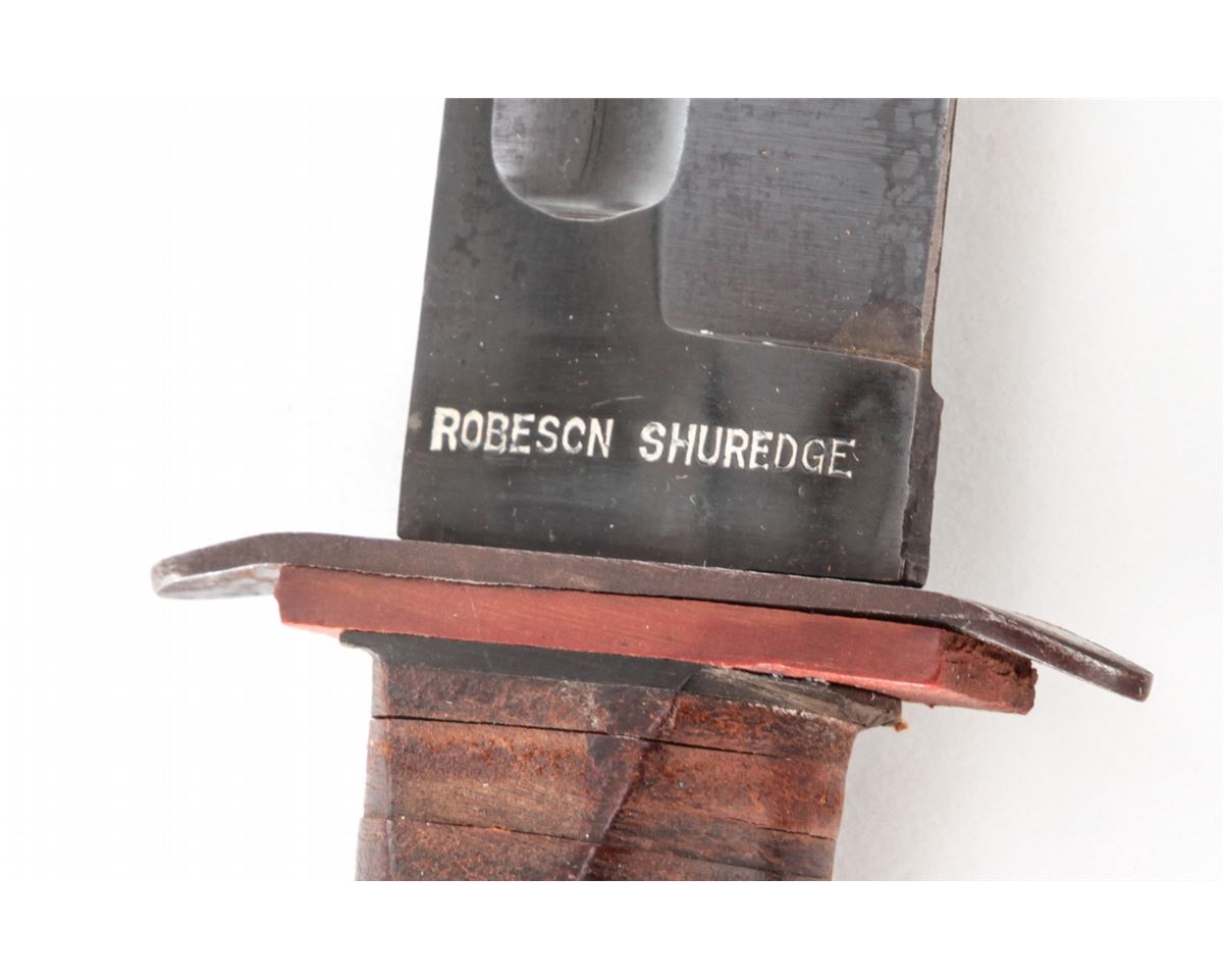 Red Spacer USMC Fighting Knife, by Robeson Shuredge, 7'' blade, 12'' overall, five-groove stacked leather washer handle, thick pommel, with red & black spacers at both guard and pommel, with unmarked nine-pin leather sheath. The following is handwritten on the back of the sheath: ''Presented to Commander Cheek, by Commodore Reifsnider, U.S. Navy, Guadalcanal February 1944.'' Condition is fine overall. Blades retains approx. 95% thinning/flaking blue finish, guard with a moderate amount of horizontal movement, and the handle remains tight. Sheath with moderate scuffs, scratches and discoloration; stitching and seams remain tight. Est.: $400-$600.
