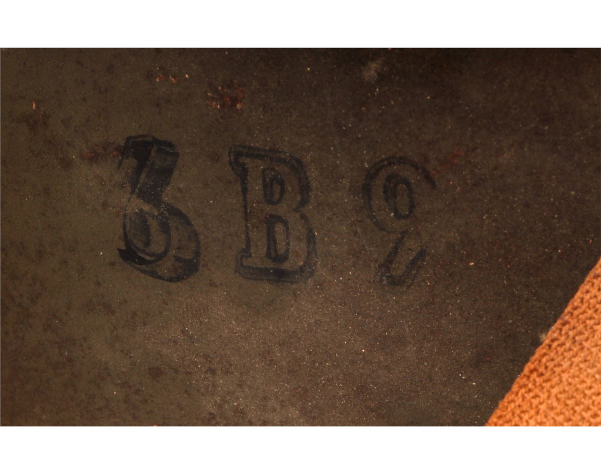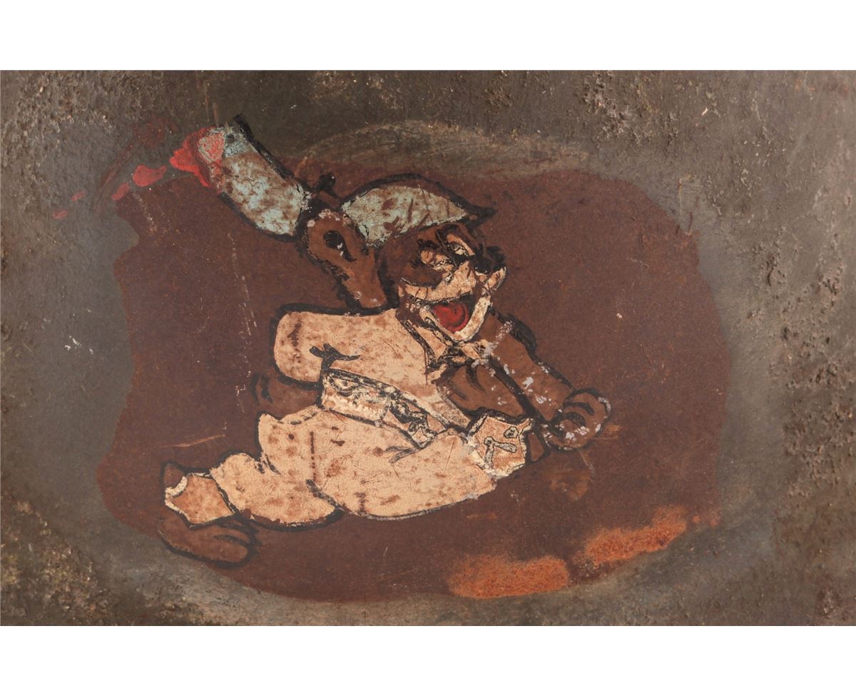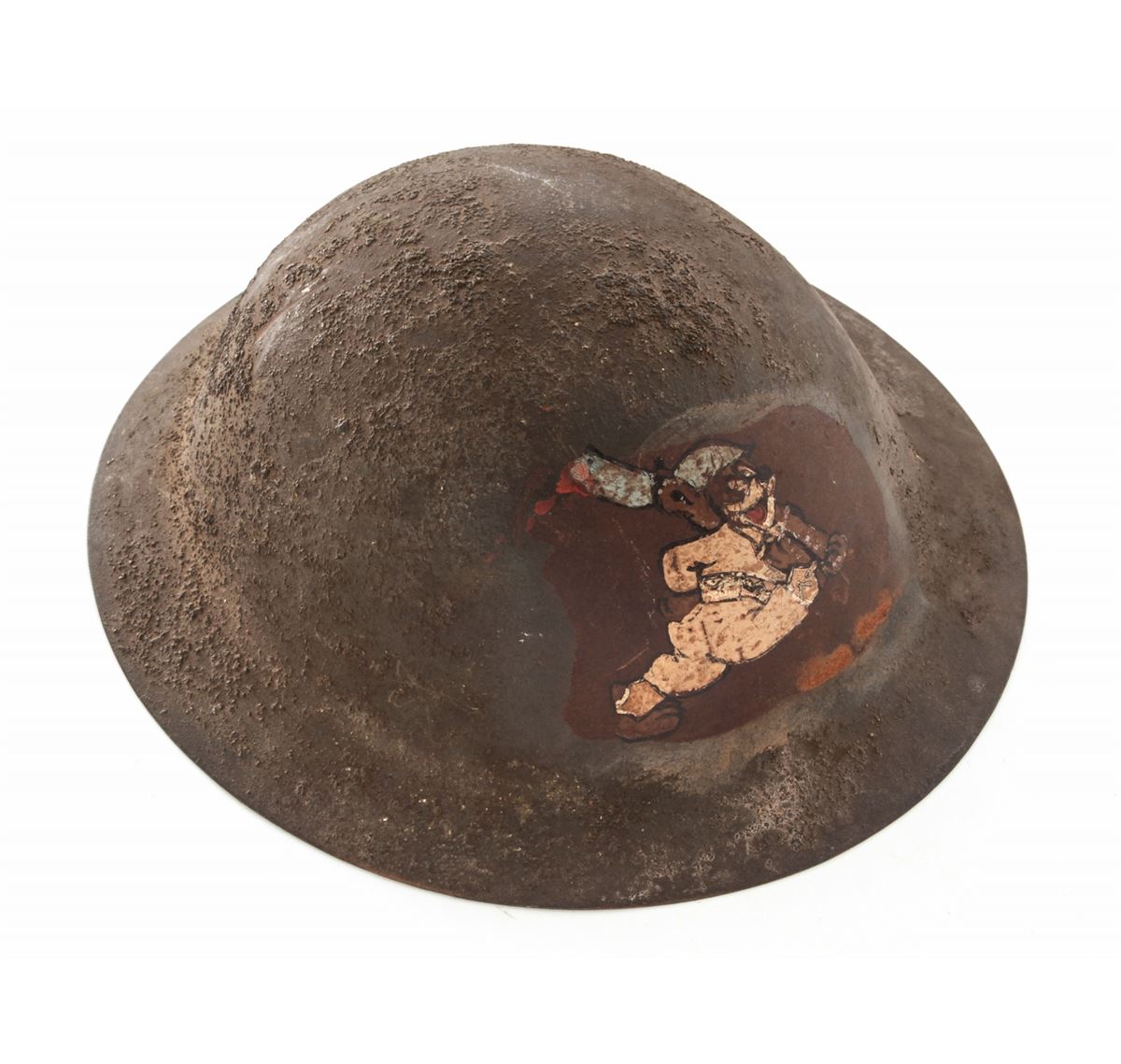 U.S. Model 1917 Helmet, with 1919 Russian Expedition artwork. Condition is very good with non-standard liner, moderate discoloration to green surfaces, and fraying to chinstrap. Artwork appears to be a mouse in winter overcoat carrying a rifle, wearing similar type helmet. Est.: $250-$400.