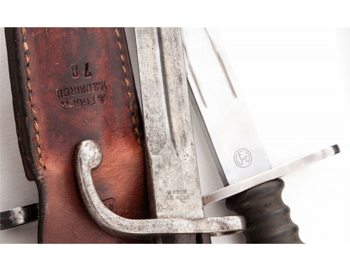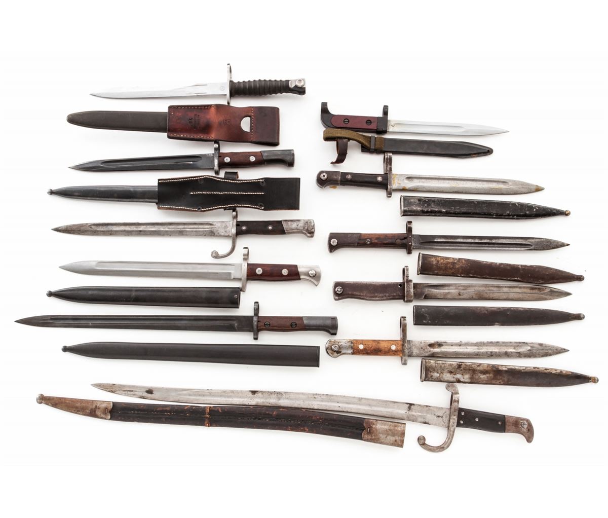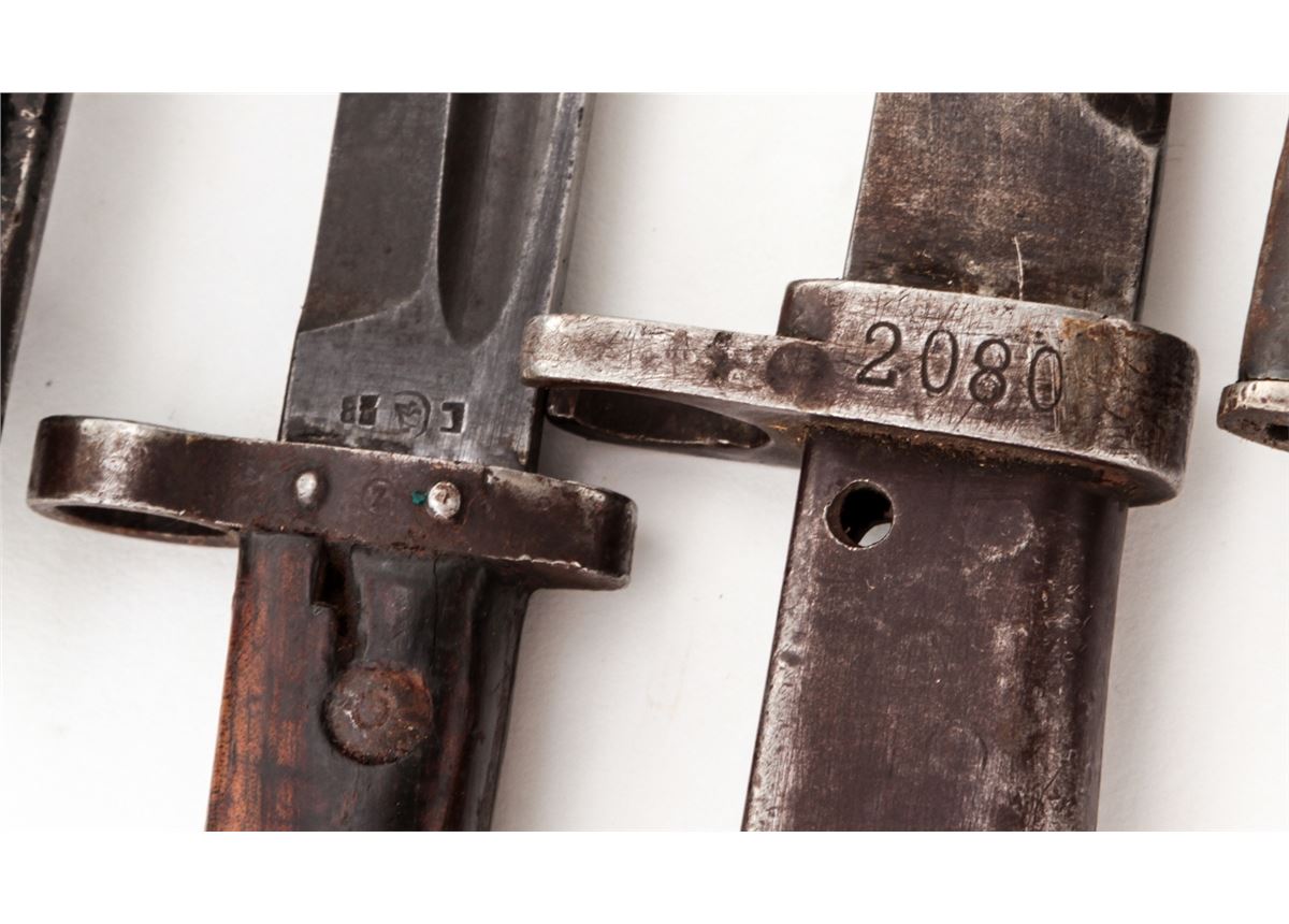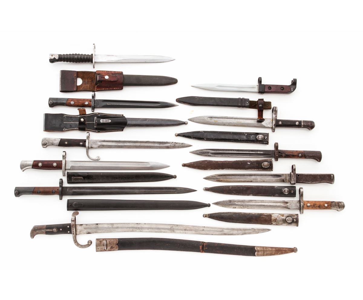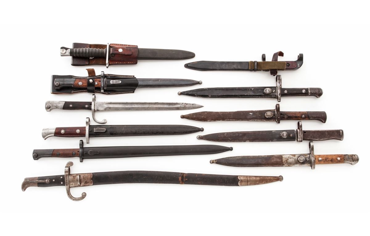Lot of Eleven (11) Bayonets, including bayonets for a Turkish Mauser, Yugoslavian Mauser, Czech VZ-24, Brazilian Mauser, AK-47, Swiss Model 57 bayonet, German ''Ersatz'', Danish Model 1867, etc. Scabbards are included, with the exception of the Brazilian Mauser bayonet. Conditions range from good to very good, showing normal signs of age and wear. Est.: $250-$400/lot.