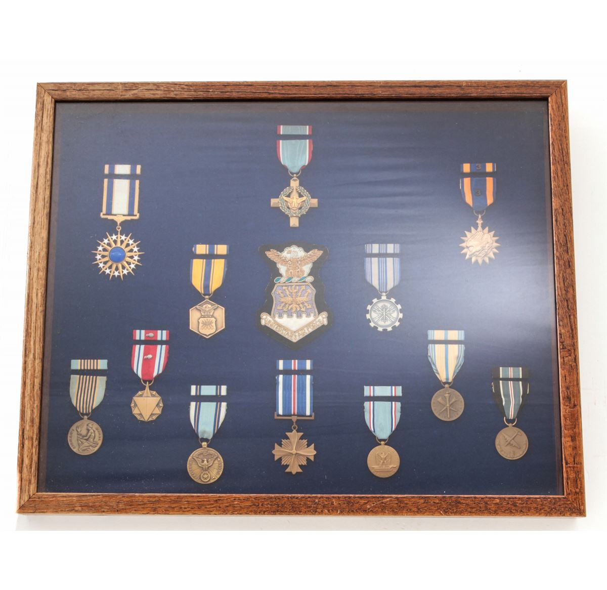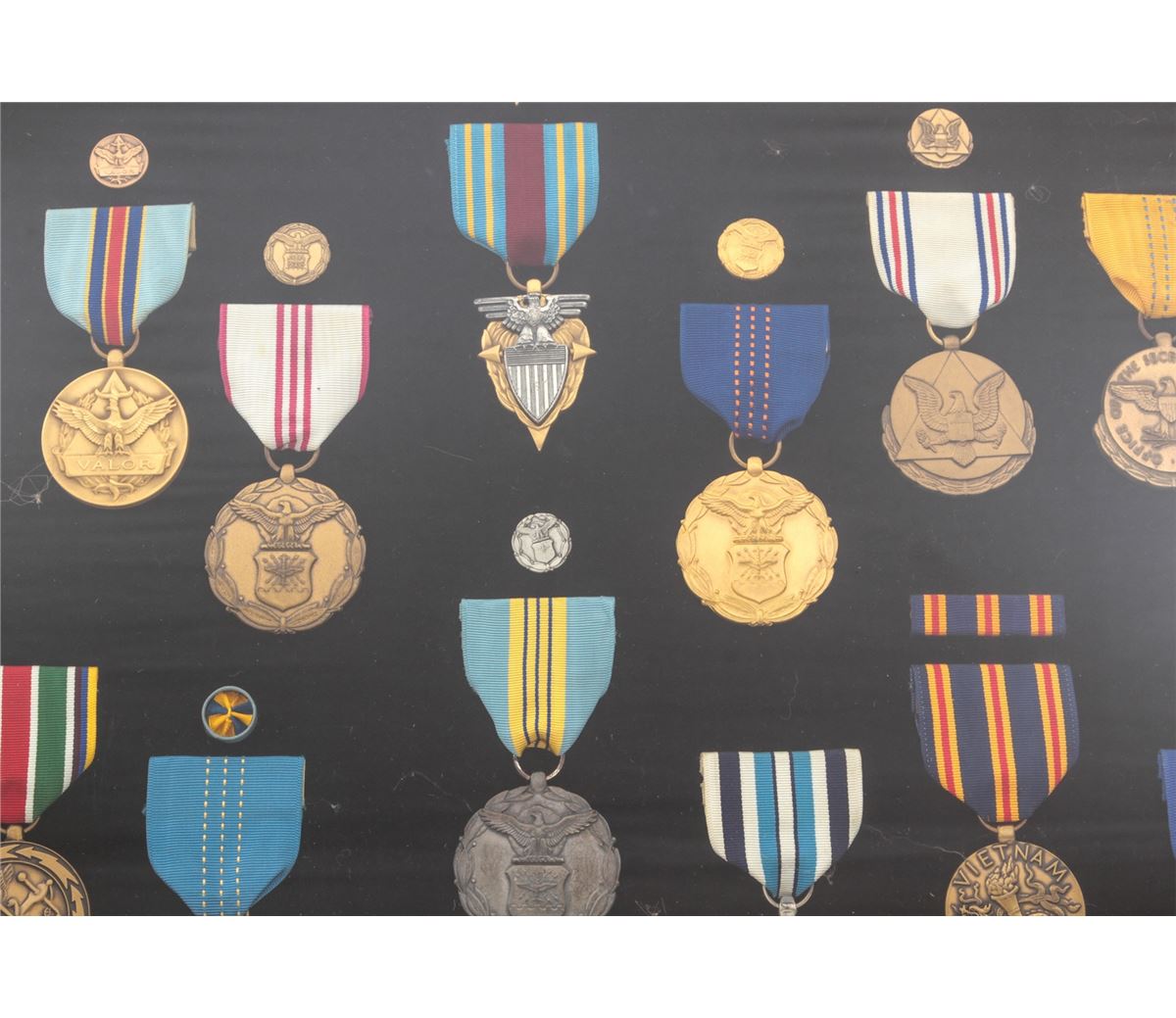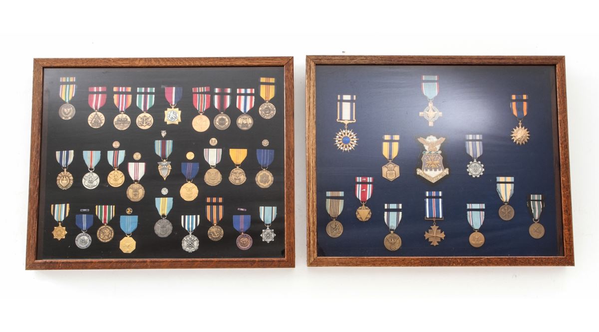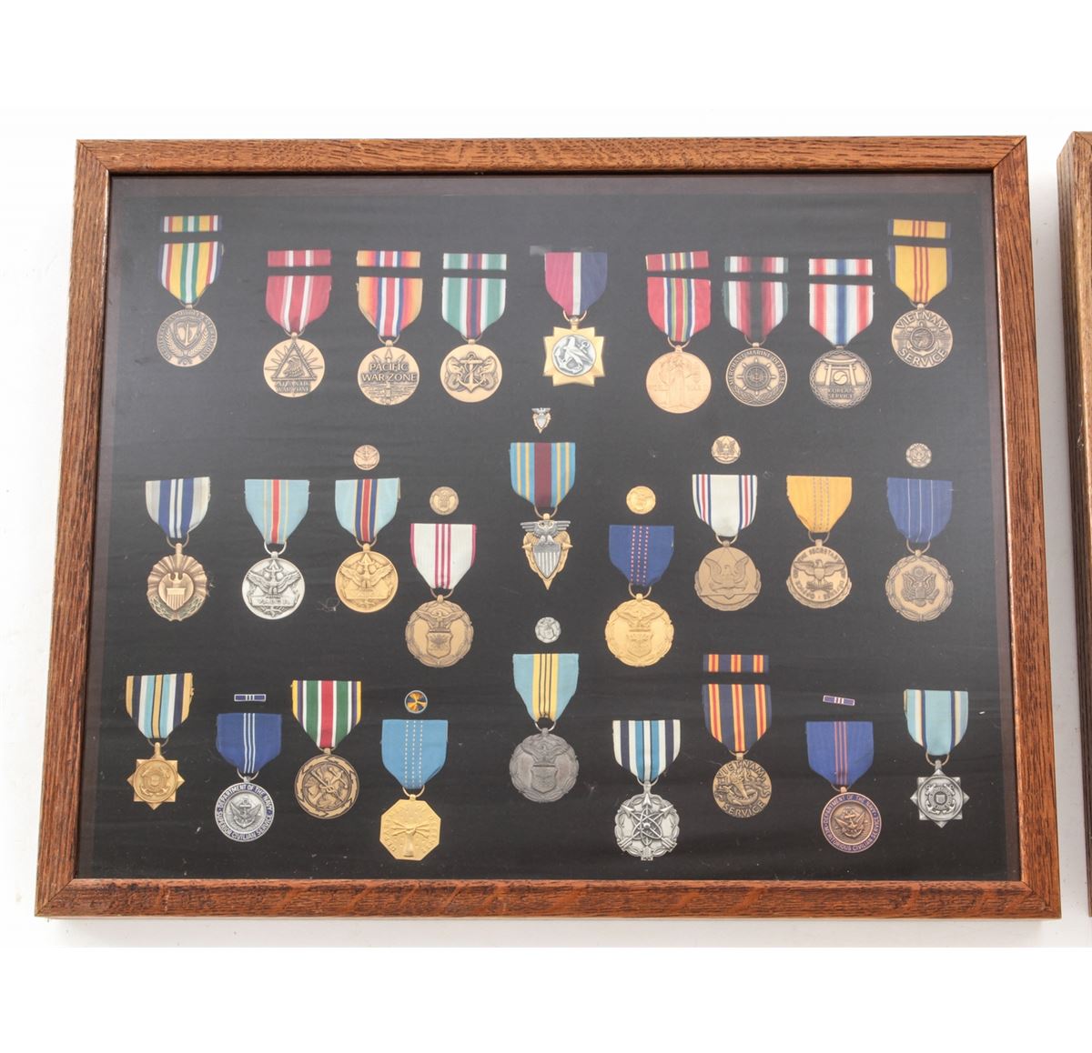 Lot of Two (2) Oak Frames containing approx. 39 U.S. military medals, bars and pins, including a Korean service medal, VietNam service medal, Medal of Valor, etc., many appearing to be of modern mfg'r. Condition is very good with both frames showing light to moderate wear; backing to one frame has come loose. Est.: $150-$250/lot.