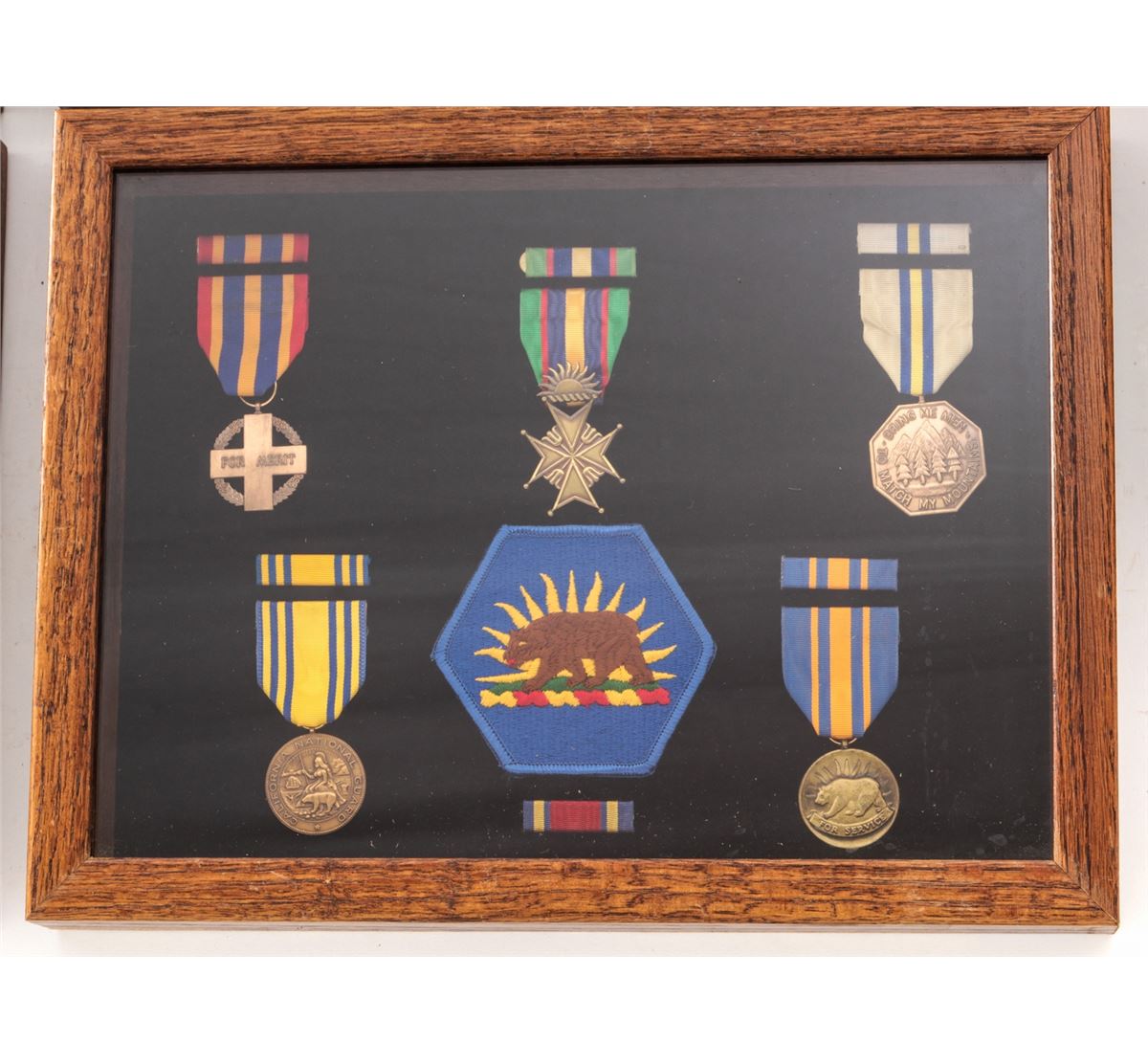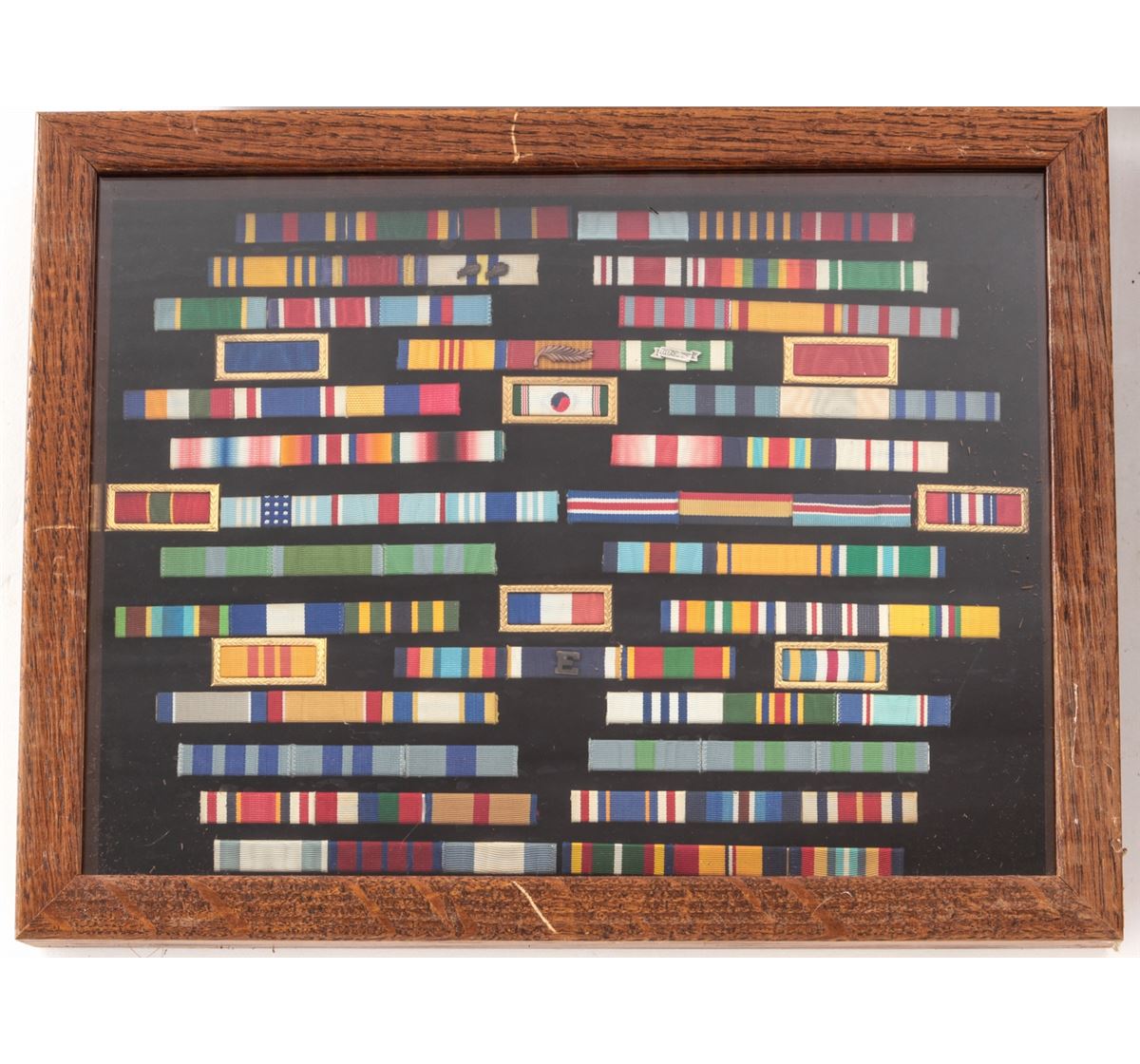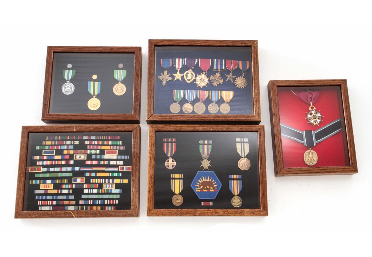 Lot of Five (5) Oak Frames, containing misc. military medals and ribbons. Approx. 22 medals total and a variety of bars. Most appear to be of modern mfg'r. Condition to all is excellent. Oak frames with light to moderate scratches and impressions. Est.: $150-$250/lot.