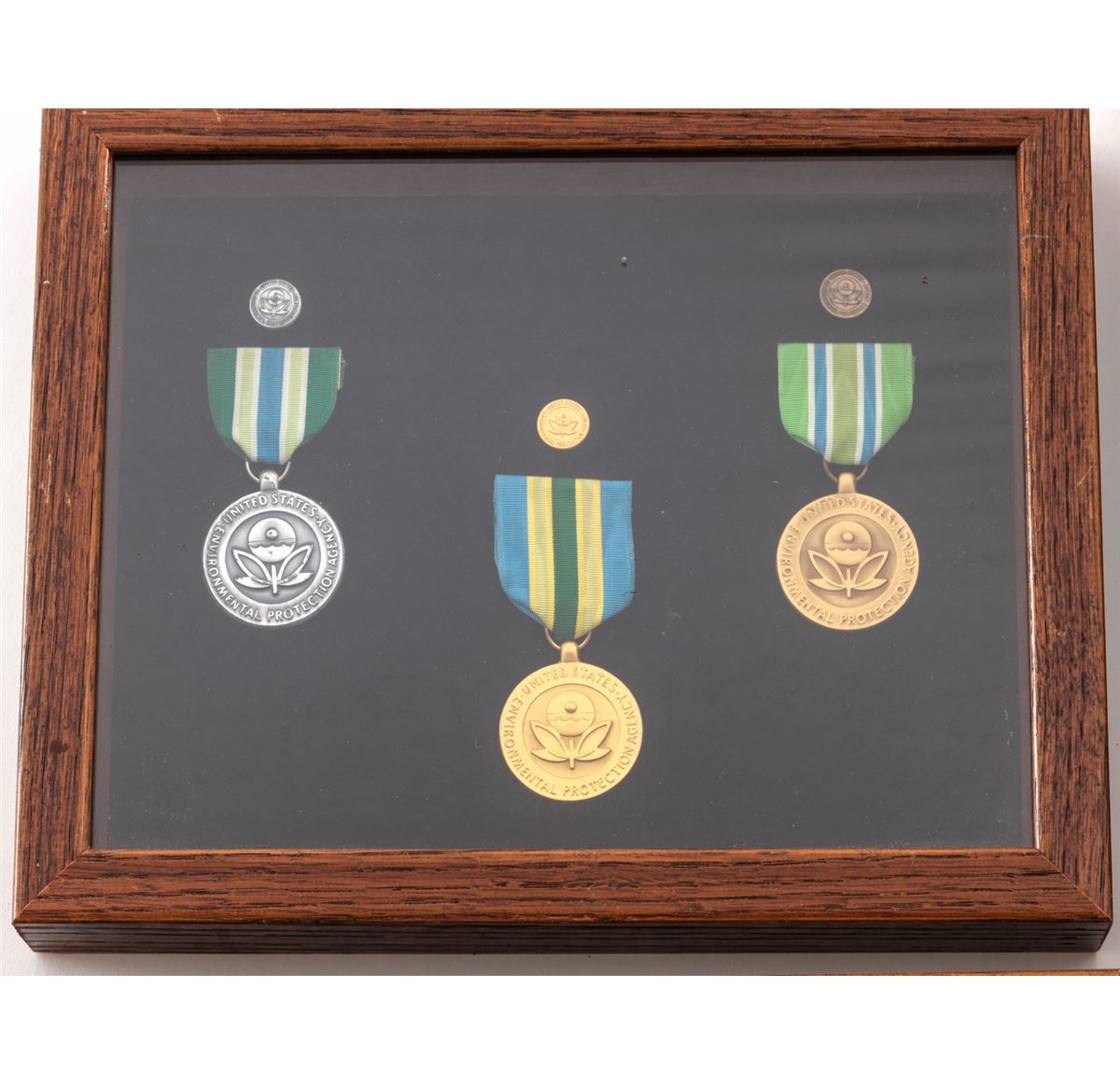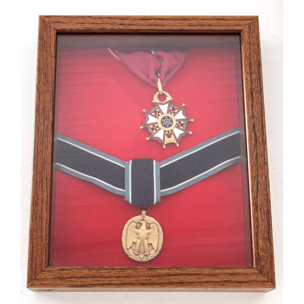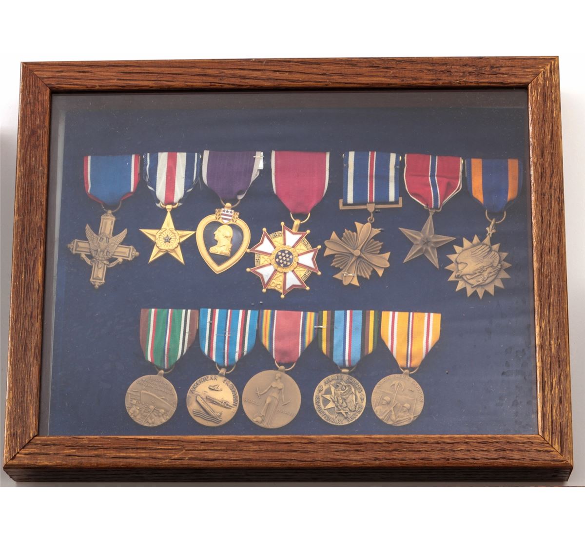 Lot of Five (5) Oak Frames, containing misc. military medals and ribbons. Approx. 22 medals total and a variety of bars. Most appear to be of modern mfg'r. Condition to all is excellent. Oak frames with light to moderate scratches and impressions. Est.: $150-$250/lot.
