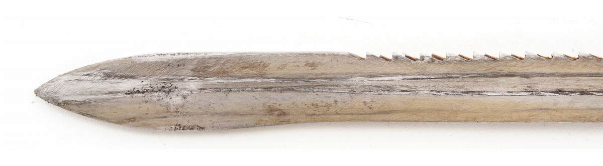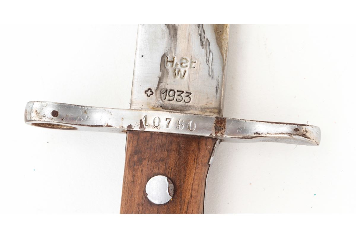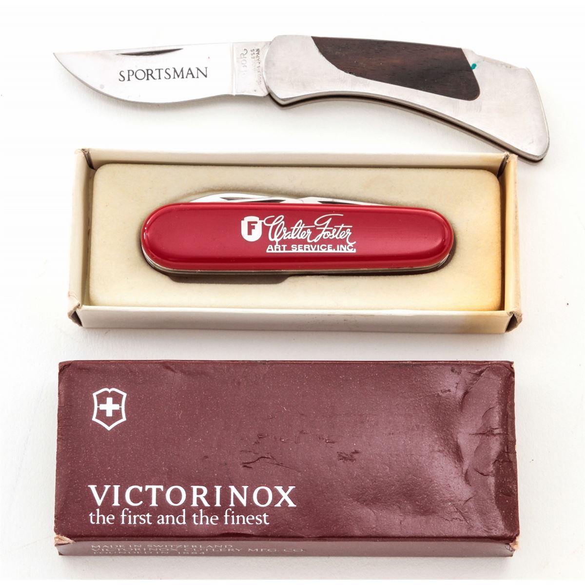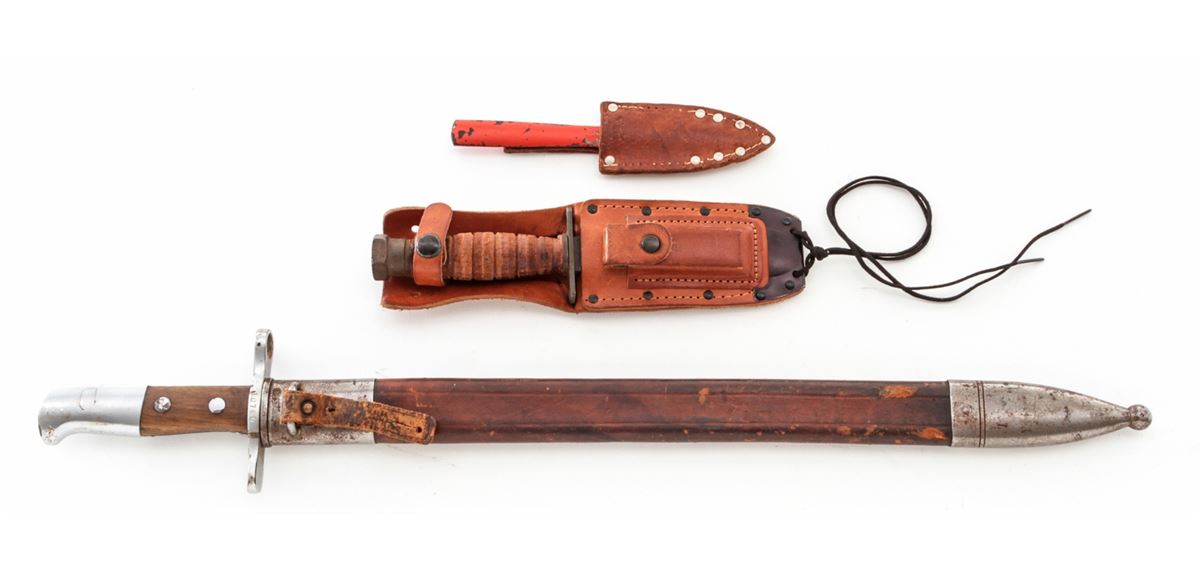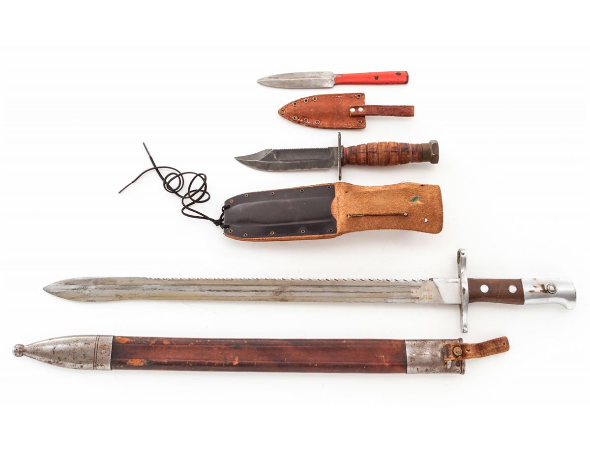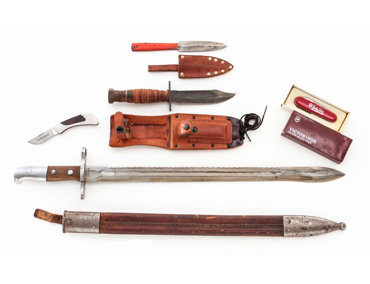 Lot of Five (5) Edged Weapons, including a Swiss Model 1911 Saw Back Bayonet, by H.St., #10760, 18-3/4'' saw back blade, dated ''1933'', 24'' overall, wood grips, leather scabbard with metal tip and throat. Also included is a pilot survival knife, by Ontario, dated ''02-80'' with leather sheath and sharpening stone; Valor ''Sportsman'' lock back folding knife; small throwing knife with orange painted handle and leather sheath; and a small utility knife by Victorinox with original box. Condition of the Swiss bayonet is very good overall showing normal signs of age and wear. Blade shows additional sharpening and some light surface pitting near tip; saw back remains sharp. Leather sheath with light to moderate scuffs and impressions, stitching and seams remain tight, the tip and throat with light surface rust and carbon spotting. The remaining knives range from very good to excellent showing light to moderate use. Est.: $200-$300/lot.
