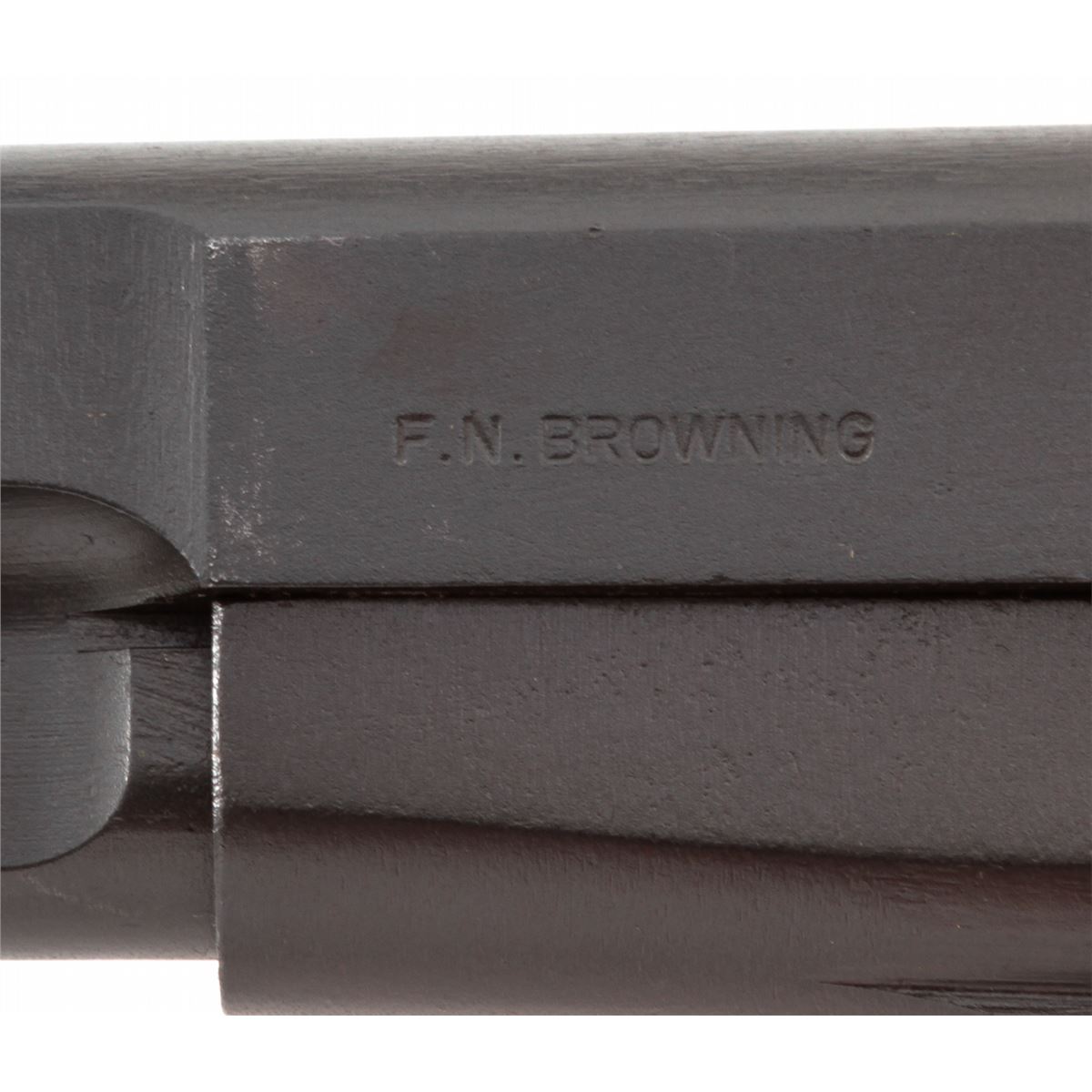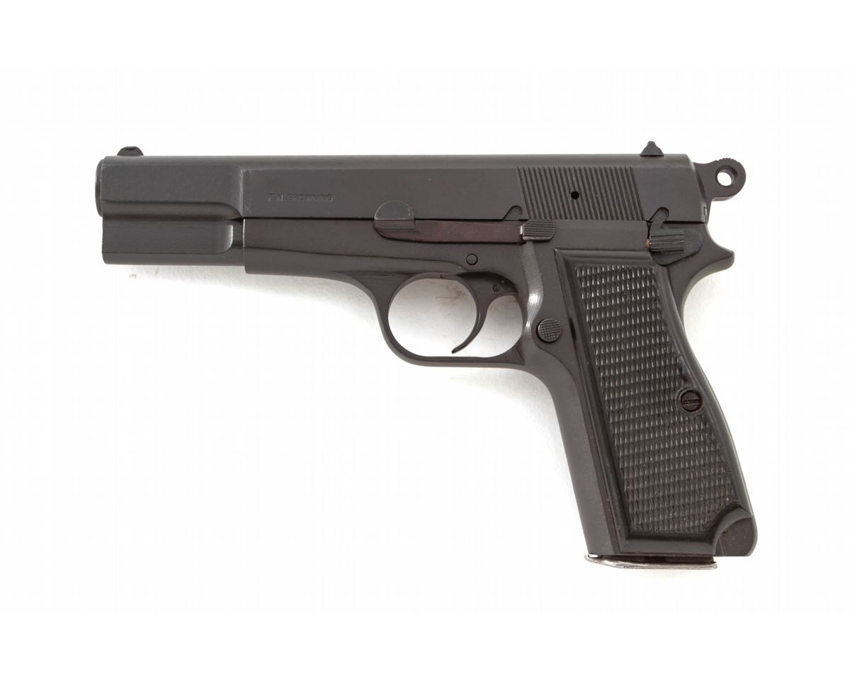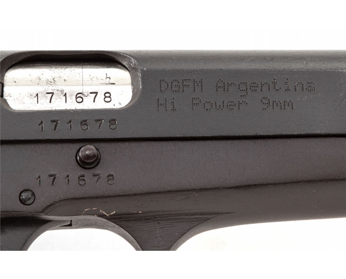 DGFM Argentine Hi-Power Semi-Automatic Pistol, #171678, 9mm, 4-3/4'' barrel, phosphate finish, black checkered plastic grips, with one high-capacity magazine. Left side of frame marked ''F.N. Browning''; right side importer marked ''DGFM Argentina/Hi-Power 9mm''. Condition is excellent as arsenal refinished, retaining approx. 96% parkerized finish. Front sight is lightly marred; ''C.A.I.'' import markings to right side of slide. Grips with moderate flattening. Good action and bore. Est.: $400-$600. (C&R)