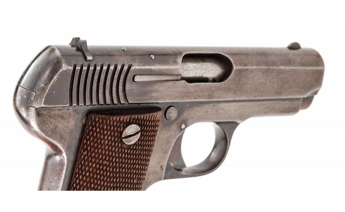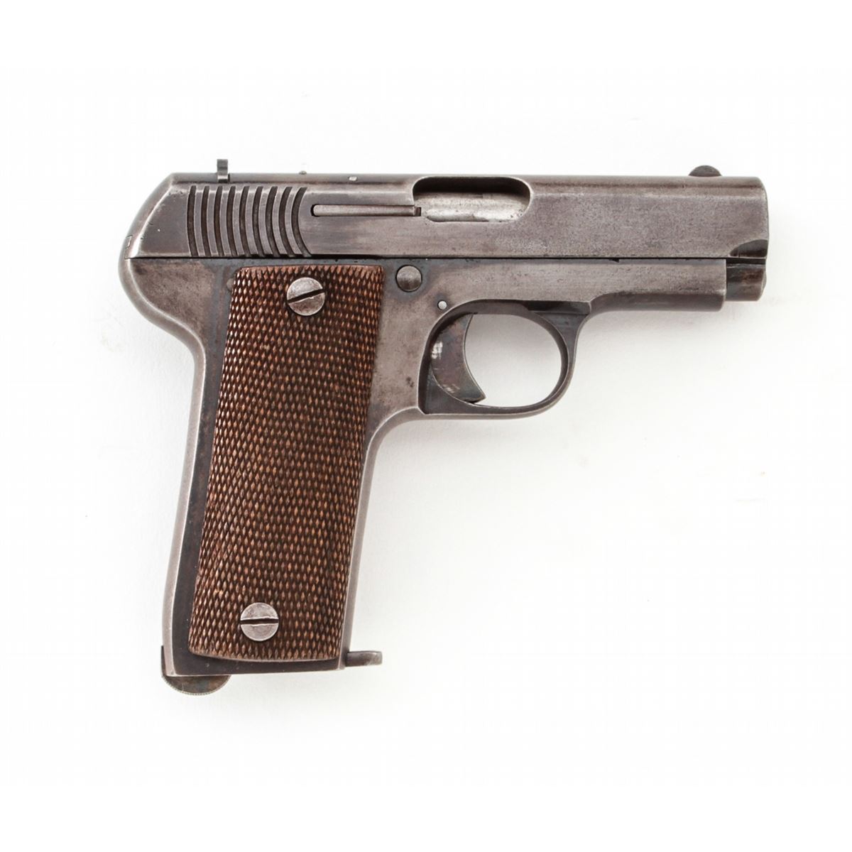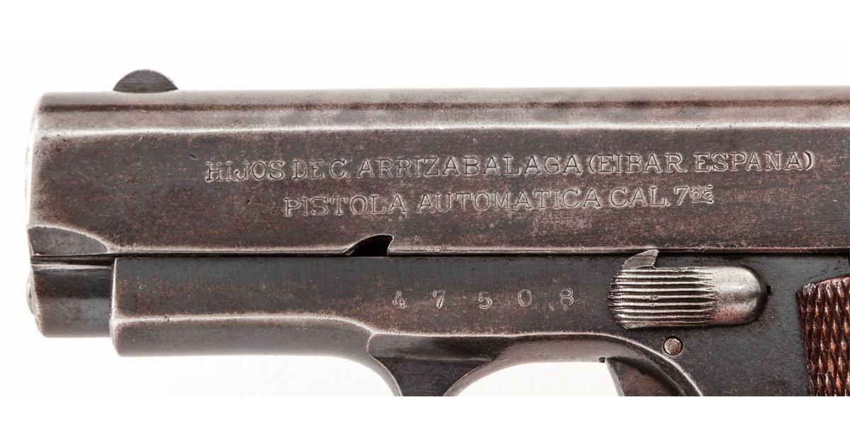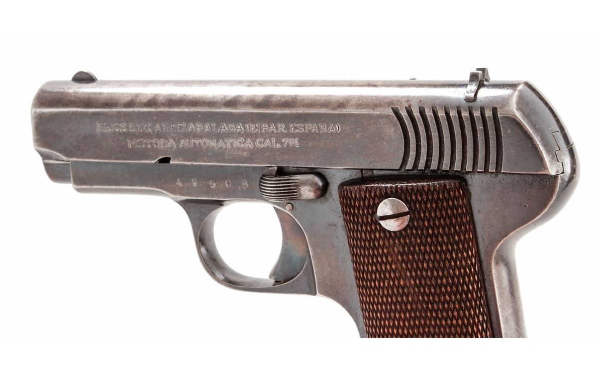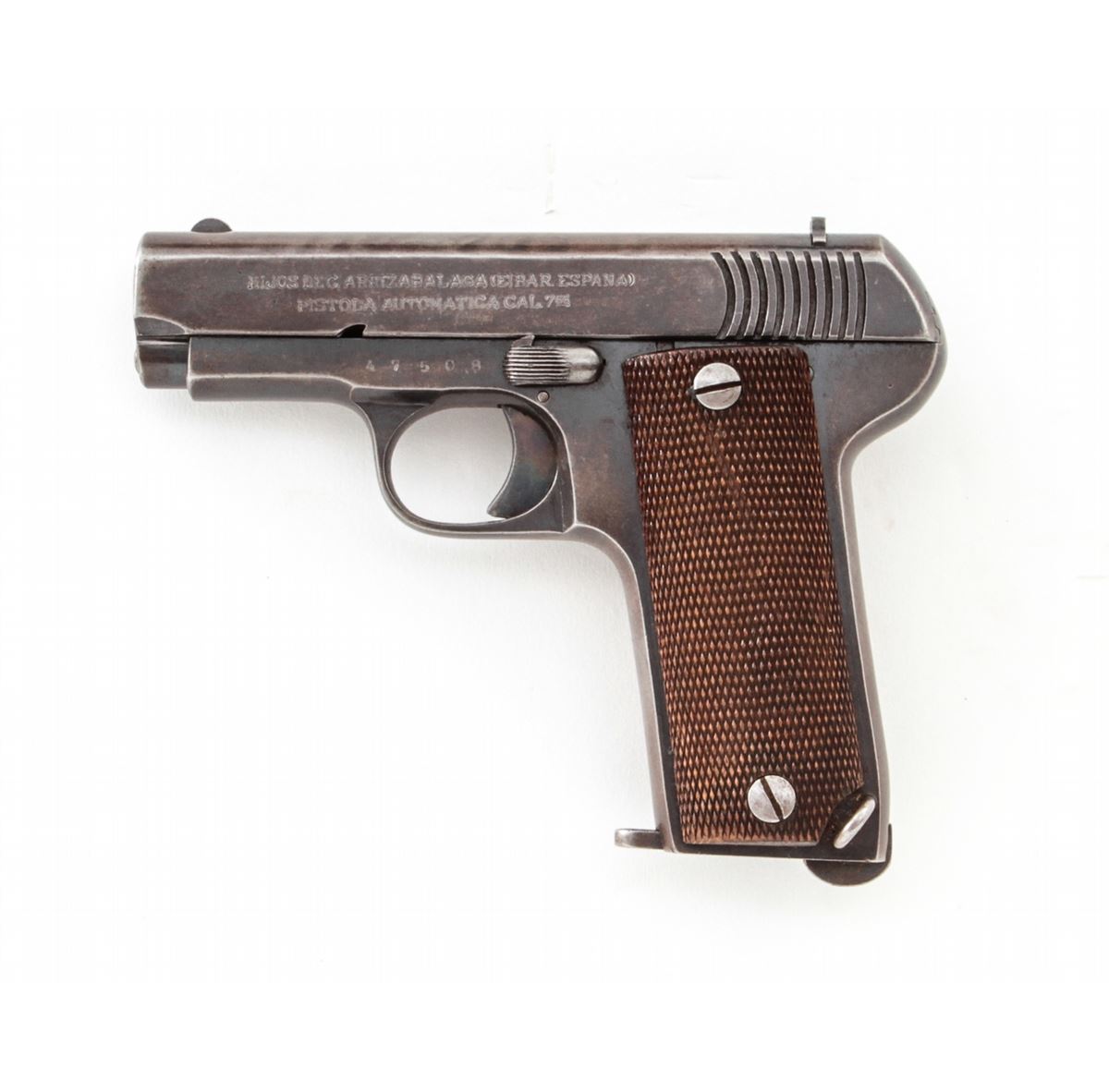 Spanish Semi-Automatic Pistol, by Hijos de C. Arrizabalaga (Eibar), #47508, .32 Auto cal., 3-1/2'' barrel, blue finish, factory checkered walnut grips, with one magazine. Condition is very good retaining approx. 80% thinning grips. Grips with light flattening and minor losses. Good action and bore. Est.: $200-$400. (C&R/PPT)
