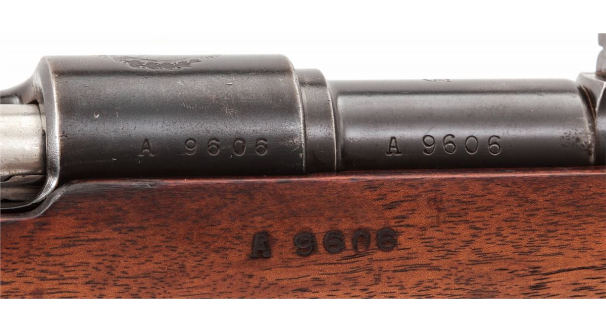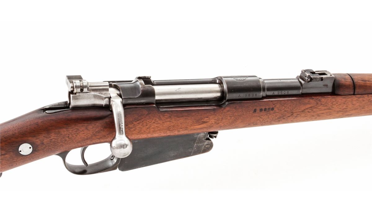 Antique Argentine Model 1891 Bolt Action Carbine, by Loewe, #A9606 7.65x53mm, 18'' barrel, arsenal blue finish, matching numbered walnut stock. Condition is near fine with good crest, nice markings, matching numbered bolt, stock and magazine housing. Good action and bore. Est.: $250-$400. (Antique)