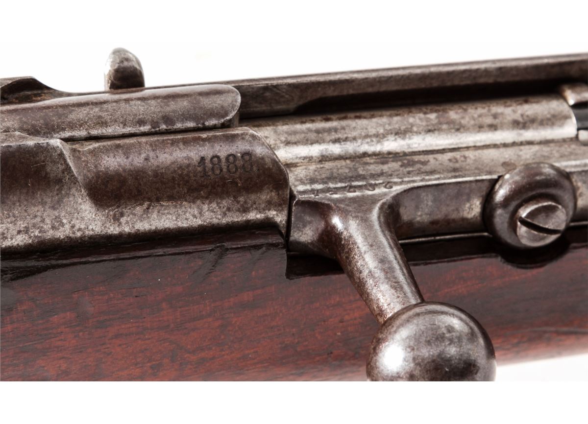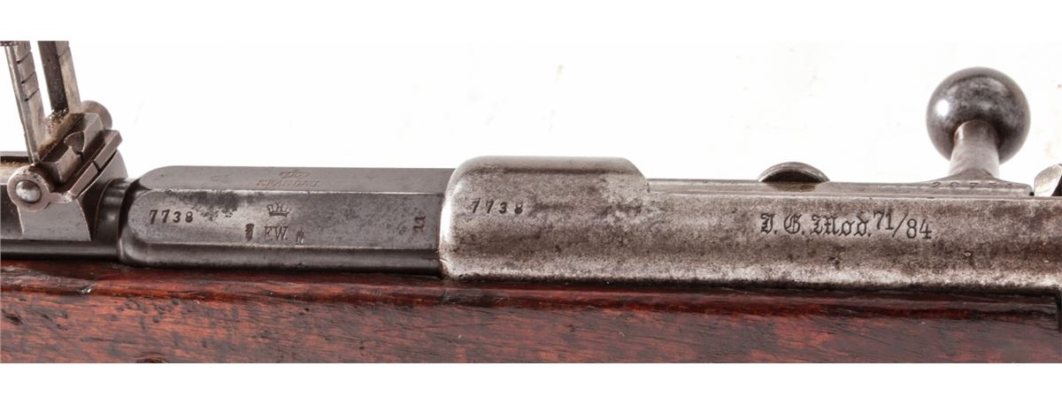 Mauser Model 71/84 Bolt Action Rifle, by Spandau, #7738, 11x60Rmm, 32'' barrel, blue and case hardened finish, cartouched walnut stock. Condition is good to very good retaining approx. 60% blue to barrel; receiver has toned silvery gray. Stock with moderate scuffs and scratches. Mismatched small parts. Good action, bright bore. Est.: $300-$500. (Antique)