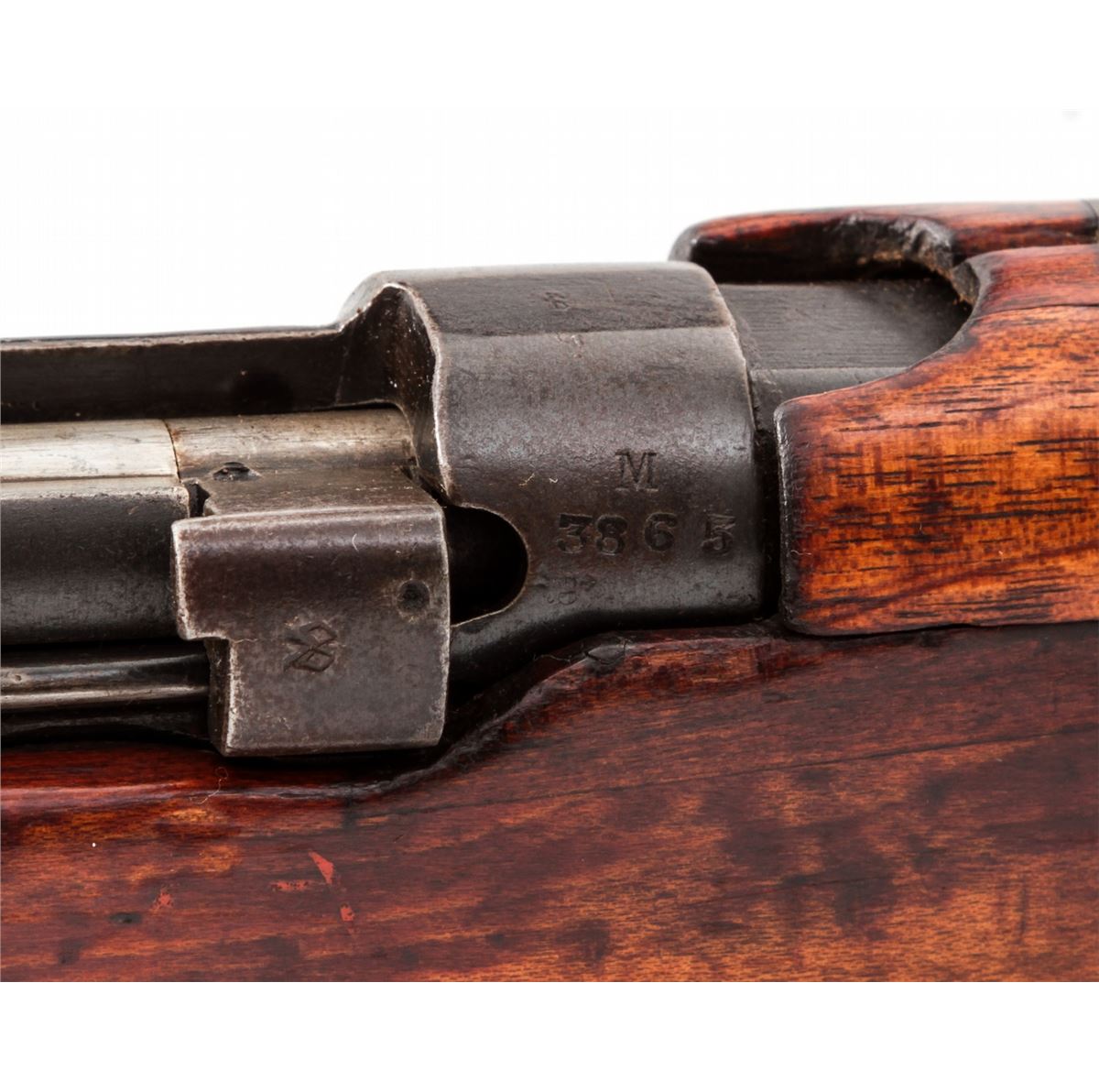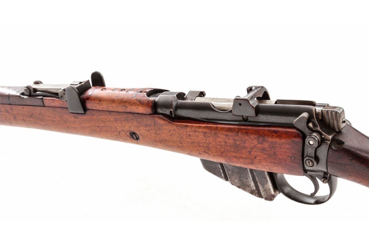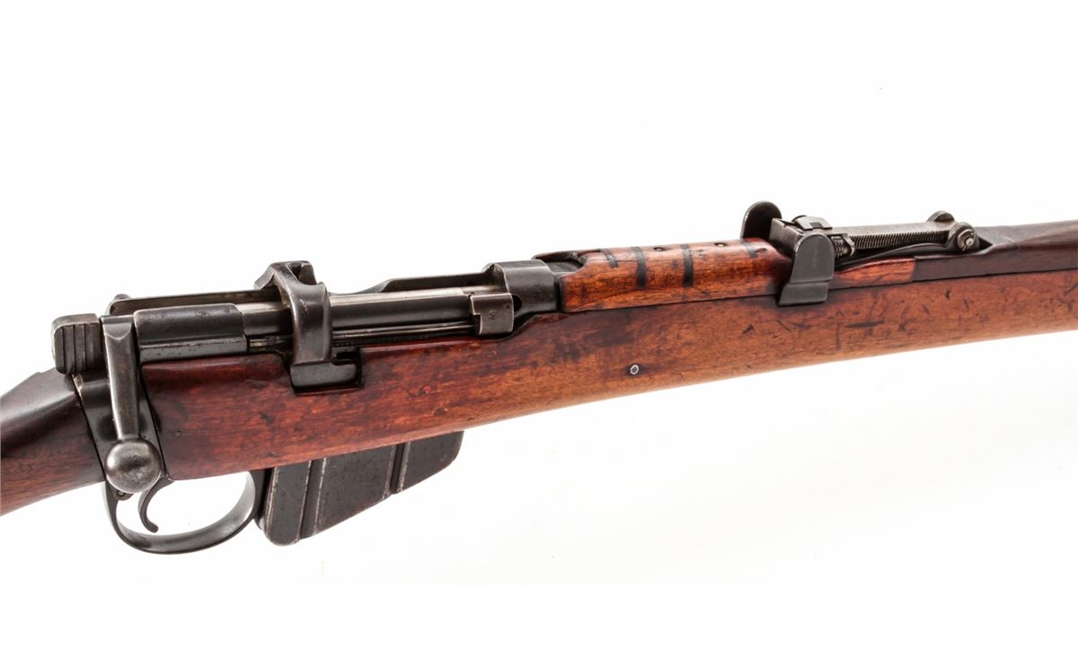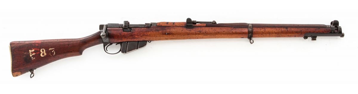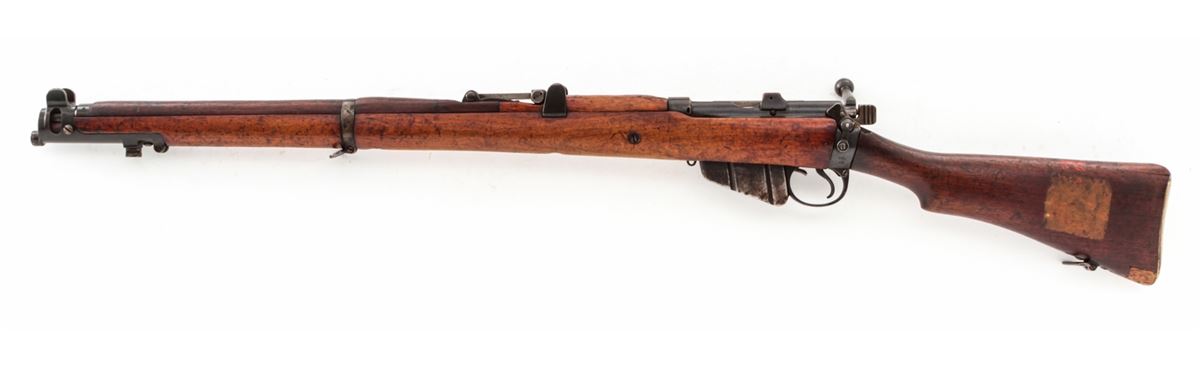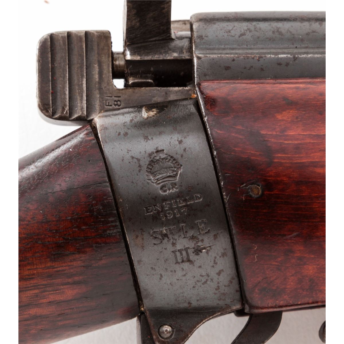 British SMLE No. 1 MK III* Bolt Action Rifle, by Enfield (1917), #M3865, .303 cal., 25'' barrel, blue finish, walnut stock and handguard. Condition is very good retaining approx. 85% arsenal blue. Stock with moderate scuffs and scratches and repairs to upper handguard. ID disc plugged, with repairs to toe of buttstock. No visible import marks. Good action, very good bore. Est.: $200-$400. (C&R)