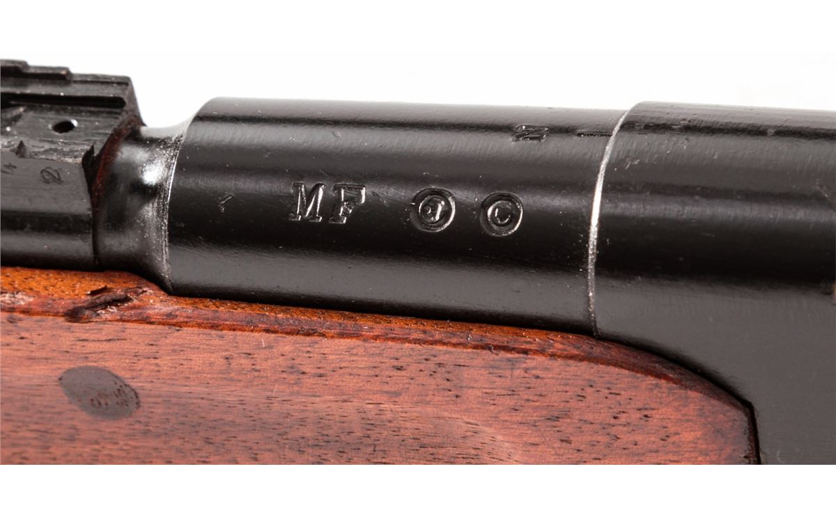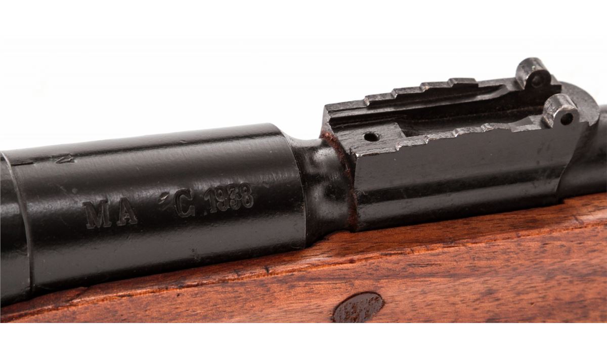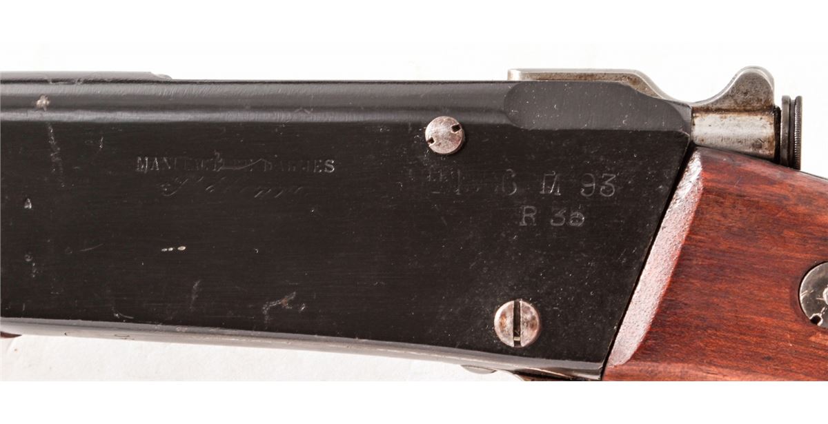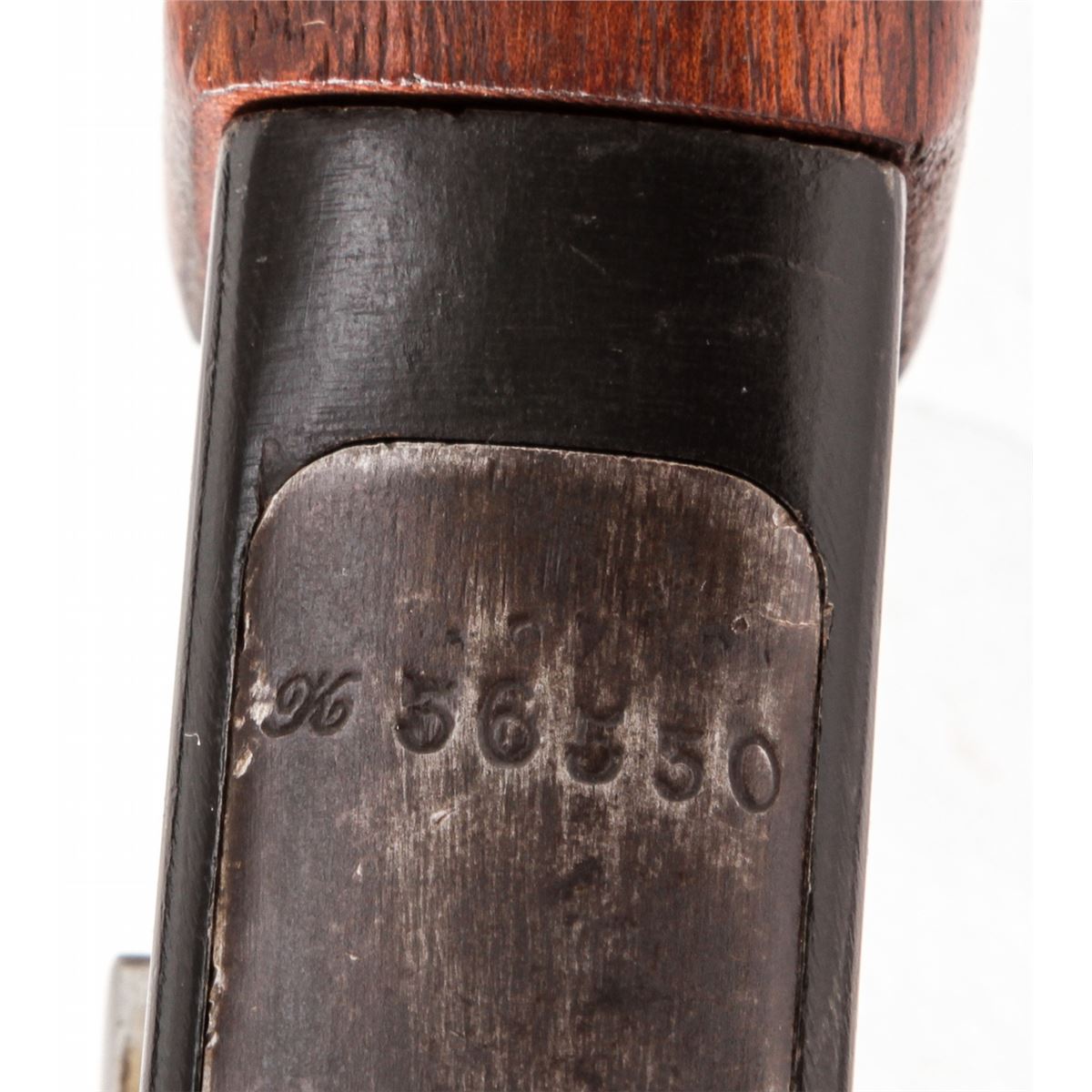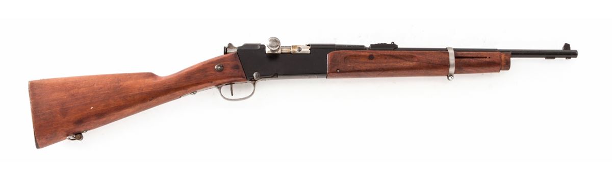 Lebel Model 1886/M93/R35 Bolt Action Carbine, by St. Etienne, #K56550, 8mm Lebel cal., 19'' barrel, stove black finish, walnut stock and handguard. Condition is good retaining approx. 92% arsenal black. Stock with light scuffs. Missing forend cap and two band retainers. Rear band has been cleaned bright with non-original band screw. Action is crisp, bore is very good. Est.: $150-$300. (Antique)
