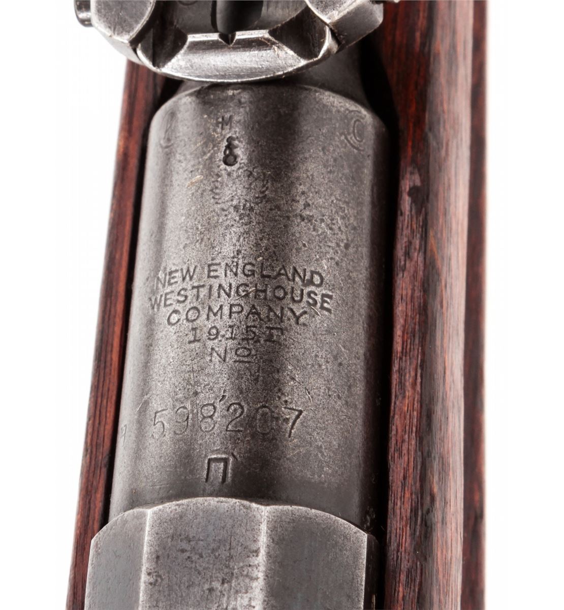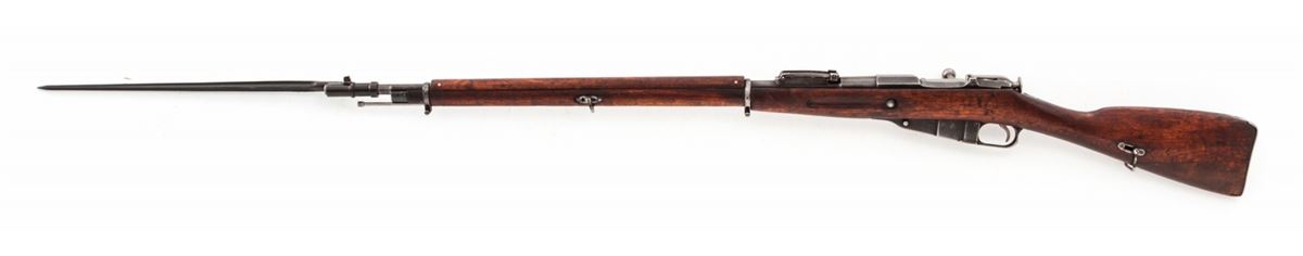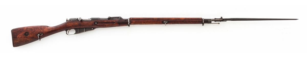 Mosin-Nagant Model 1891 Bolt Action Rifle, by Westinghouse (1915), #598207, 7.62x54R cal., 32'' barrel, blue finish, Finnish stock, with some mismatched parts, and spike bayonet. Condition is very good as lightly import marked, retaining approx. 75% thinning blue. Stock and action are good, bore is fair. Est.: $200-$400. (C&R)