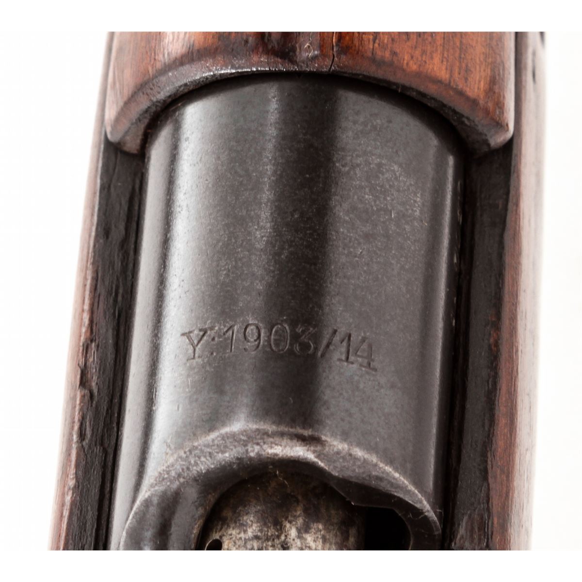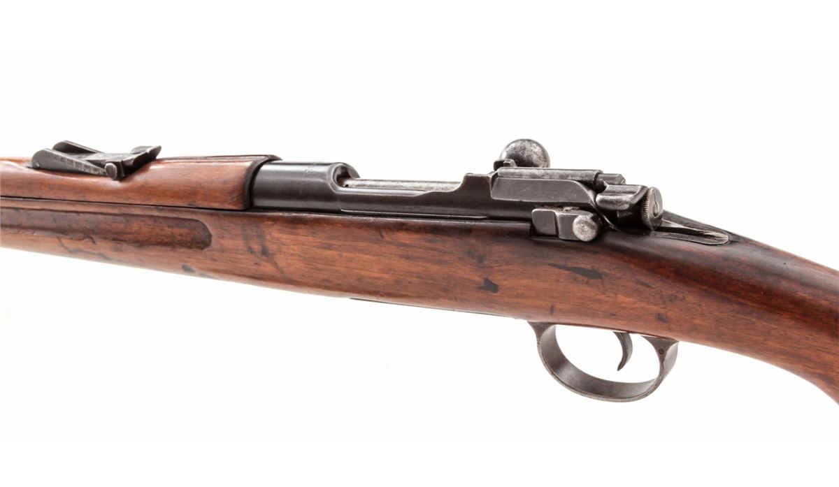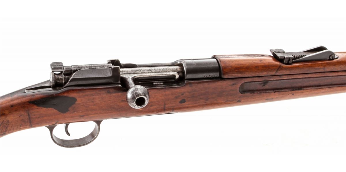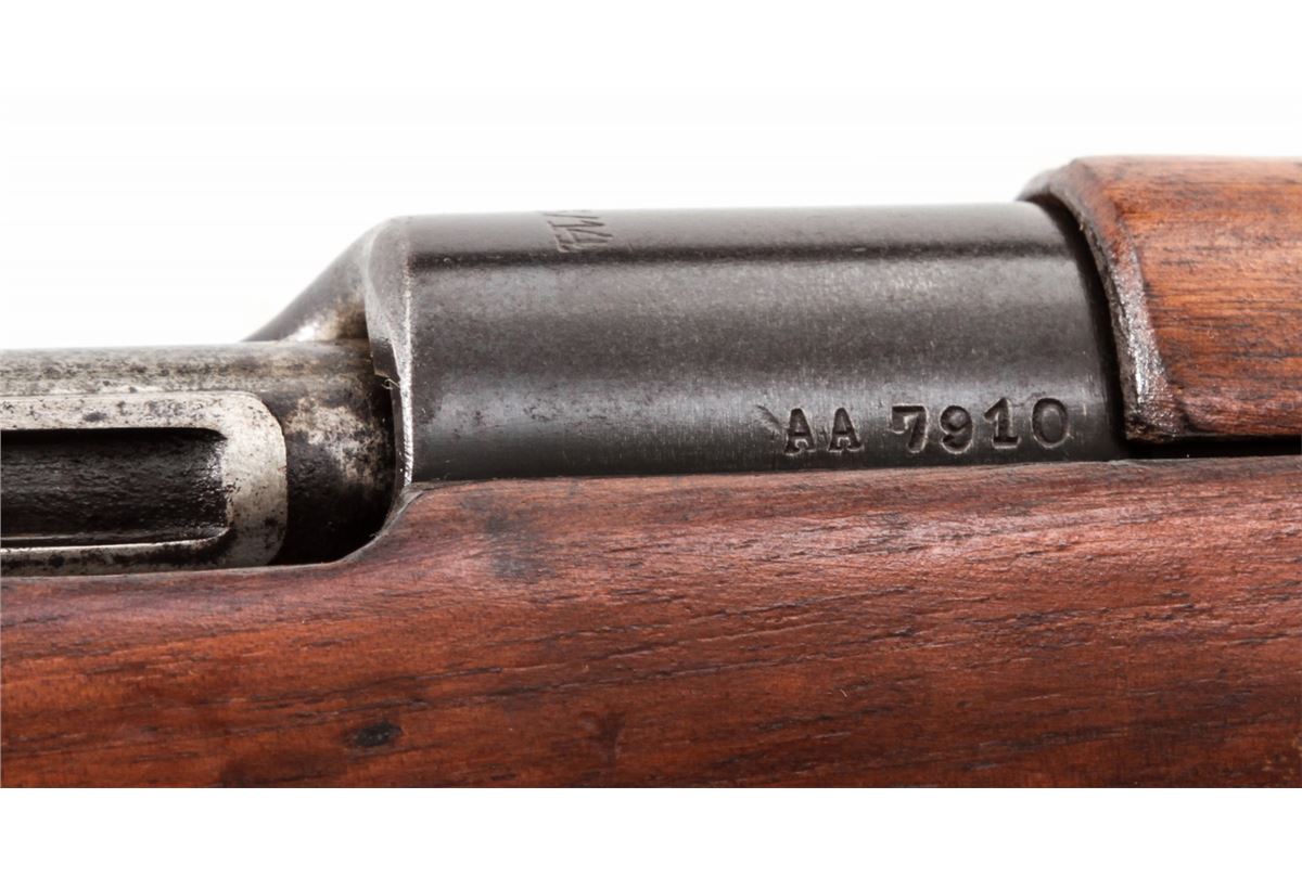 Greek Y1903/14 Mannlicher-Schoenaur Bolt Action Rifle, by Steyr, #AA7910, 6.5x53mm, 29'' barrel, blue finish, walnut stock. Condition is good without import marks and mixed numbers. Approx. 85% arsenal blue. Moderate to heavy carbon spotting to bolt. Scuffs, scratches and filler to stock. Good action, dark bore. Scarce in unmodified condition. Est.: $200-$400. (C&R)