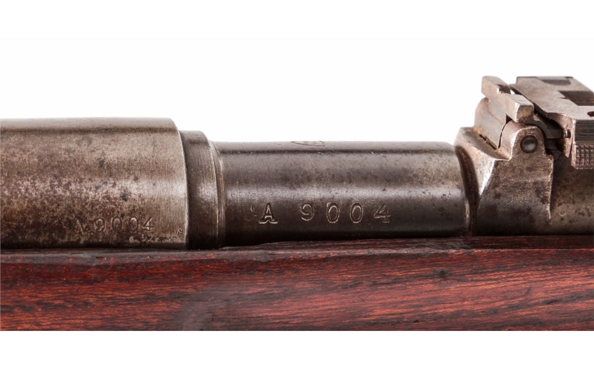 Argentine Model 1891 Bolt Action Rifle, #A9004, 7.63x53 Arg. cal., 29'' barrel, blue finish, walnut stock. Condition is good retaining approx. 75%-80% blue. Stock with sanding. Missing barrel bands, magazine spring and follower. Good action, bore is fair and should clean. Est.: $75-$150. (Antique)
