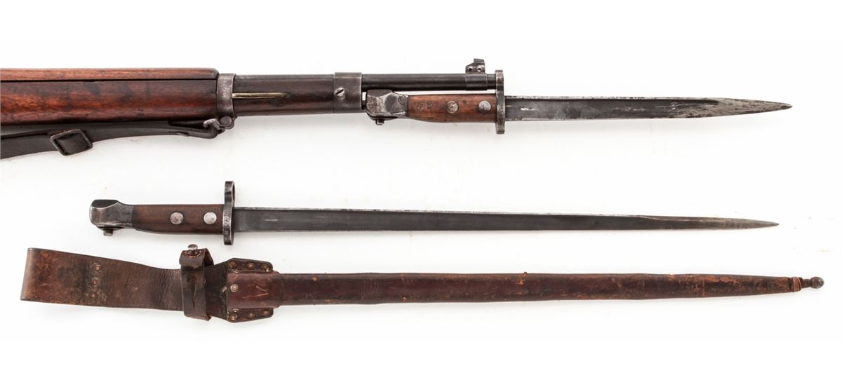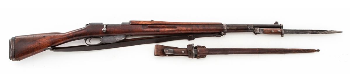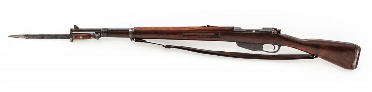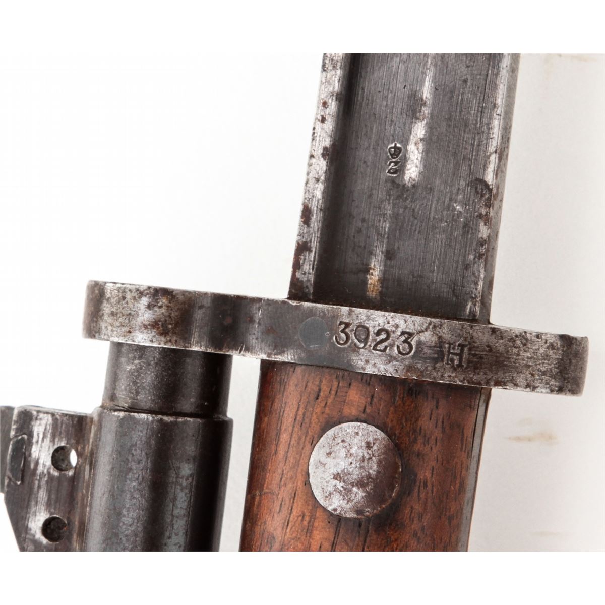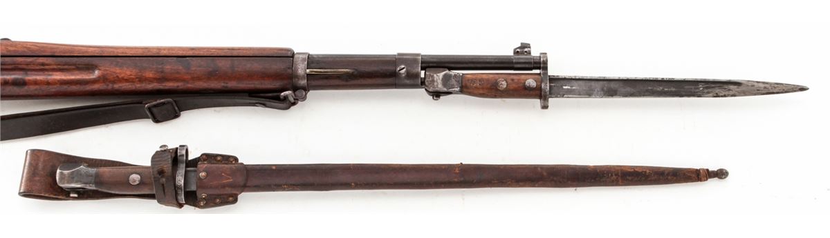 Dutch Model 1895 Bolt Action Carbine, #4-003711, .303 Brit. cal., 26'' barrel, blue finish, European walnut stock with leather sling, with one long and one short bayonet included (no scabbard for short bayonet). Condition is very good as lightly import marked, having been converted to .303 in 1954. Approx. 90% arsenal refinished parts, with pitting beneath finish to triggerguard area. Stock with even general wear and Jungle Carbine style buttplate. Action is good, bore is fair. Est.: $200-$400. (C&R)