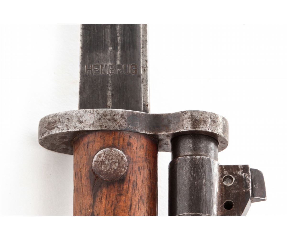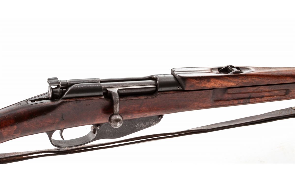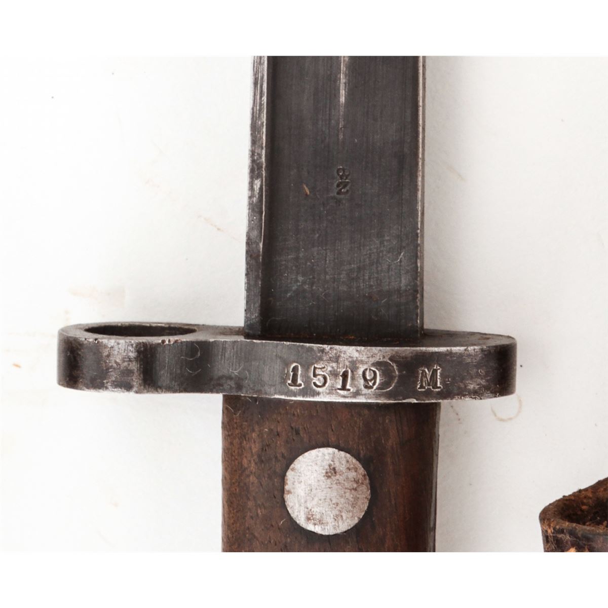 Dutch Model 1895 Bolt Action Carbine, #4-003711, .303 Brit. cal., 26'' barrel, blue finish, European walnut stock with leather sling, with one long and one short bayonet included (no scabbard for short bayonet). Condition is very good as lightly import marked, having been converted to .303 in 1954. Approx. 90% arsenal refinished parts, with pitting beneath finish to triggerguard area. Stock with even general wear and Jungle Carbine style buttplate. Action is good, bore is fair. Est.: $200-$400. (C&R)