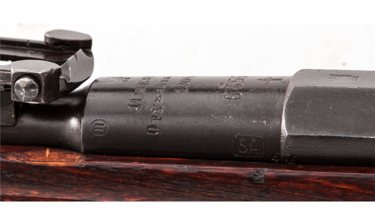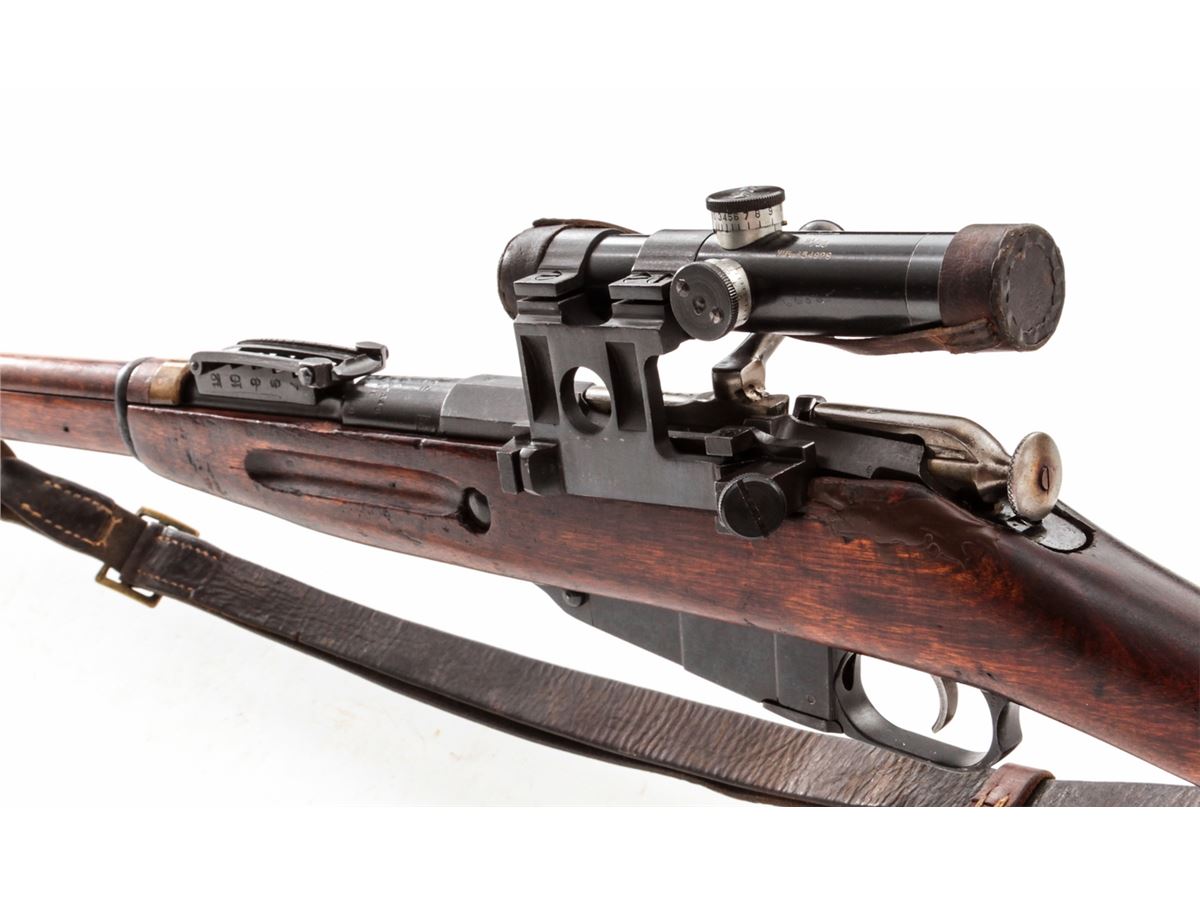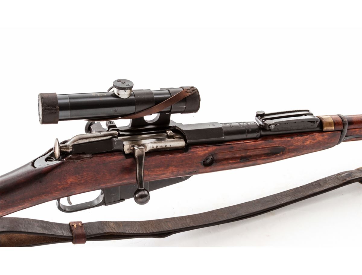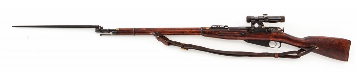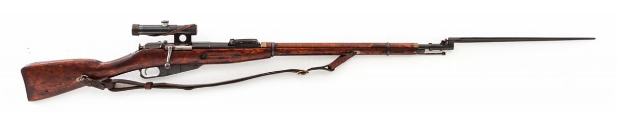 Russian Model 1891/30 Bolt Action Rifle, with 3.5-power sniper scope, #66565, 7.62x54R cal., 29.7'' barrel, blue finish, beech stock, with sling and scope covers, and spike bayonet. Originally built in 1904, with Finnish SA markings to breech. Scope and mount with electro-pencil matching numbers. Condition is good as imported with force-matched numbers. Repair to left side of stock near bolt. Good action and bore. Clear scope optics. Est.: $600-$900. (C&R)