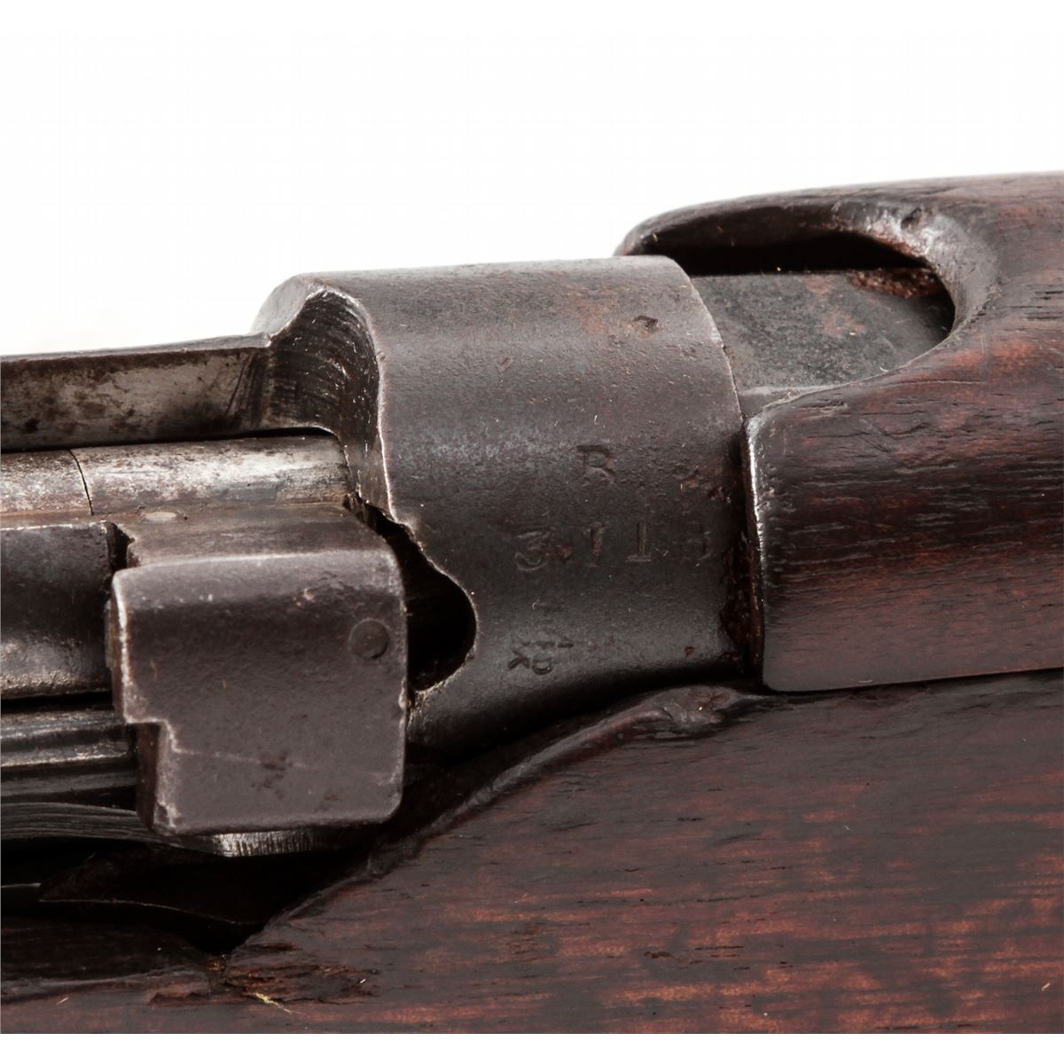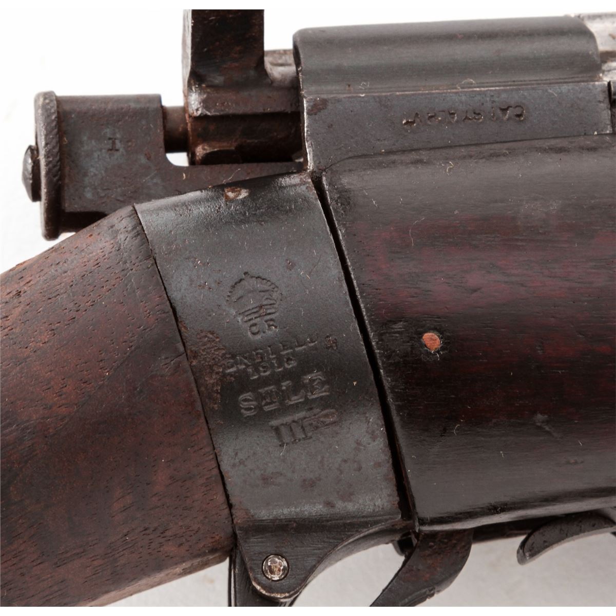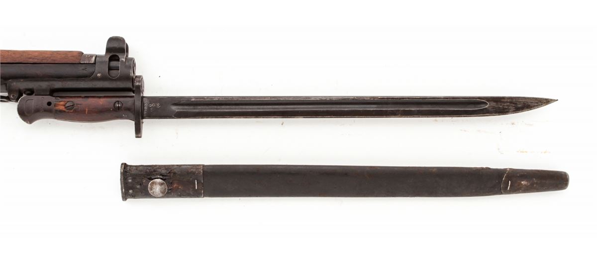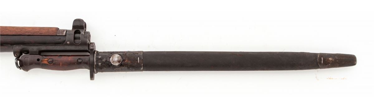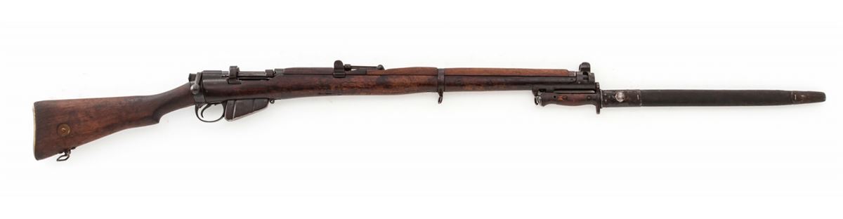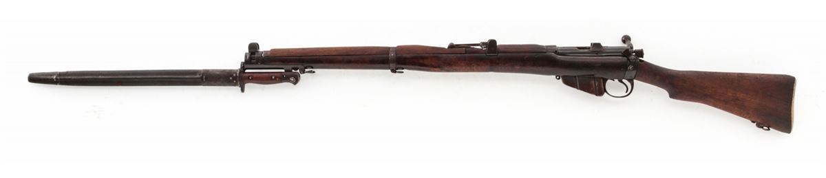 British SMLE No. 1 MK III* Bolt Action Rifle, by Enfield (1918), #R3118, .303 cal., 25'' barrel, arsenal blue finish, walnut stock and handguard, with bayonet and scabbard. Condition is very good as lightly import marked to back of receiver. Metal surfaces retain approx. 85% arsenal blue. Mismatched bolt. Stock with moderate scuffs and bruises and oil darkening. Good action and bore. Est.: $200-$400. (C&R)