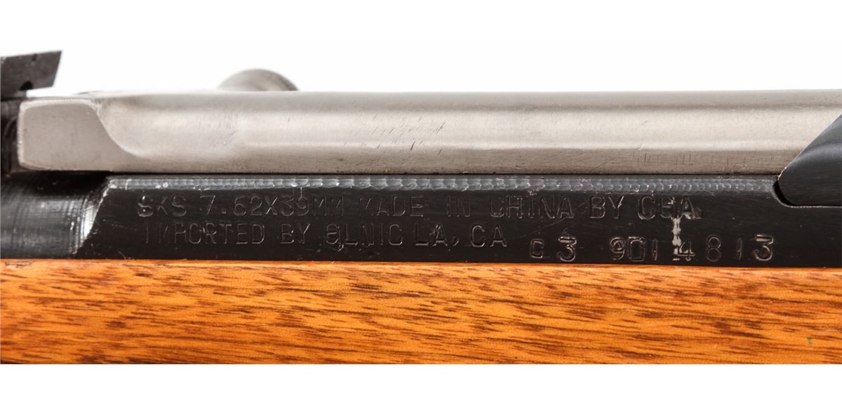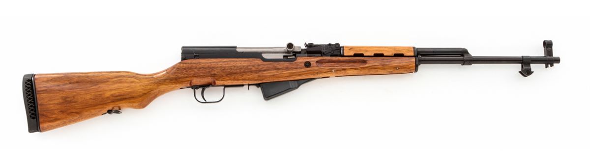 Chinese SKS Semi-Automatic Rifle, #C39014813, 7.62x39mm, 20'' barrel, blue finish, Asian hardwood stock, with rubber butt pad over original steel buttplate. Condition is excellent. Folding bayonet has been removed. Shows light marks from handling. Good action, mirror bright bore. Est.: $300-$500. (Modern)