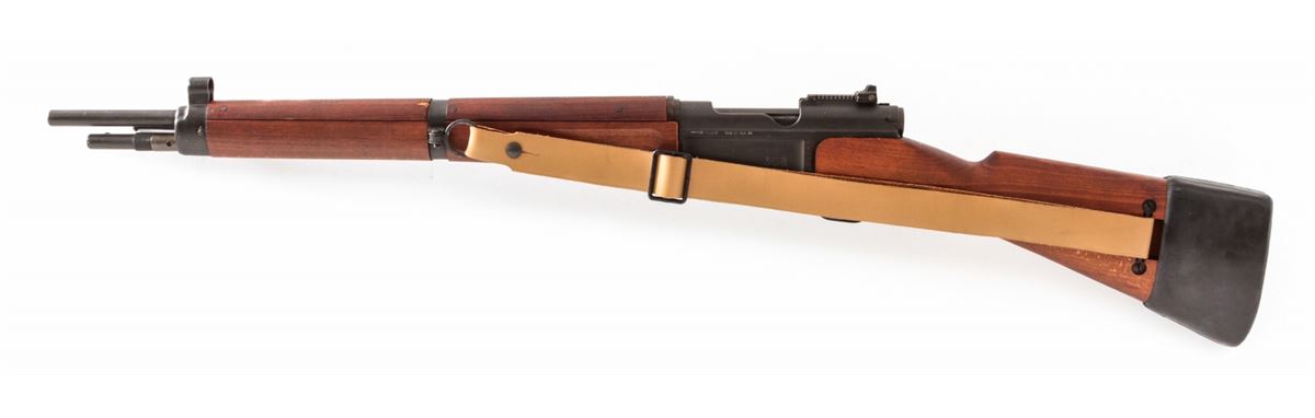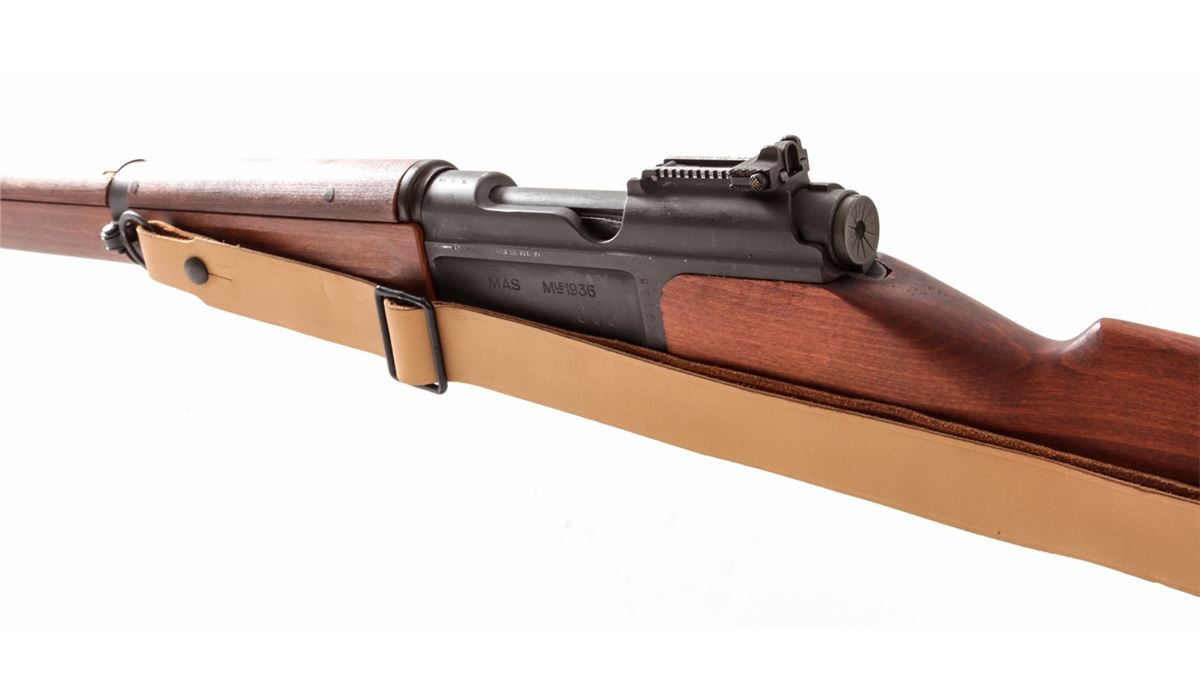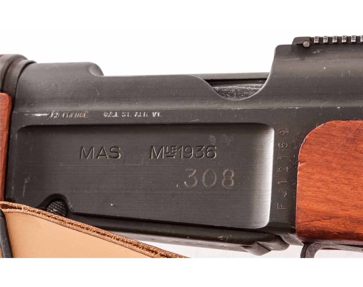 French MAS Model 1936 Bolt Action Rifle, #FJ12159, .308 cal., 22'' barrel, blue finish, French hardwood stock, forend and upper handguard, with tan leather sling and MAS 1951 rubber butt pad. Condition is excellent as converted to .308, with light importation marks to left side, slightly counter-bored muzzle, and small chip in upper forend. Est.: $250-$400. (C&R)