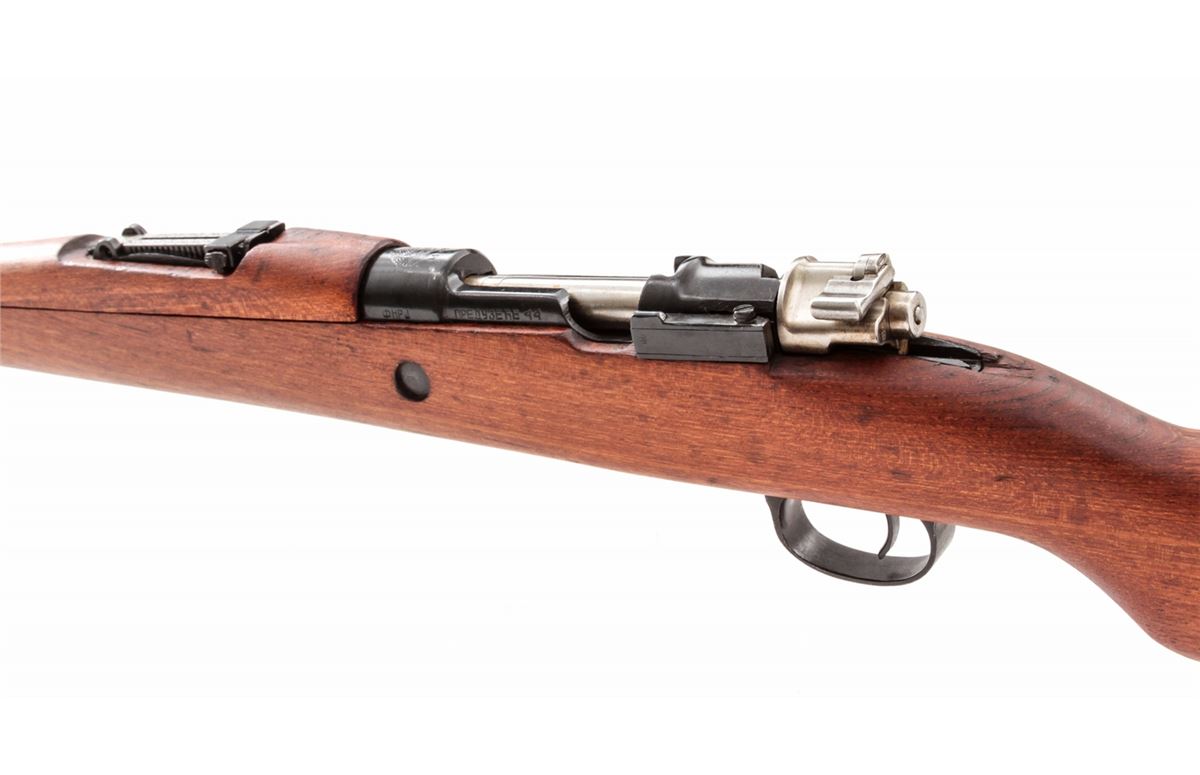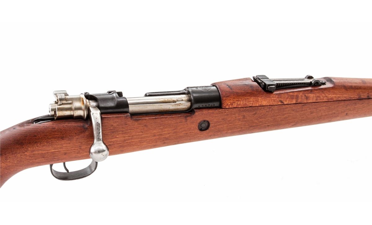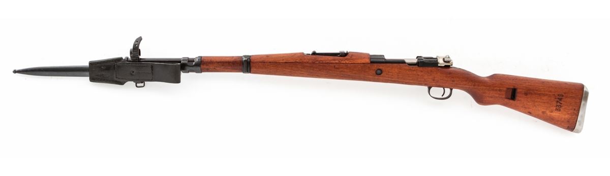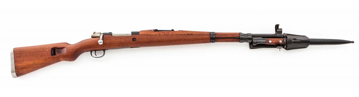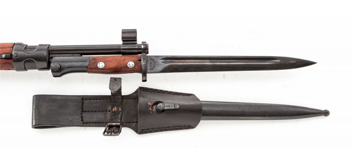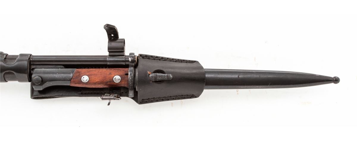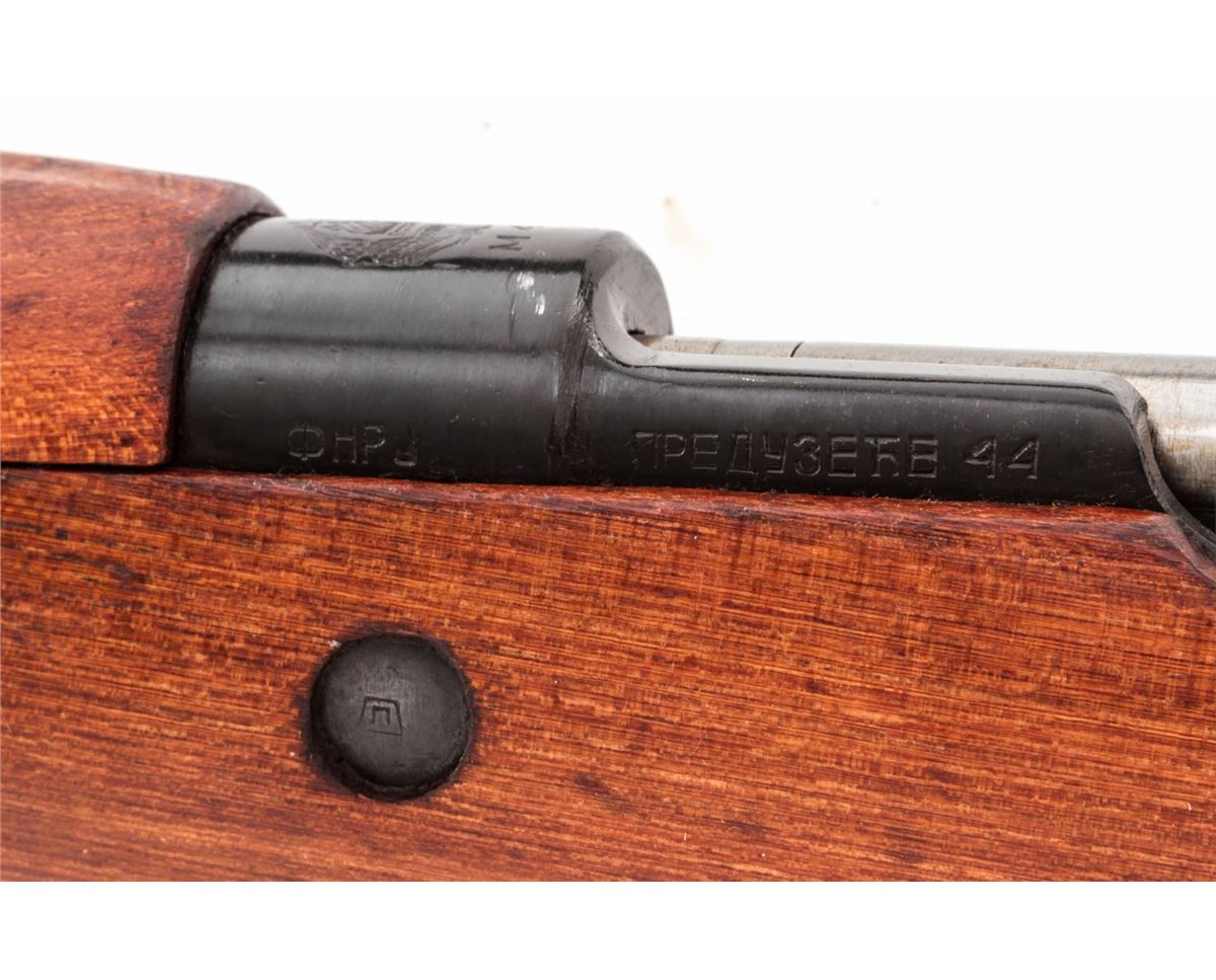 Yugo M48 Bolt Action Rifle, #K33749, 8mm, 23-1/2'' barrel, blue finish, beech stock, with bayonet and scabbard. Condition is excellent as lightly import mark. Stock shows only the lightest marks from handling. Good action, bright bore. All visible matching numbers. Original preservative needs to be cleaned from action. Est.: $250-$450. (C&R)