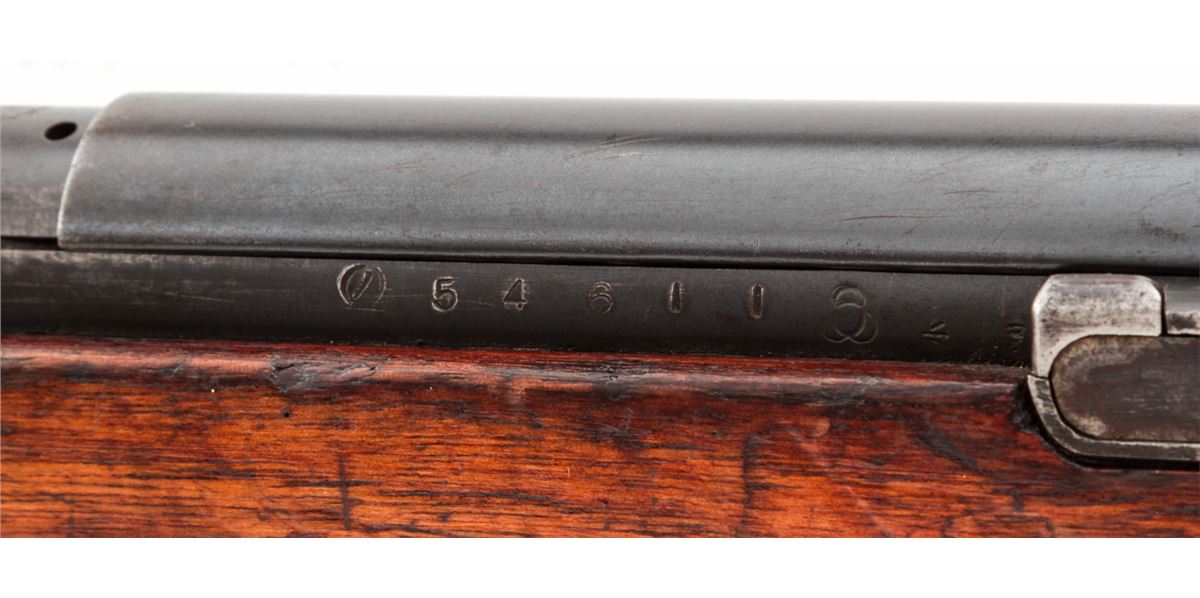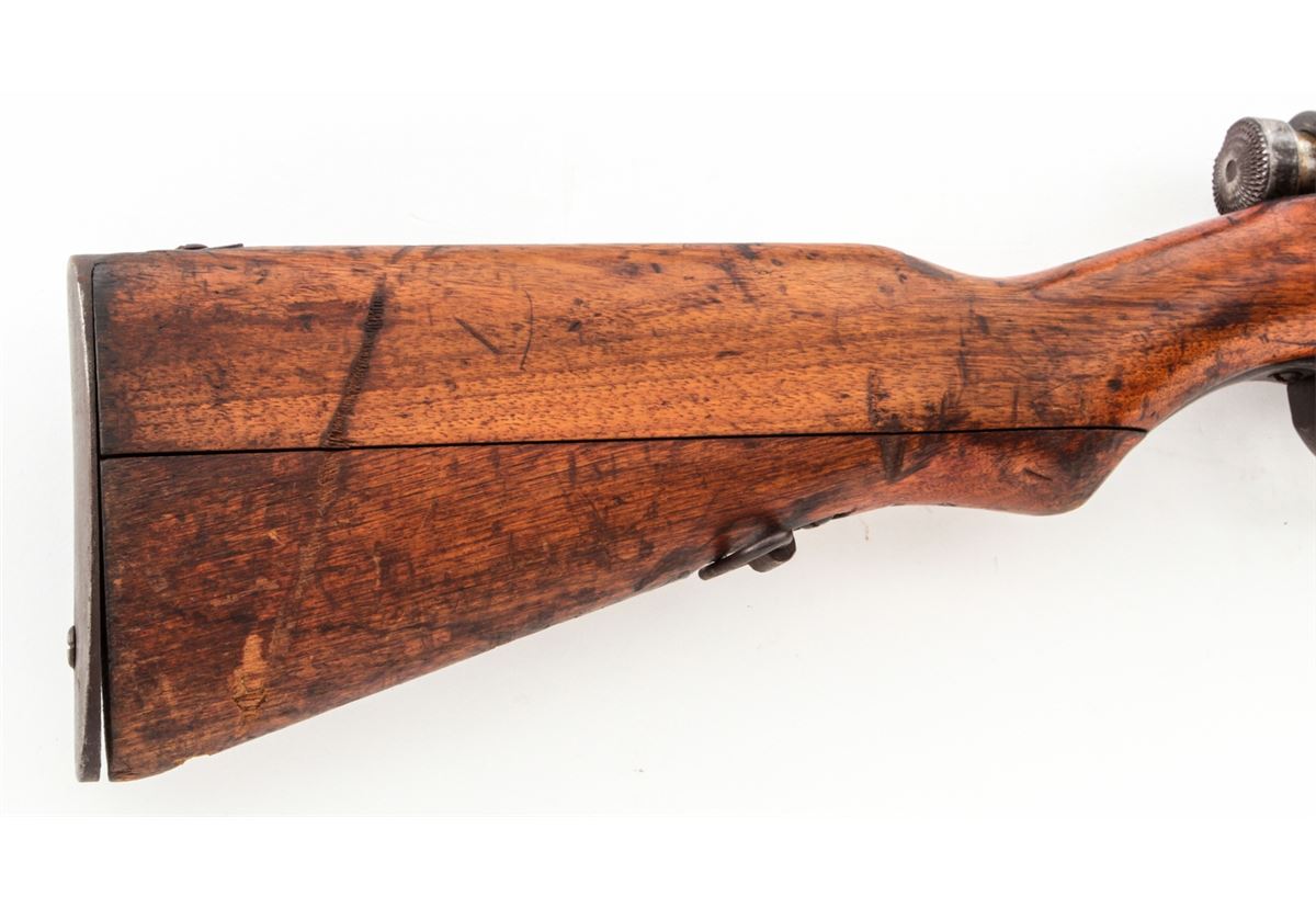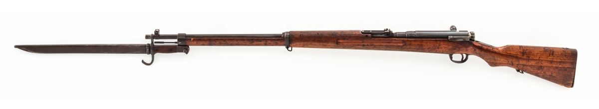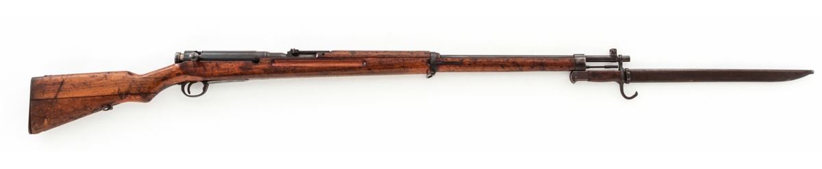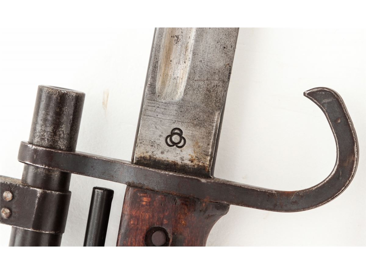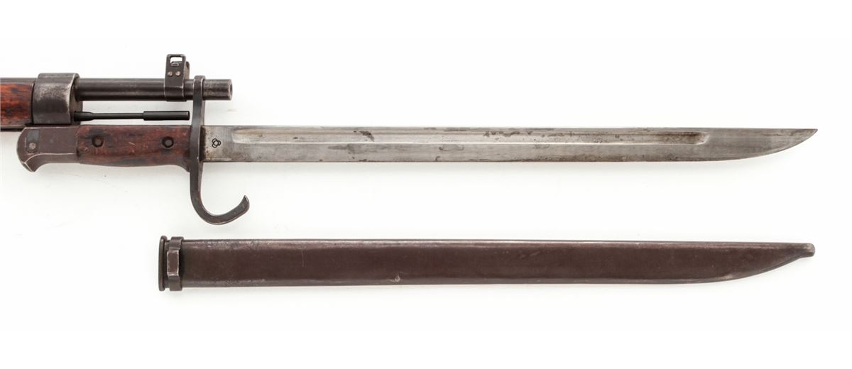 Japanese Arisaka Type 38 Bolt Action Rifle, by Tokyo Arsenal, #54611, 6.5mm, 31-1/2'' barrel, blue finish, non-matching dustcover, Asian hardwood stock, with Tokyo Arsenal marked bayonet and scabbard. Condition is good with unground mum. Blue surfaces retain approx. 75% evenly thinning blue. Stock with scuffs and bruises. Good action and bore. Cleaning rod may be a later addition. Est.: $200-$400. (C&R)