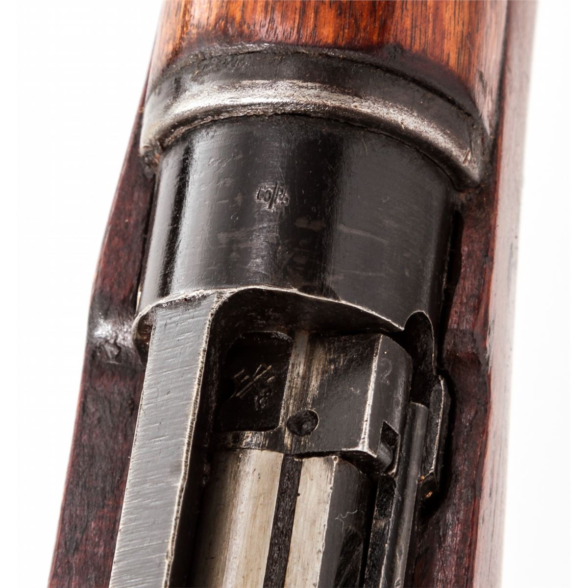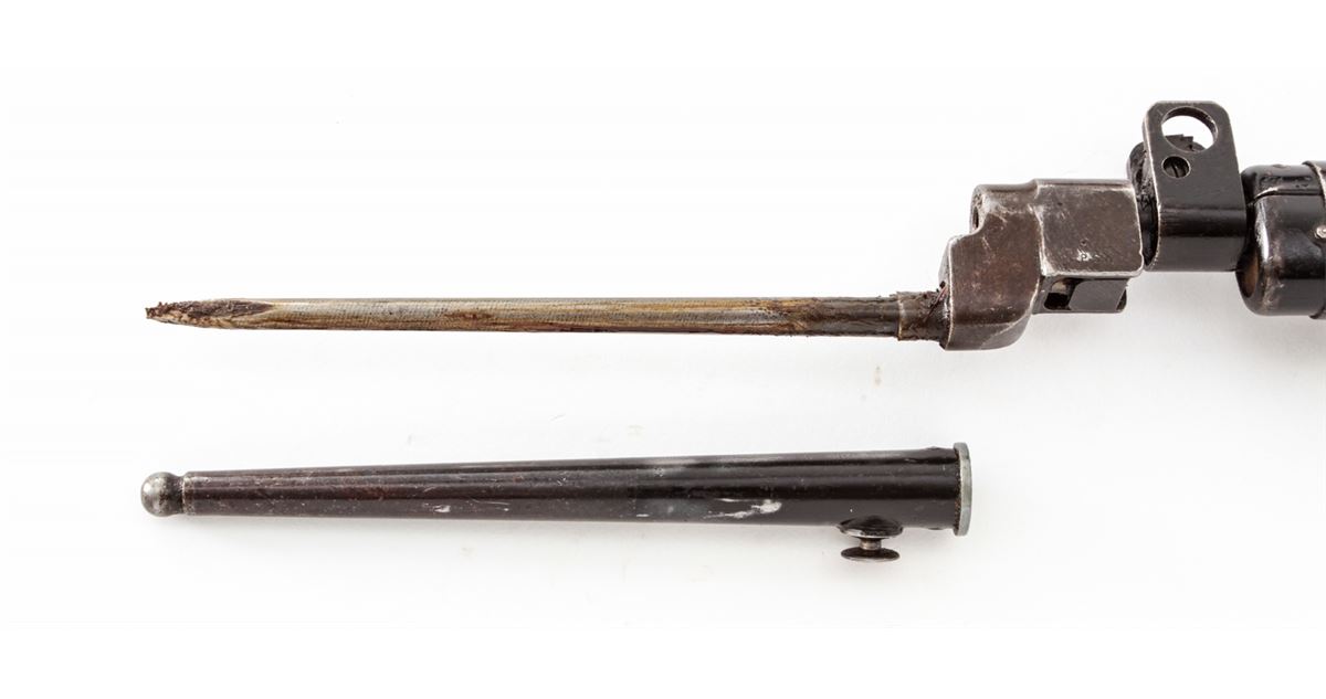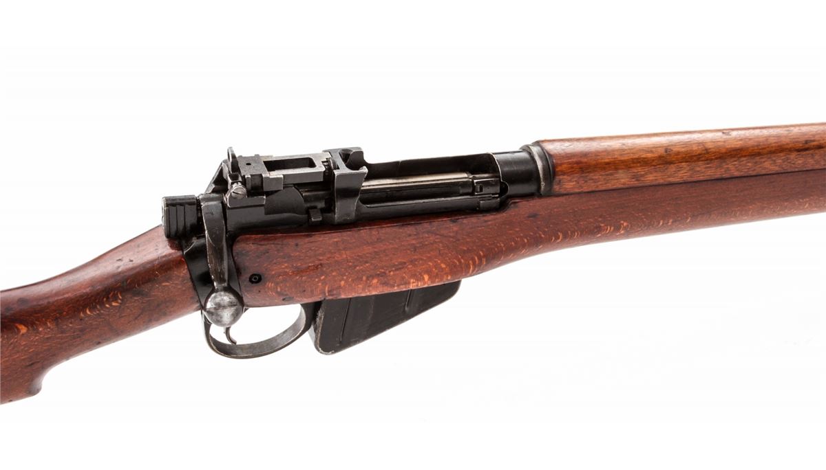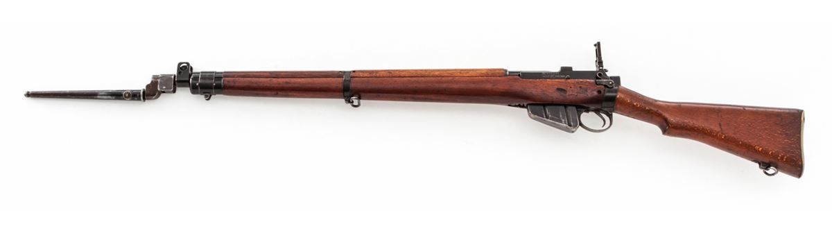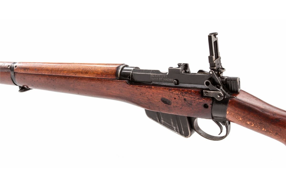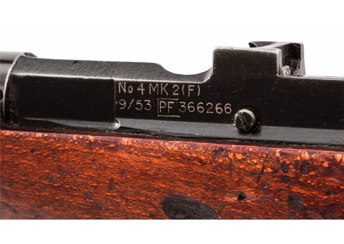 Lee-Enfield No. 4 MK II(F) Bolt Action Rifle (9/53), #PF366266, .303 cal., 25'' barrel, black finish, beech stock, with spike bayonet. Condition is very good to near fine retaining approx. 90% finish. Stock with light scuffs and scratches. Lightly import marked. Good action and bore. Est.: $200-$400. (C&R)