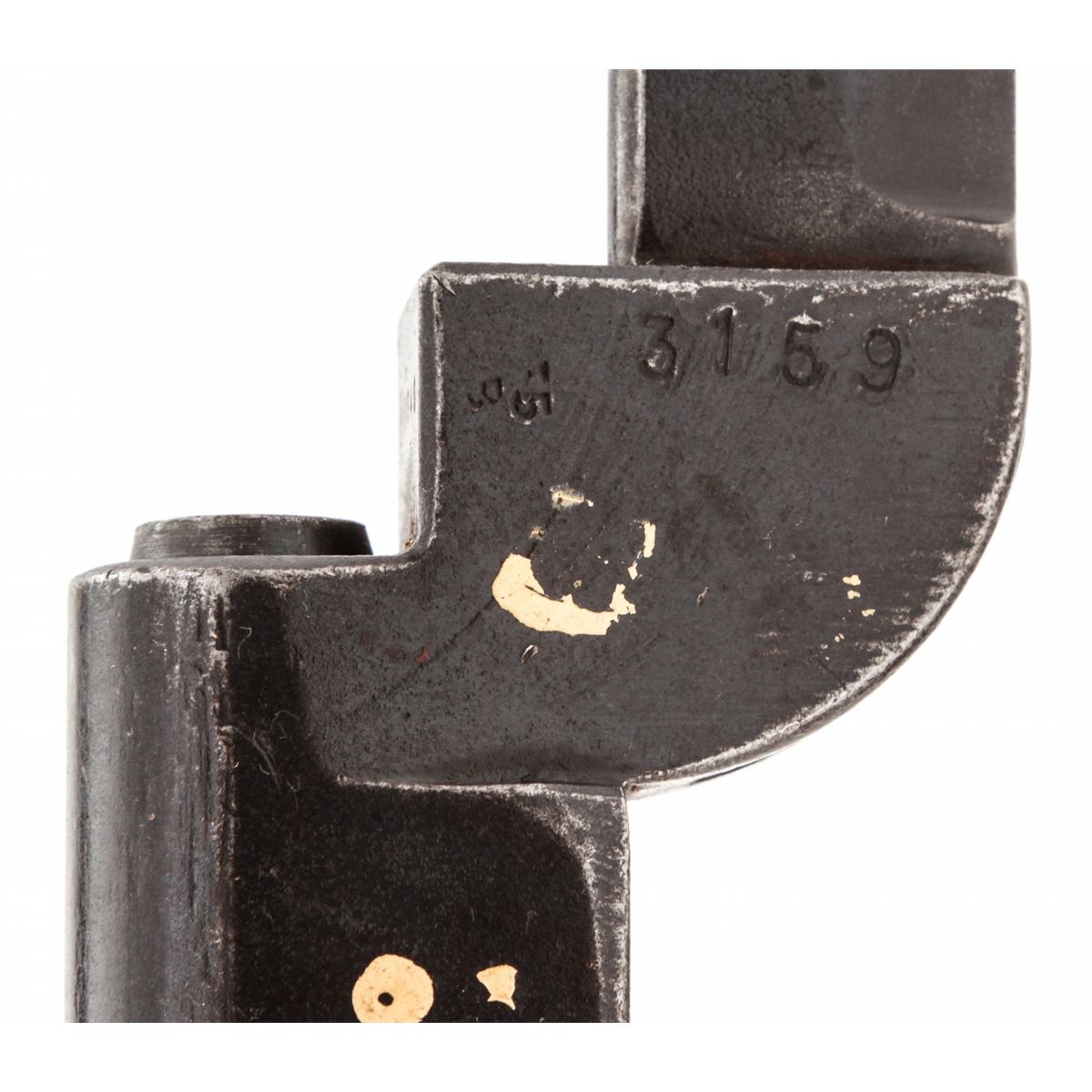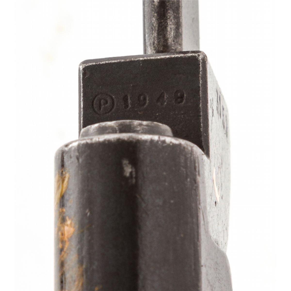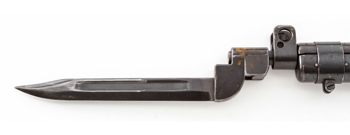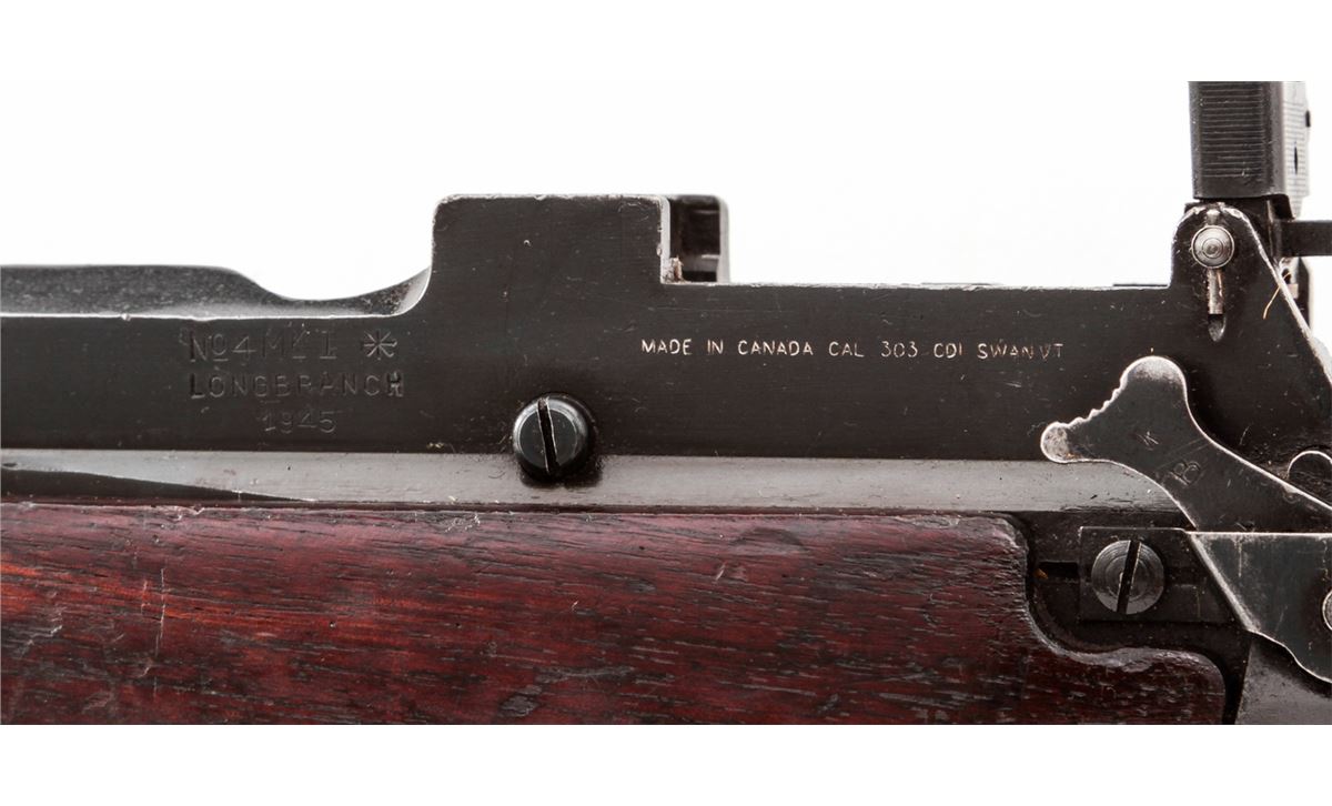 Canadian No. 4 MK I* Bolt Action Rifle, by Long Branch (1945), #B2L8724, .303 cal., 25'' barrel, arsenal blue finish, walnut stock and handguard, with socket blade bayonet. Condition is fine as lightly import marked to left side of frame beneath rear sight. Metal surfaces retain approx. 92% dull blue. Stock with oil darkening and light scuffs. Good action, very good bore with some frosting in the grooves. Est.: $300-$500. (C&R)