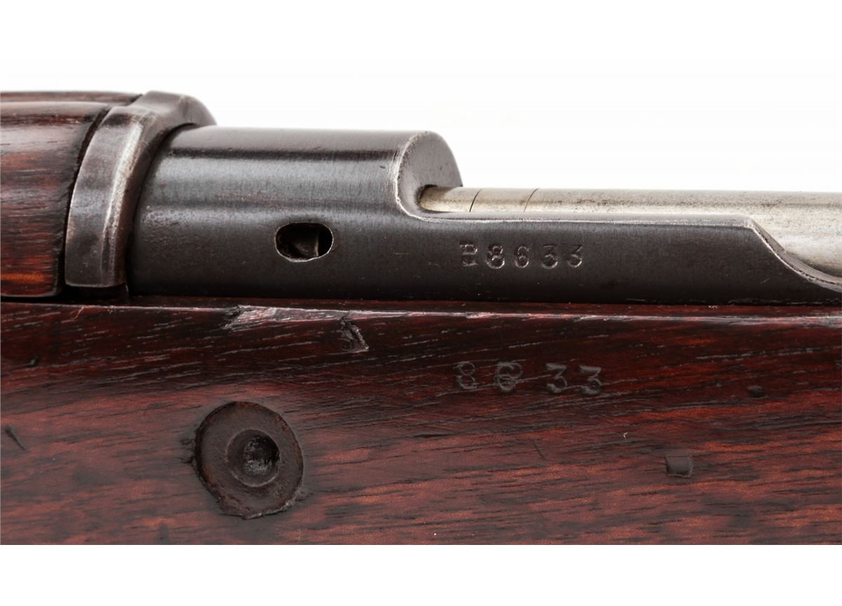 Spanish Model 1893 Short Bolt Action Rifle, #R8633, 7x57mm, 22'' barrel, blue finish, European walnut stock and upper handguard. Condition is fine as reworked during the Spanish Civil War and not showing importation markings. Matching numbered bolt and stock. Metal surfaces retain approx. 92% arsenal blue. Stock with light to moderate dings and impressions. Good action and bore. Est.: $250-$450. (C&R)